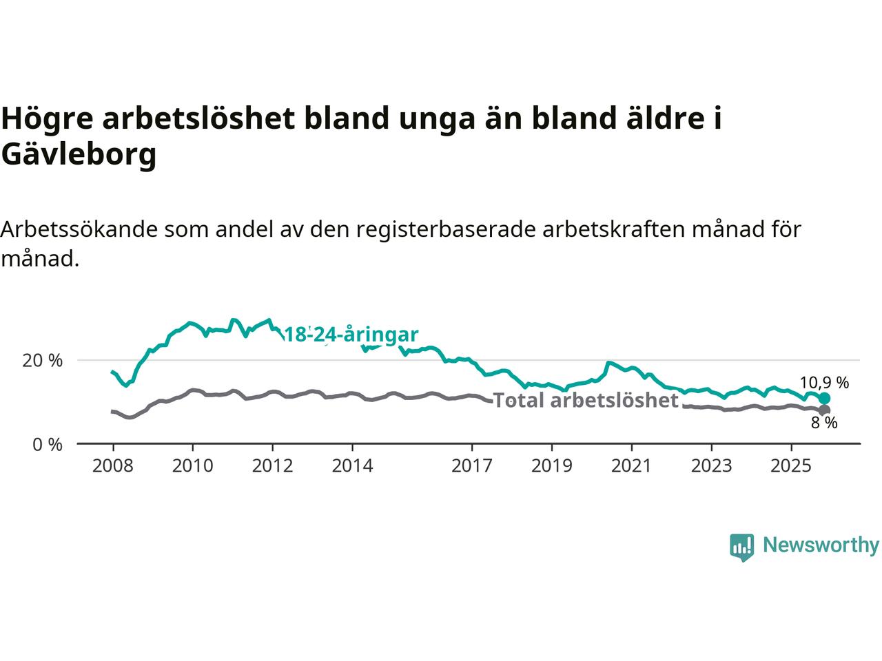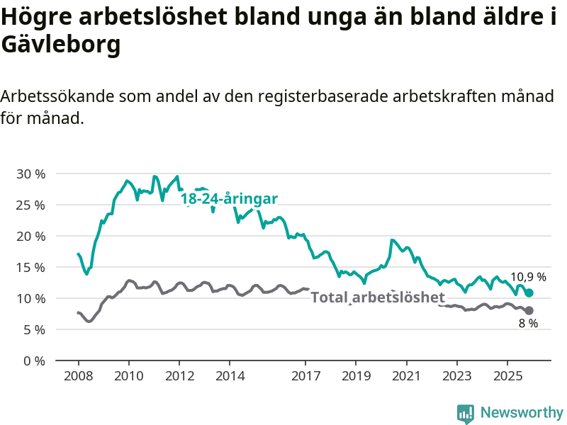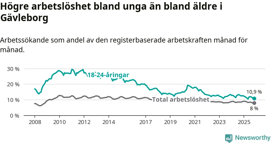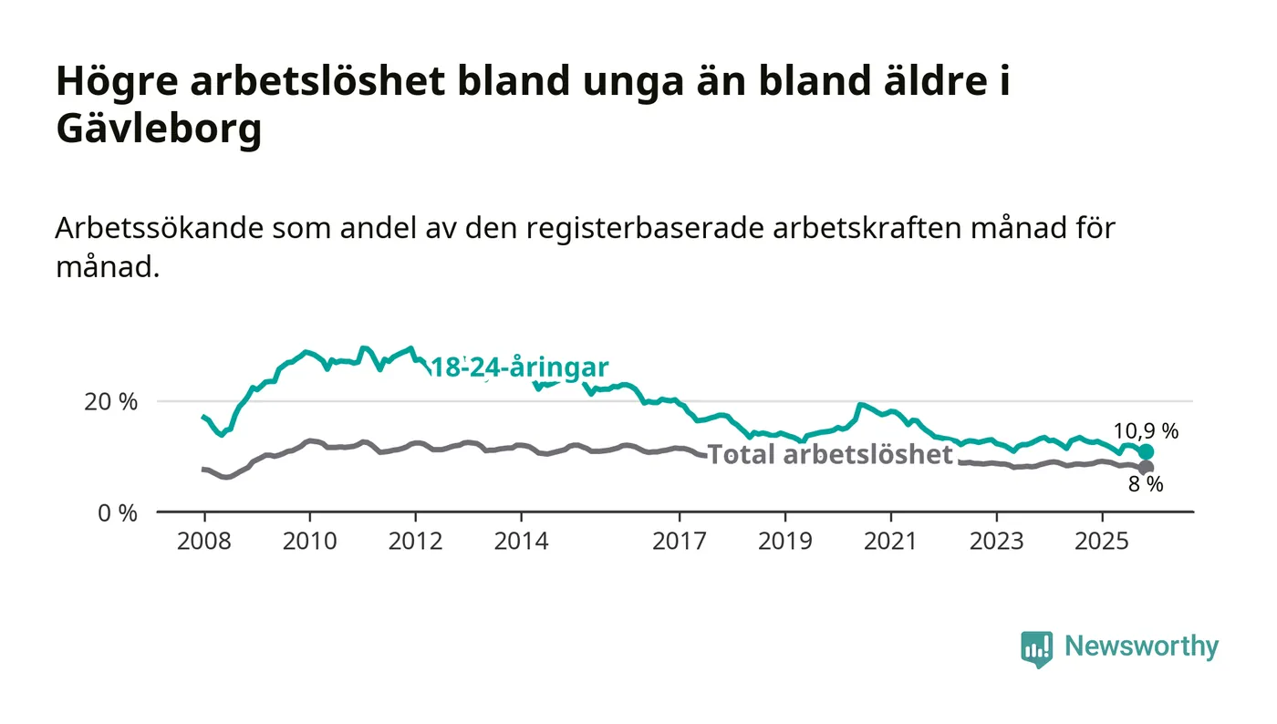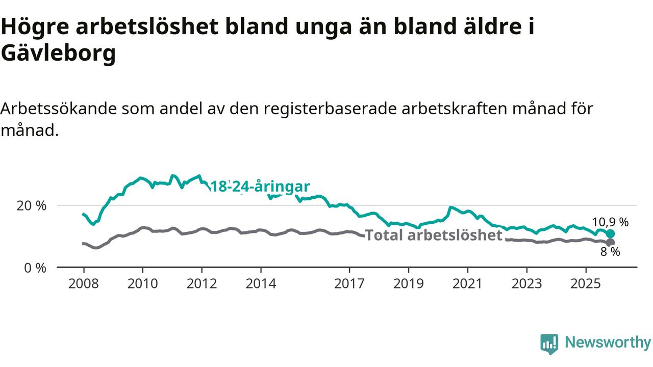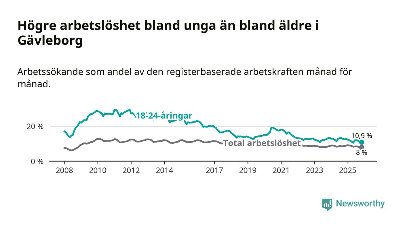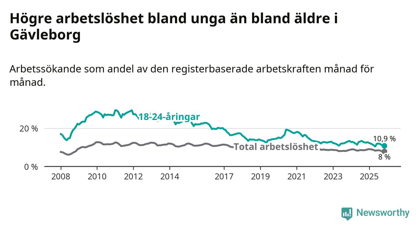 I och med den senaste månadens nedgång har de ungas arbetslöshet i Gävleborg sjunkit 14 månader i följd (ner från 12,9 procent i september 2024 till 10,9 procent nu).