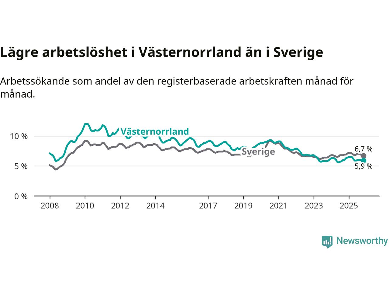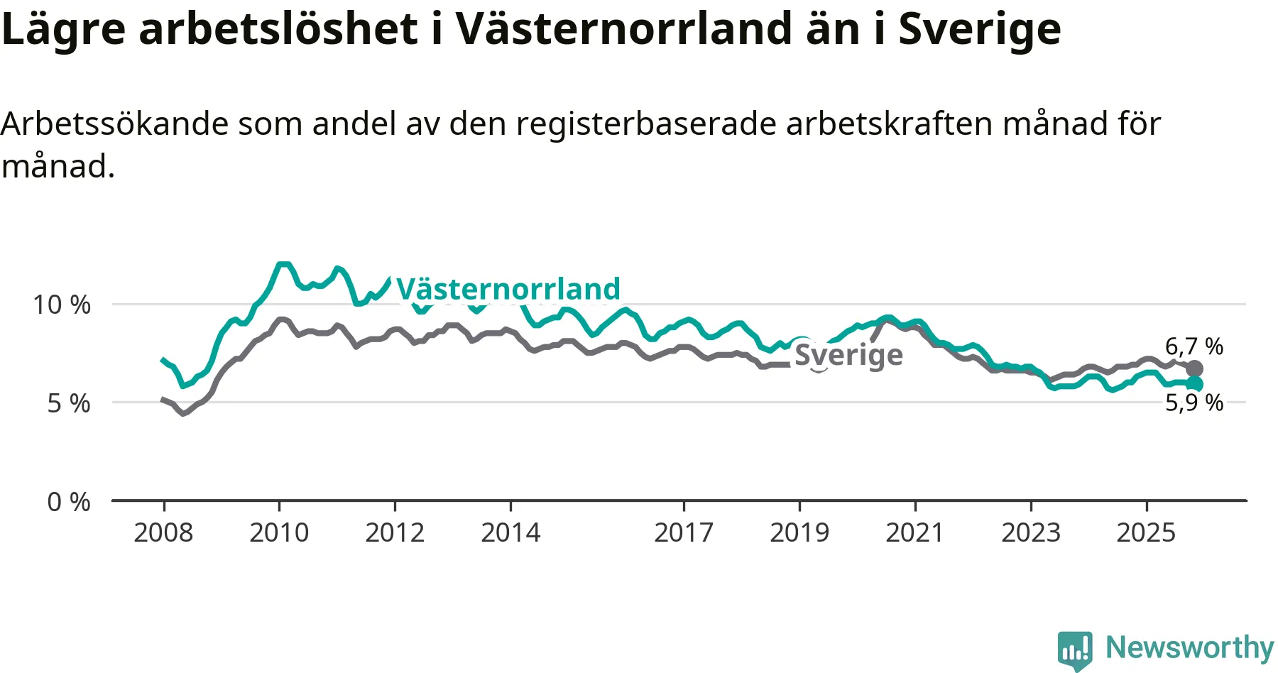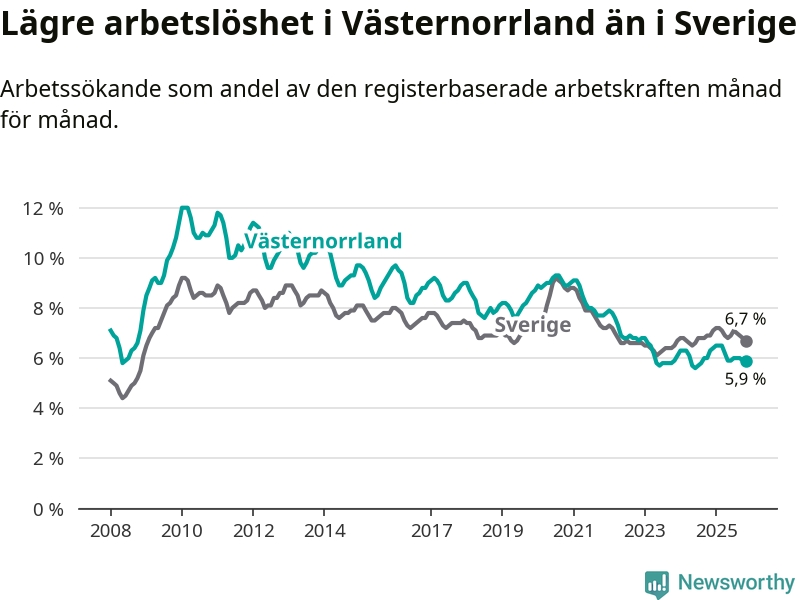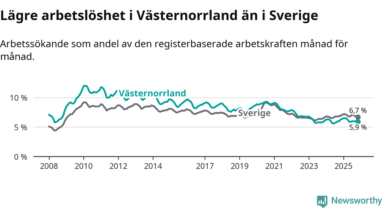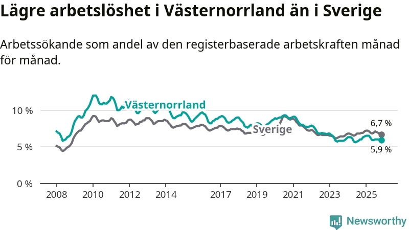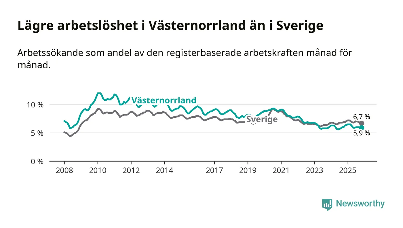 Västernorrland hade redan tidigare lägre arbetslöshet än snittet i hela Sverige och nu växer klyftan (5,9 procent i länet, jämfört med 6,7 procent i hela riket). Norrbotten har den lägsta arbetslösheten i riket (3,8 procent), medan Skåne har den högsta (8,8 procent). För att Västernorrland skulle komma ner i samma arbetslöshetsnivå som Norrbotten skulle 2 446 personer behöva sysselsättas.
