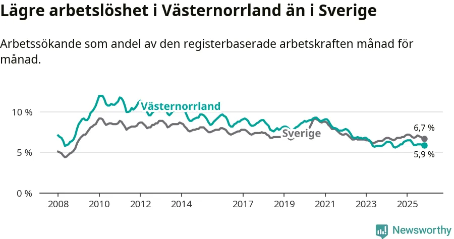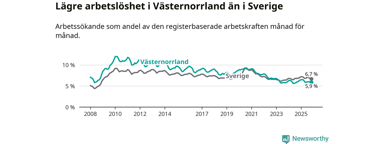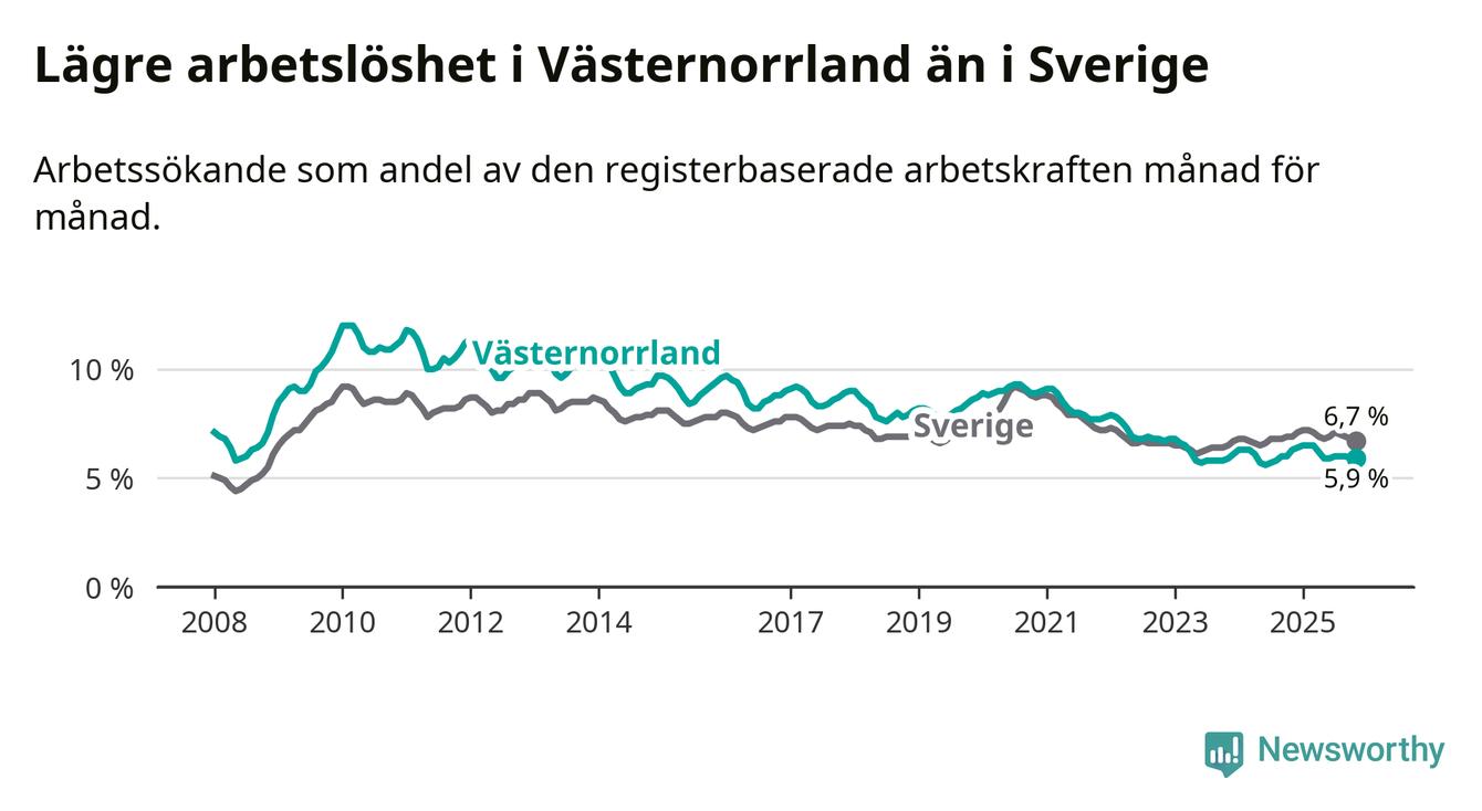 Under november månad rapporterade Västernorrlands län en total arbetslöshet på 5,9 procent. Det är en minskning jämfört med samma tidpunkt i fjol (−0,4 procentenheter). Även i Sverige sjunker arbetslösheten .