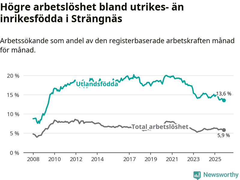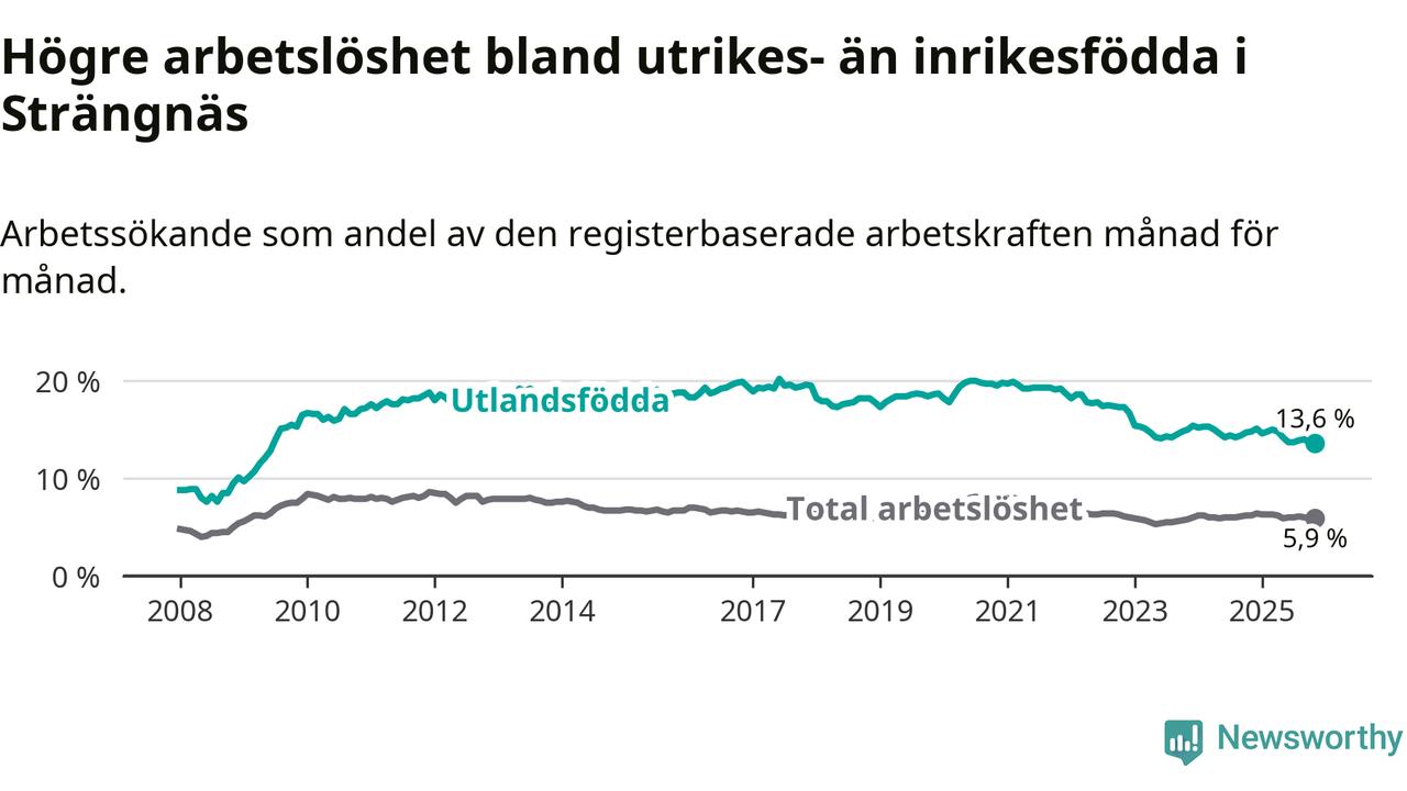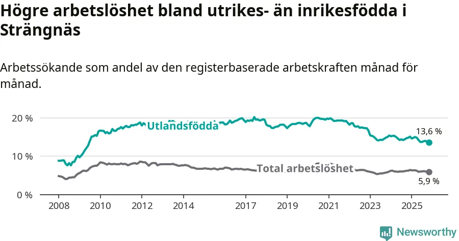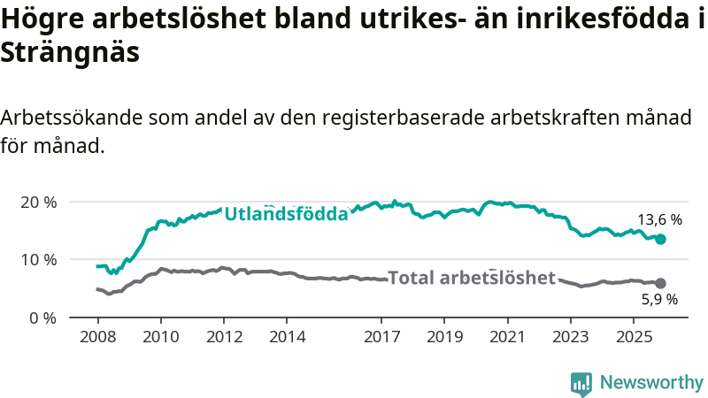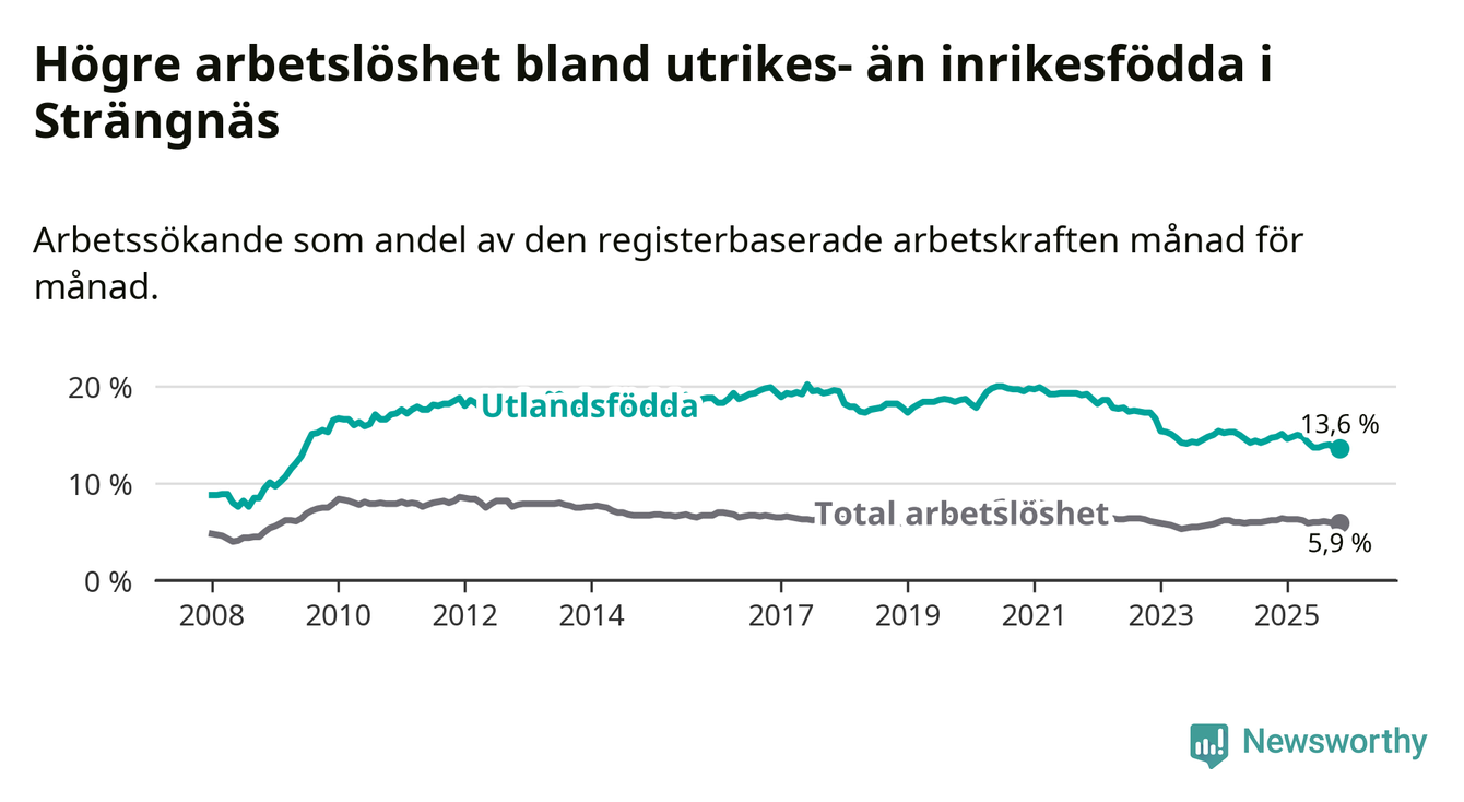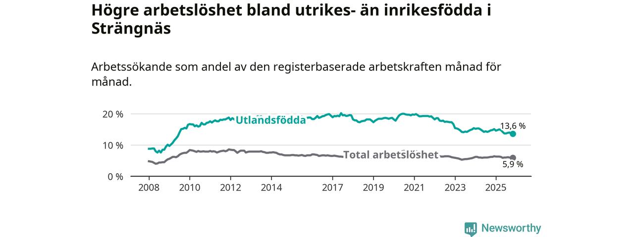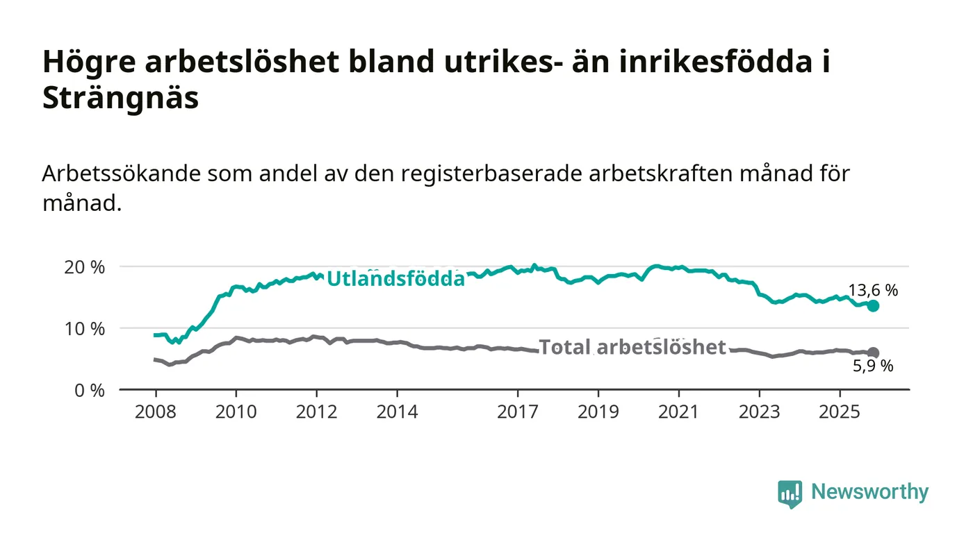 Skillnaden i arbetslöshet mellan utrikesfödda och hela befolkningen är 7,7 procentenheter i Strängnäs. Det är en mindre skillnad än för ett år sedan (−0,9 procentenheter).