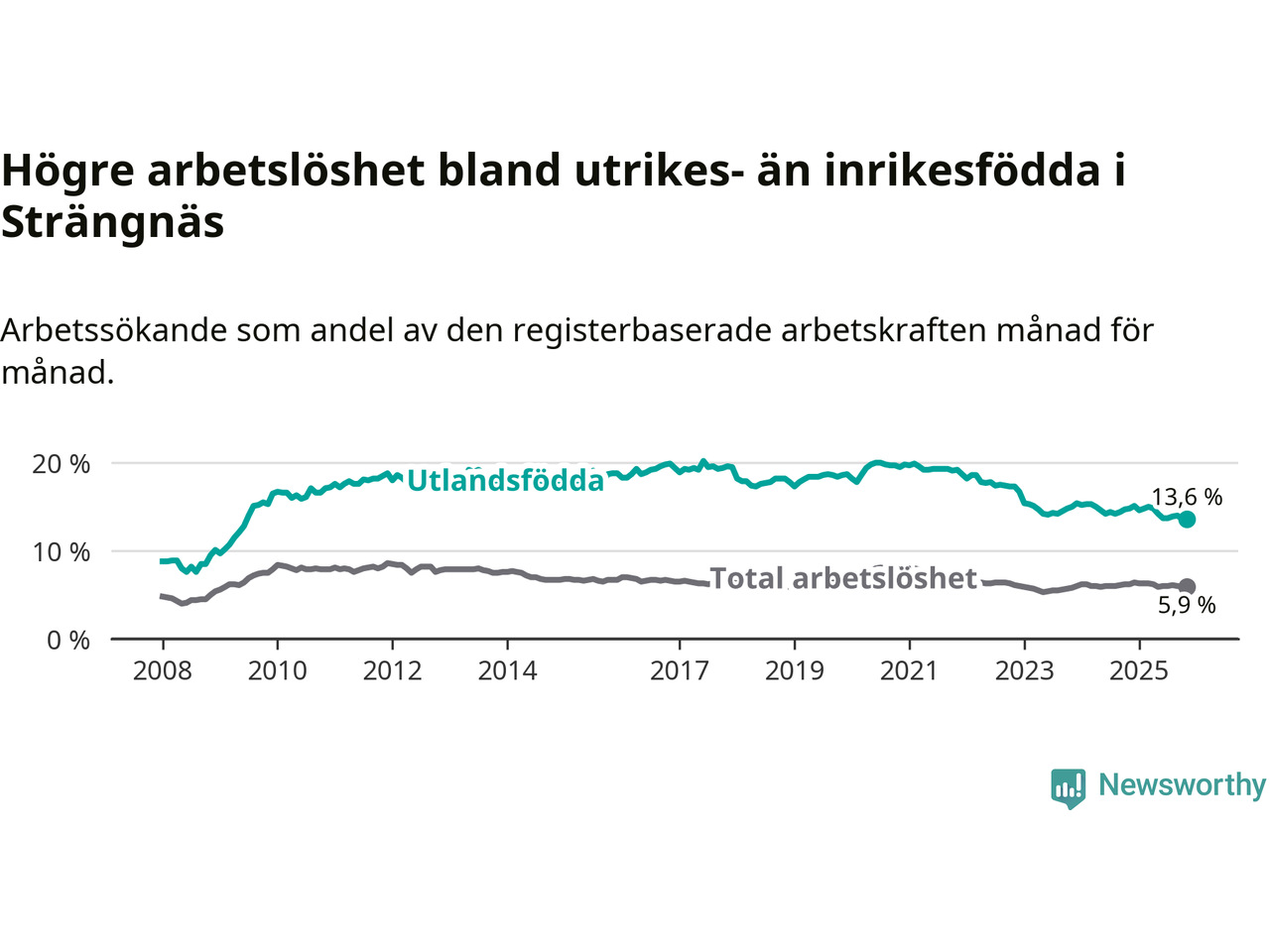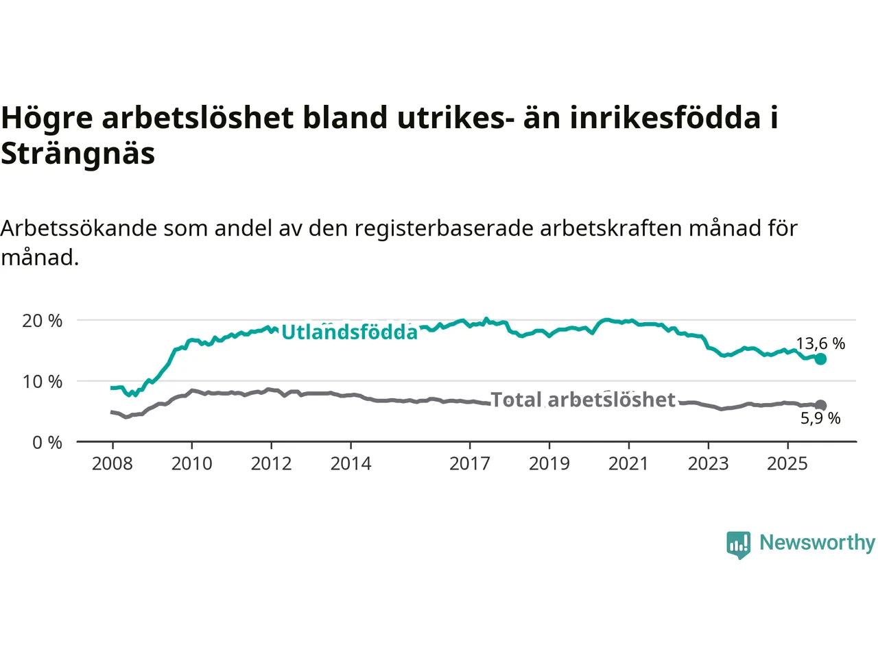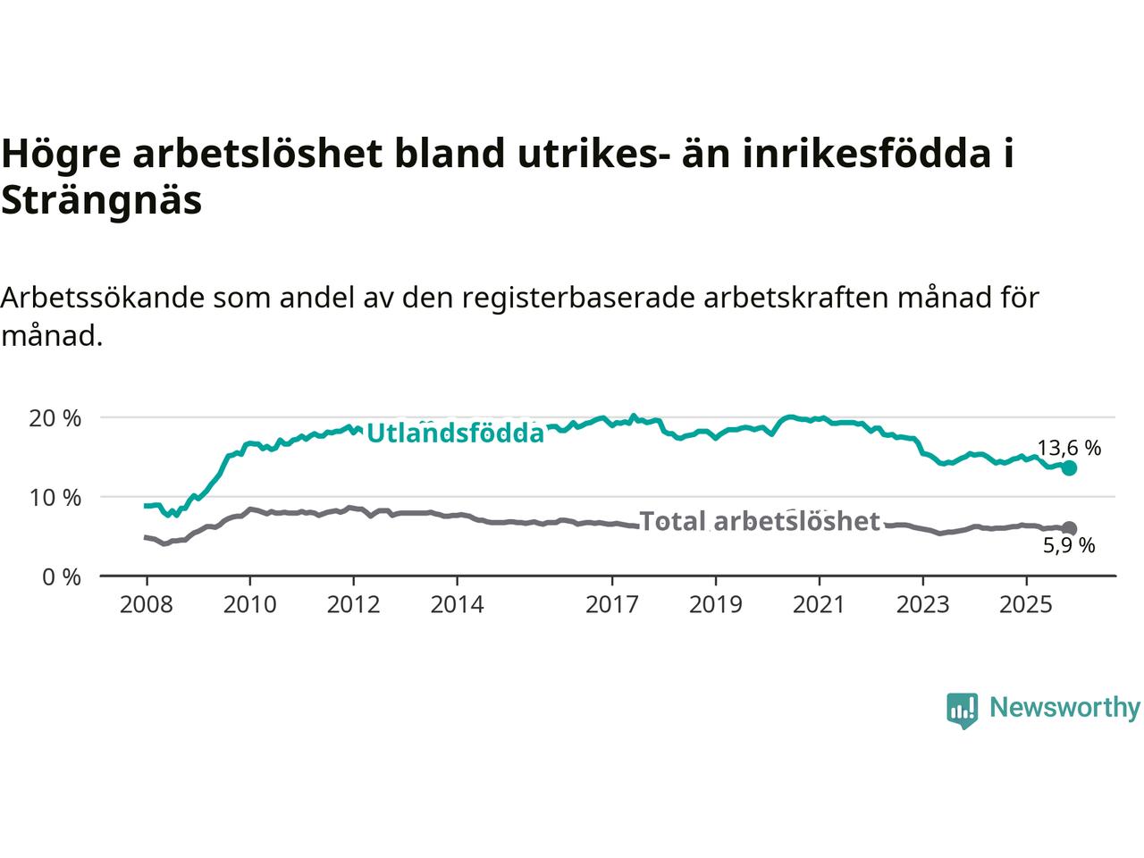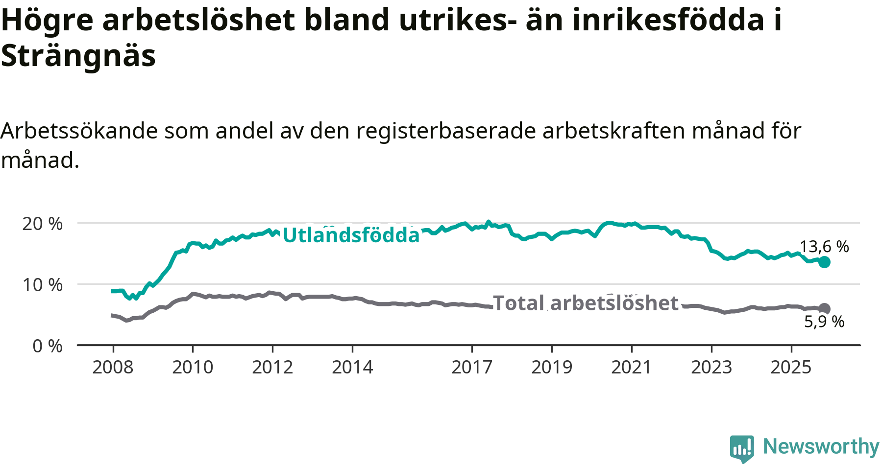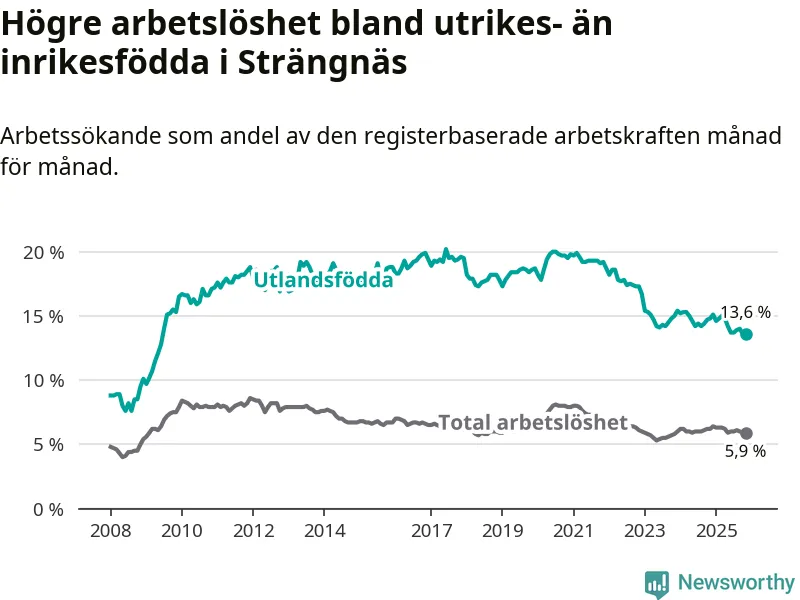 Skillnaden i arbetslöshet mellan utrikesfödda och hela befolkningen är 7,7 procentenheter i Strängnäs. Det är en mindre skillnad än för ett år sedan (−0,9 procentenheter).