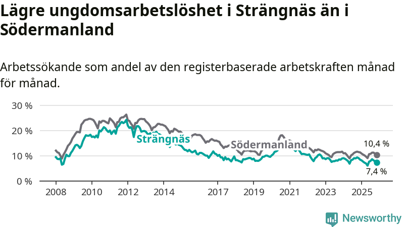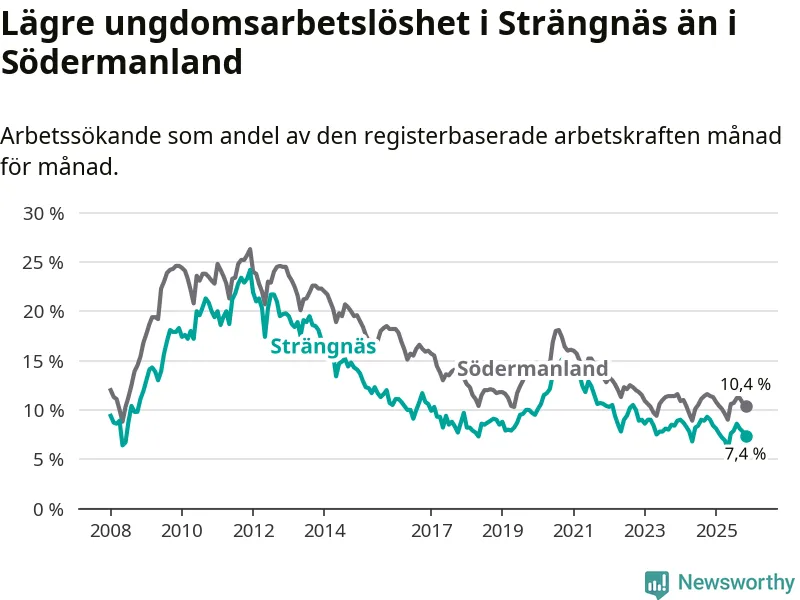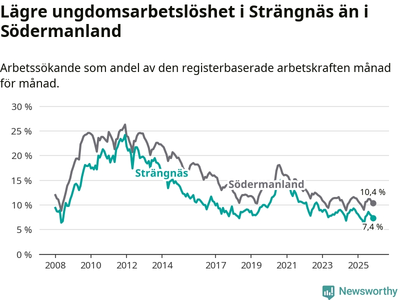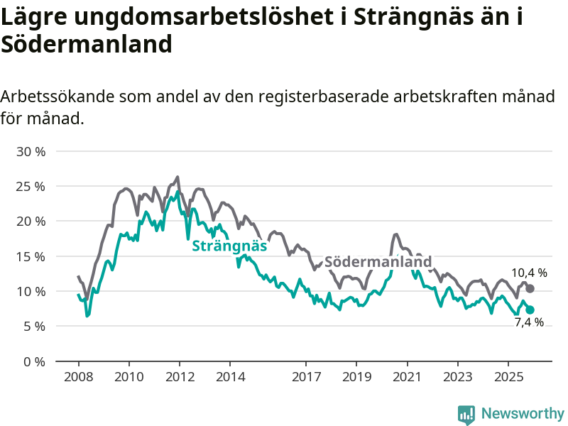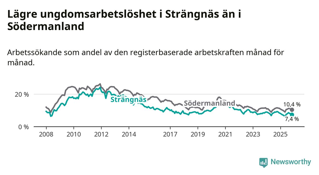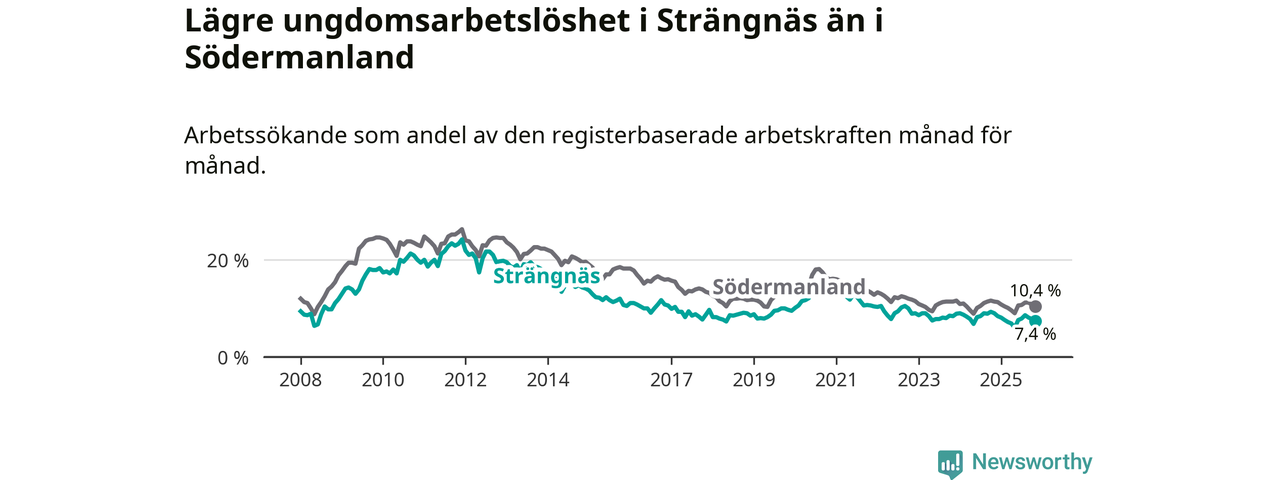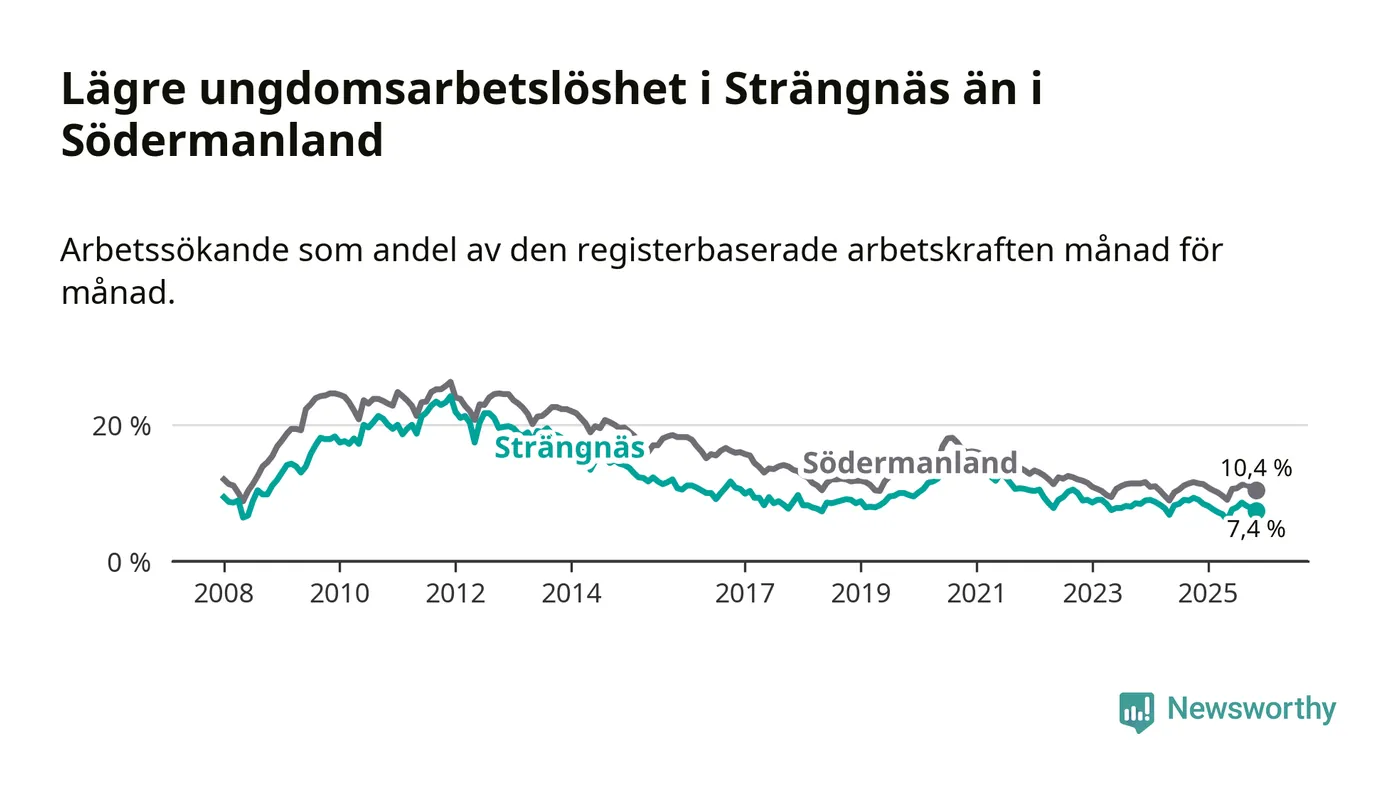 I och med den senaste månadens nedgång har de ungas arbetslöshet i Strängnäs sjunkit tolv månader i följd (ner från 9,0 procent i november 2024 till 7,4 procent nu).