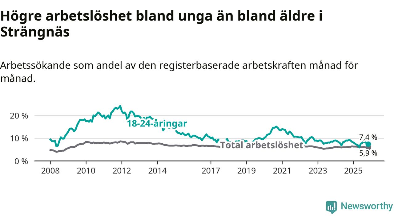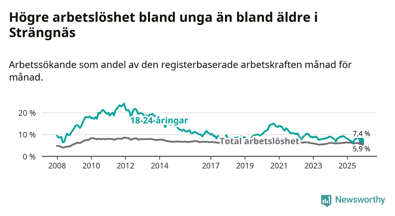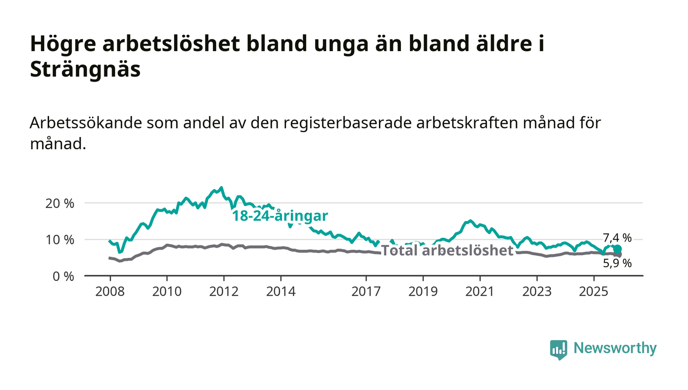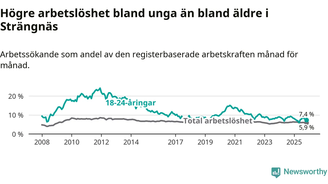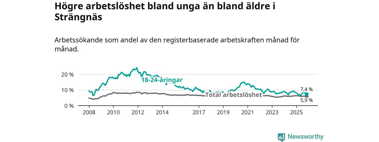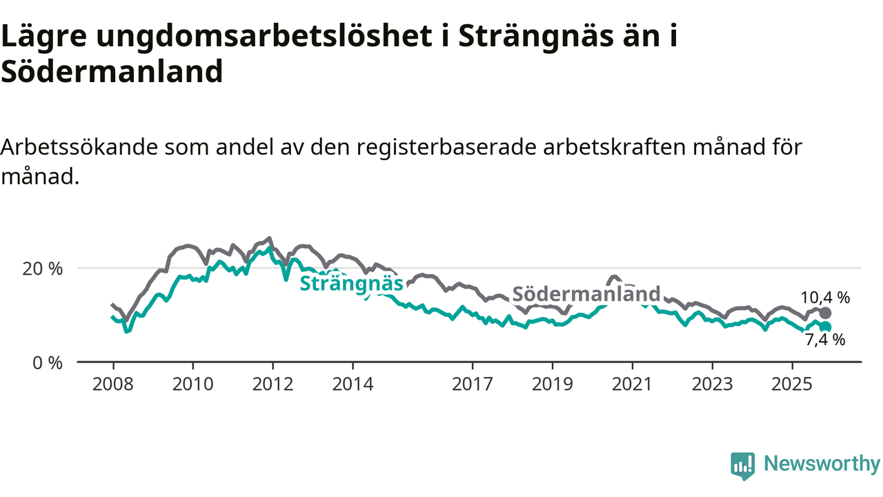 I och med den senaste månadens nedgång har de ungas arbetslöshet i Strängnäs sjunkit tolv månader i följd (ner från 9,0 procent i november 2024 till 7,4 procent nu).