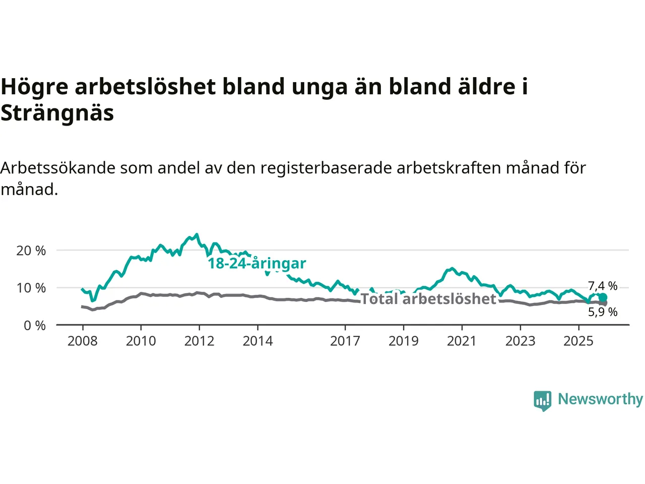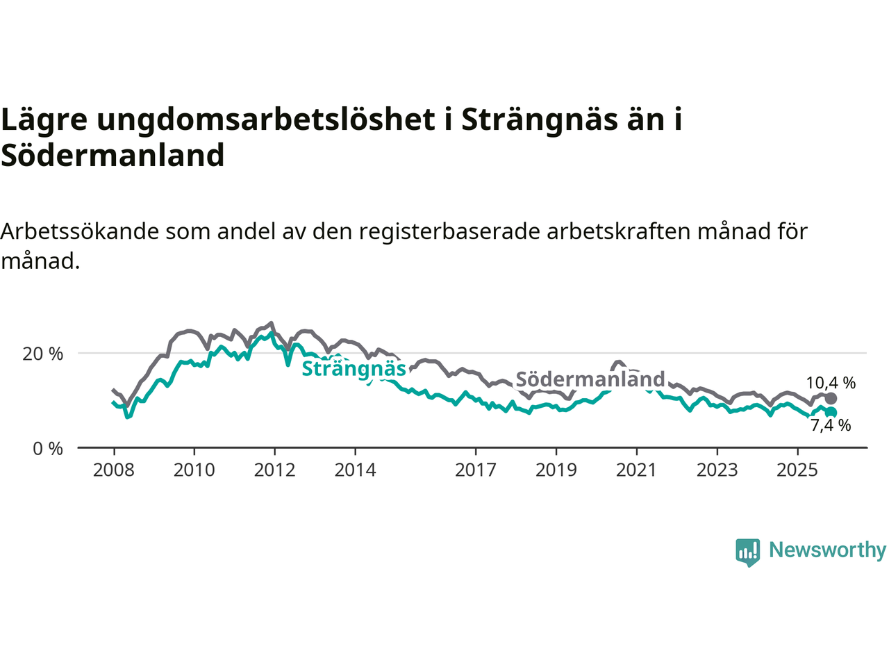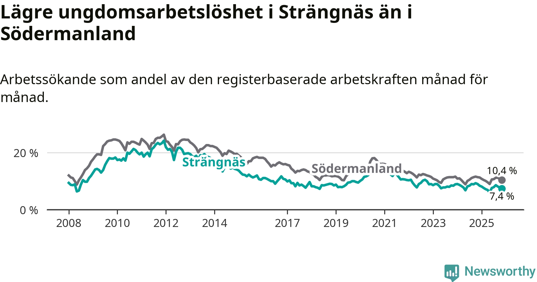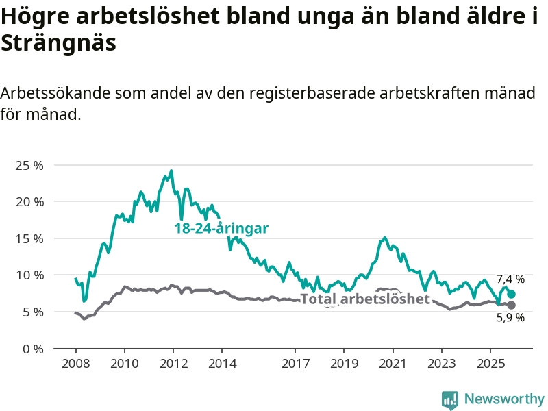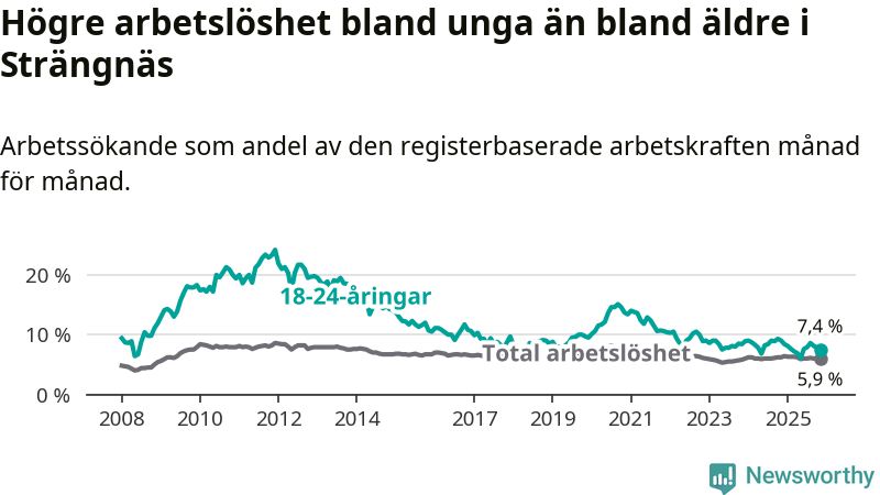 I och med den senaste månadens nedgång har de ungas arbetslöshet i Strängnäs sjunkit tolv månader i följd (ner från 9,0 procent i november 2024 till 7,4 procent nu).