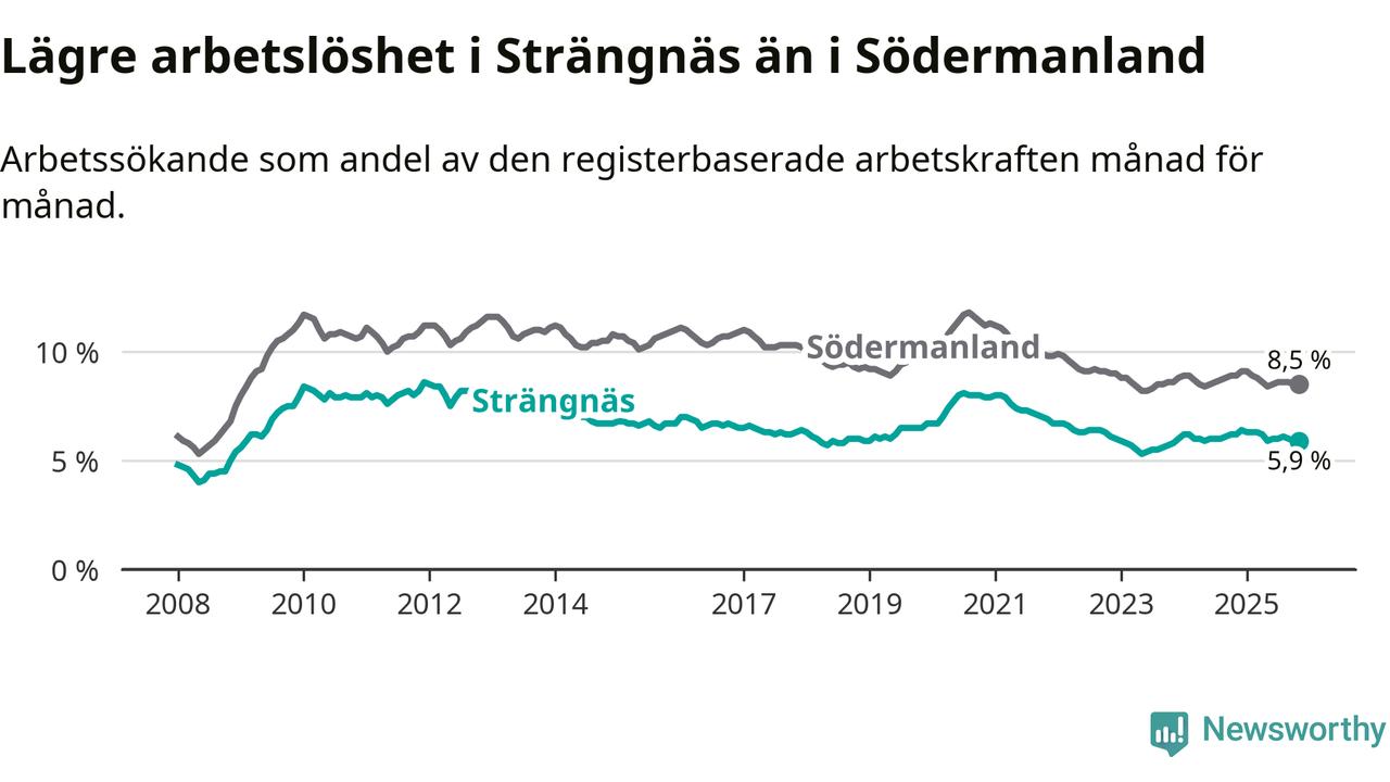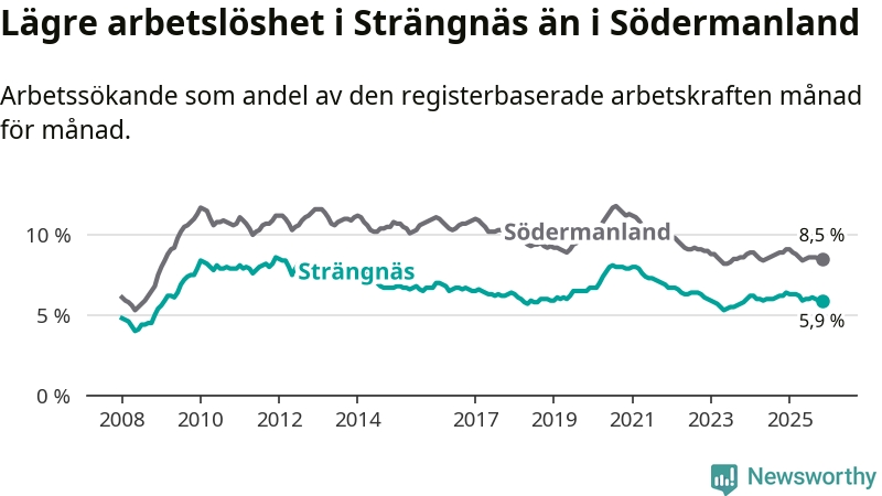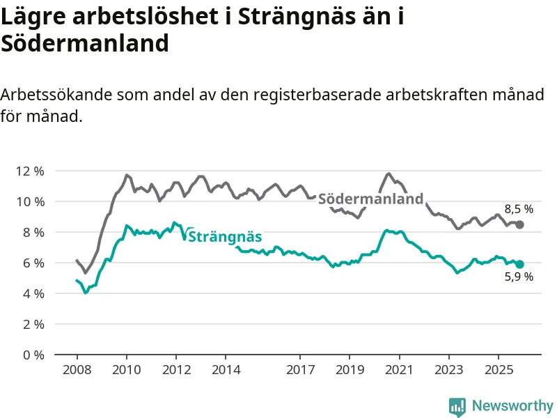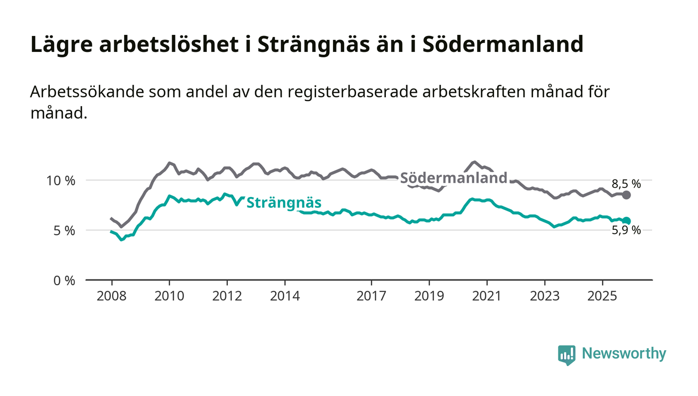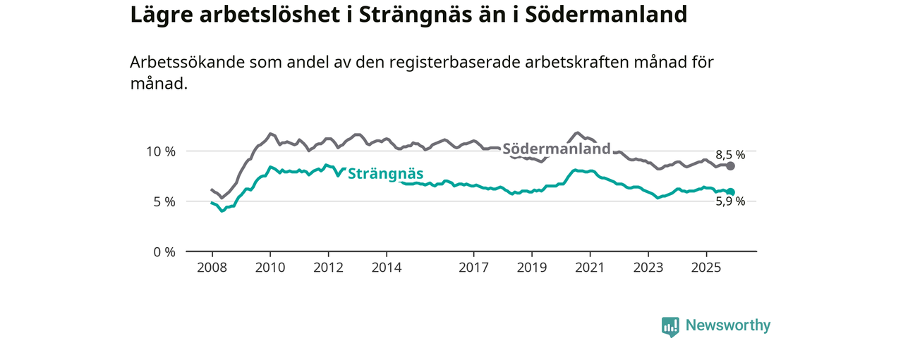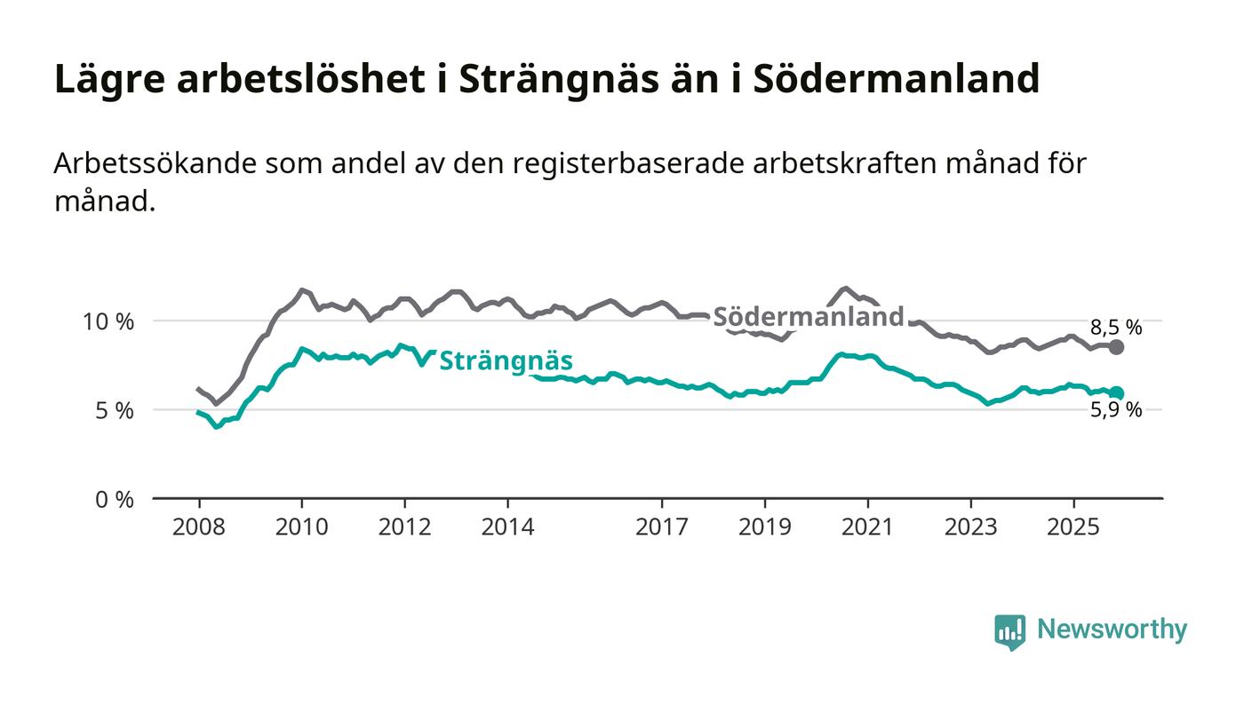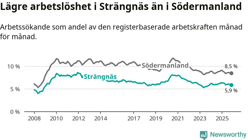 Under november månad rapporterade Strängnäs kommun en total arbetslöshet på 5,9 procent. Det är en minskning jämfört med samma tidpunkt i fjol (−0,3 procentenheter). Även i Södermanlands län sjunker arbetslösheten .