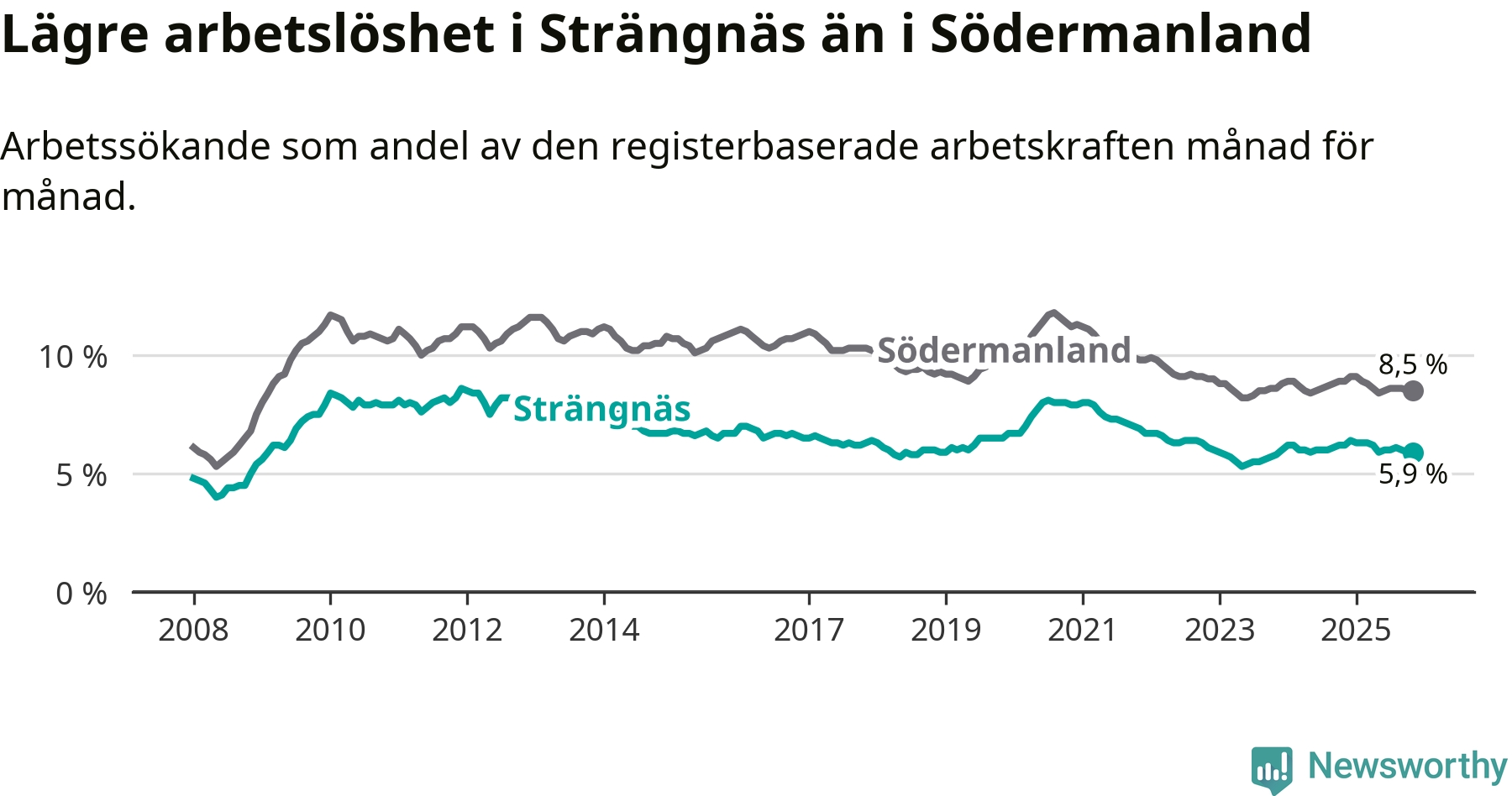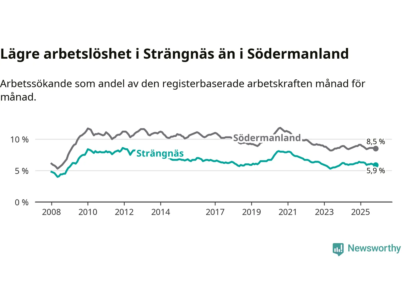 Strängnäs hade redan tidigare lägre arbetslöshet än snittet i hela Södermanlands län och nu växer klyftan (5,9 procent i kommunen, jämfört med 8,5 procent i hela länet). Trosa har den lägsta arbetslösheten i länet (3,8 procent), medan Flen har den högsta (10,7 procent). För att Strängnäs skulle komma ner i samma arbetslöshetsnivå som Trosa skulle 394 personer behöva sysselsättas.