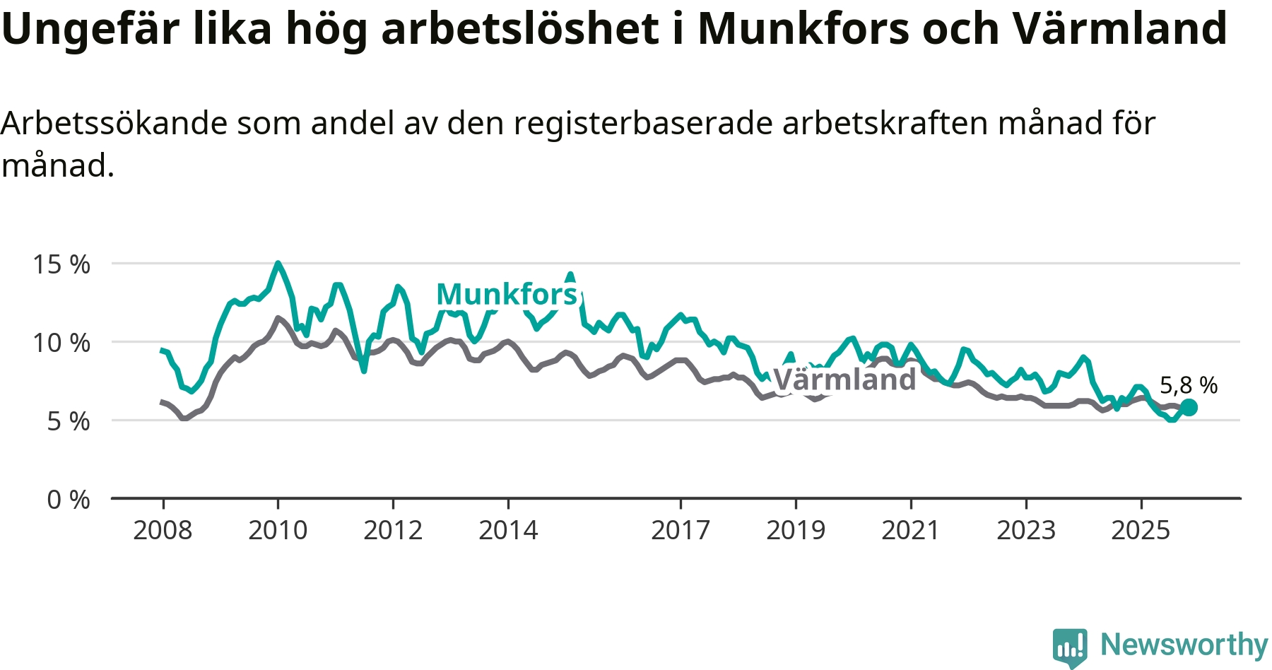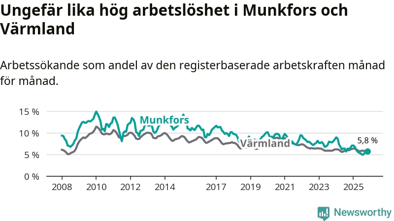 Under november månad rapporterade Munkfors kommun en total arbetslöshet på 5,8 procent. Det är en minskning jämfört med samma tidpunkt i fjol (−0,8 procentenheter). Även i Värmlands län sjunker arbetslösheten .