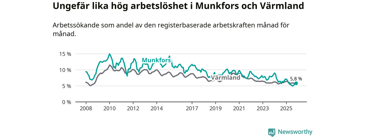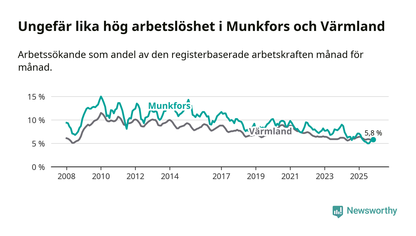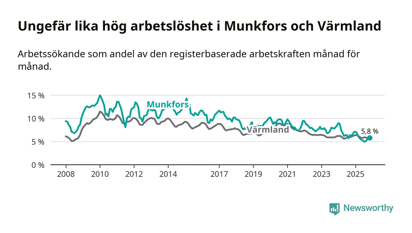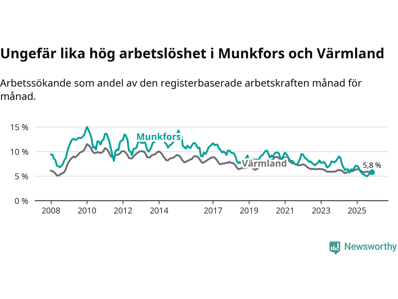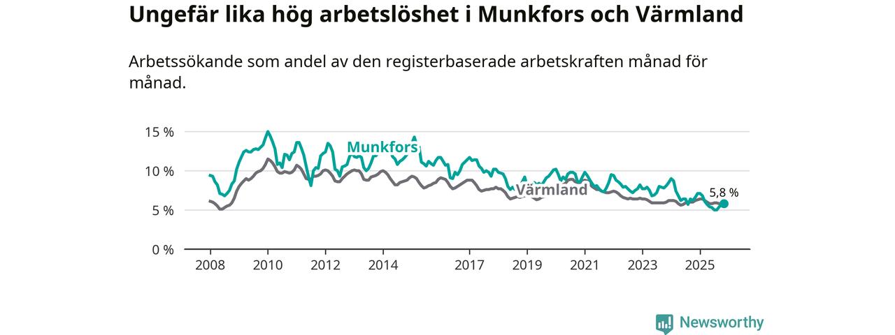 Det är 21:a månaden i följd som arbetslösheten i Munkfors är lägre än den var under samma tidpunkt året innan. Sedan februari 2024 har arbetslösheten gått ner från 8,7 till 5,8 procent.