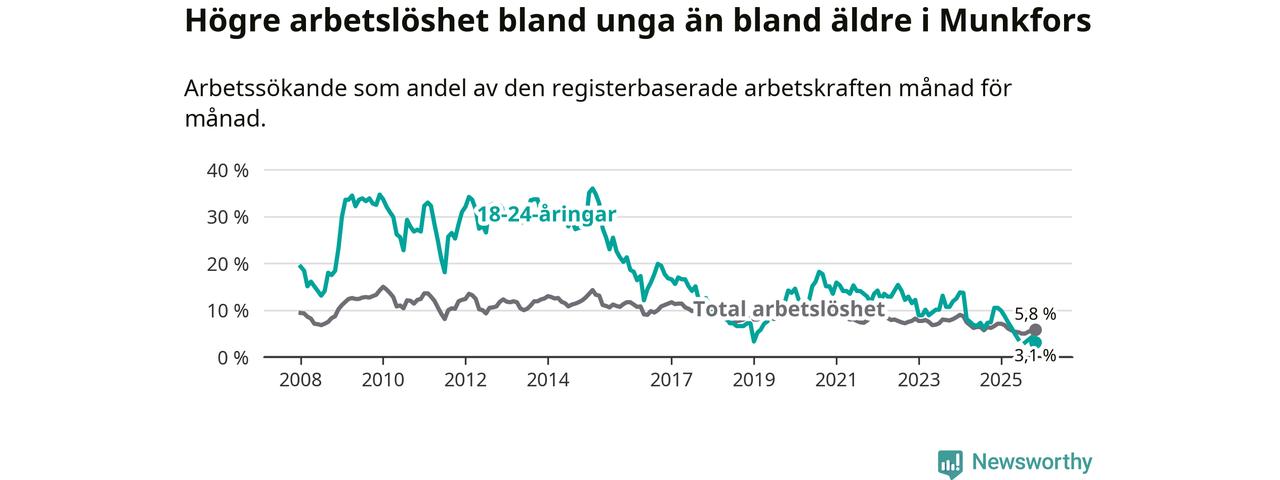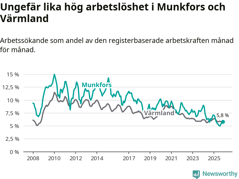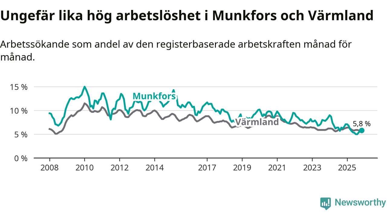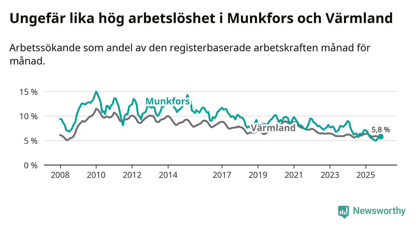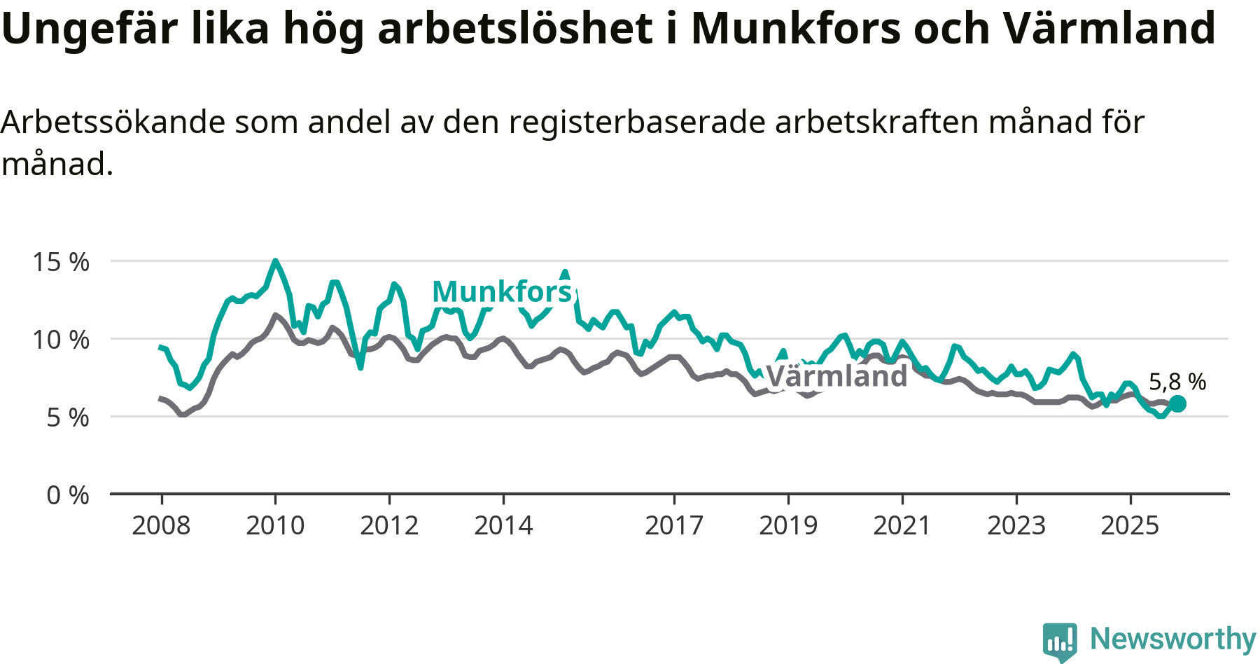 Det är 21:a månaden i följd som arbetslösheten i Munkfors är lägre än den var under samma tidpunkt året innan. Sedan februari 2024 har arbetslösheten gått ner från 8,7 till 5,8 procent.