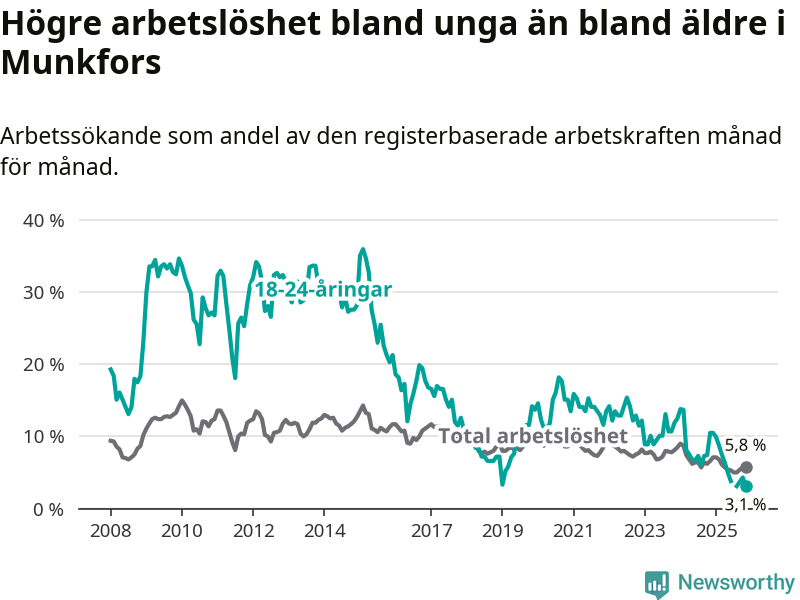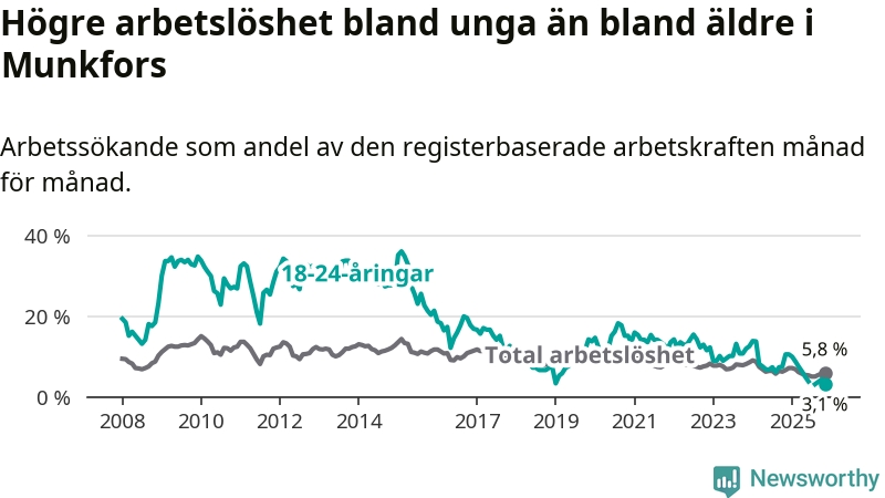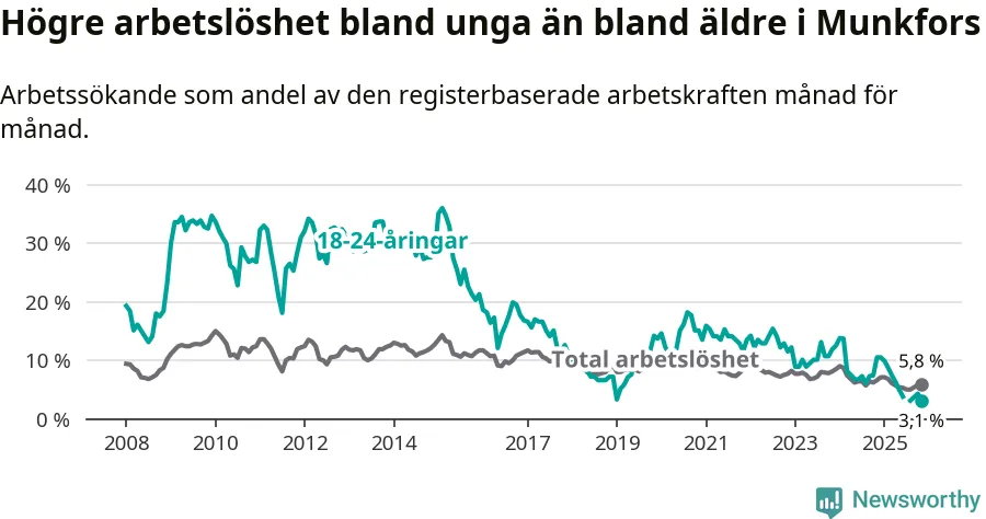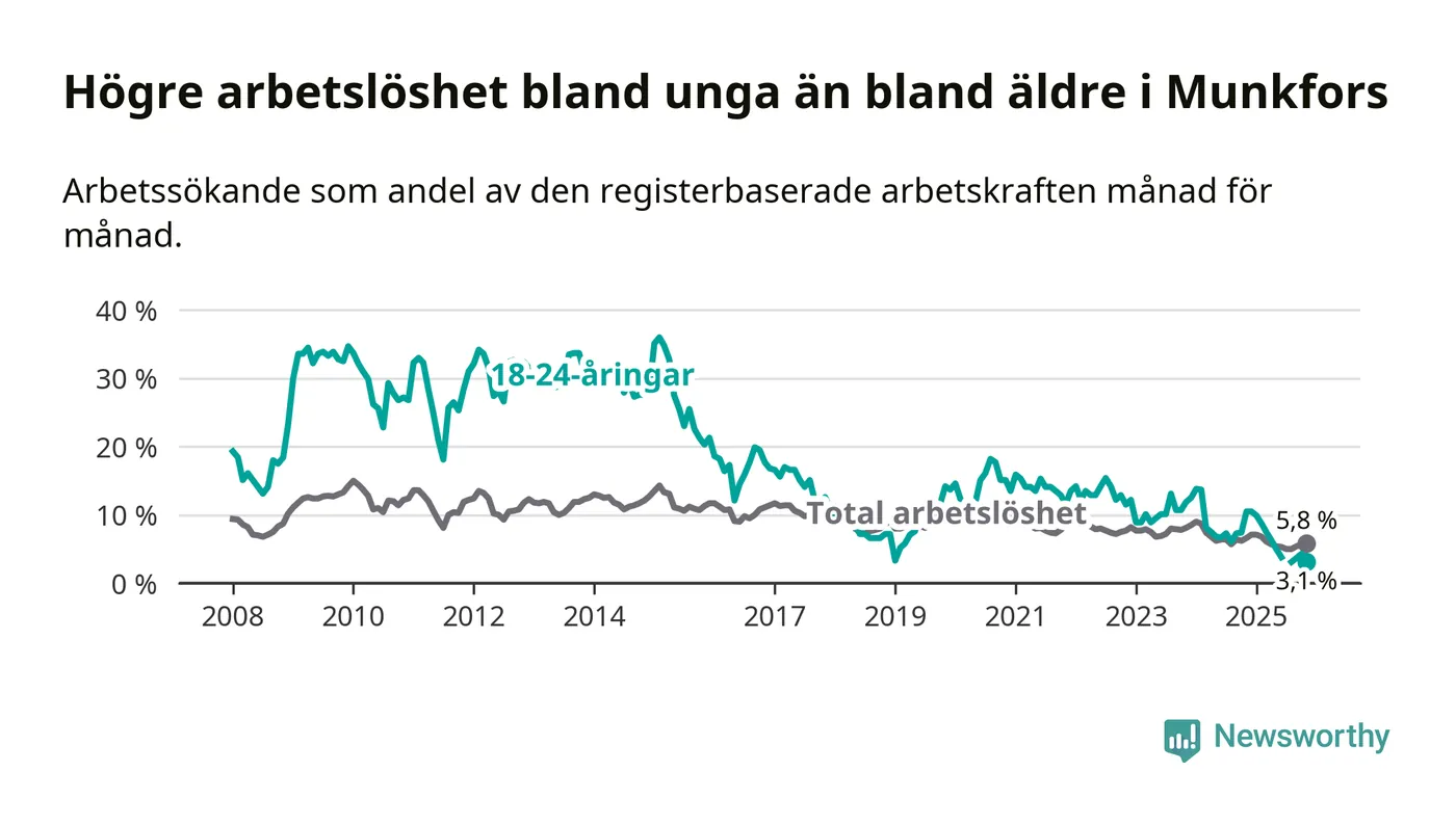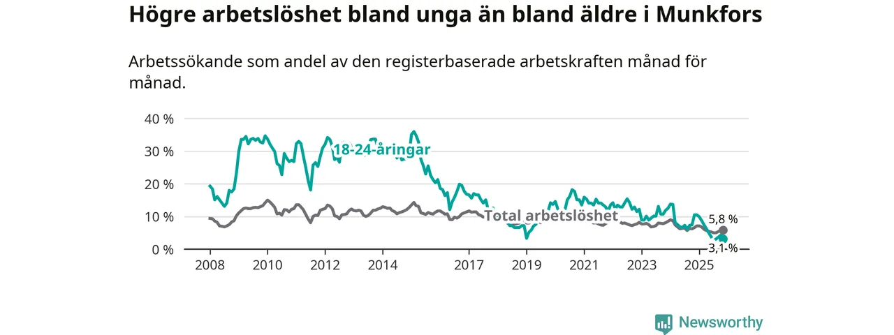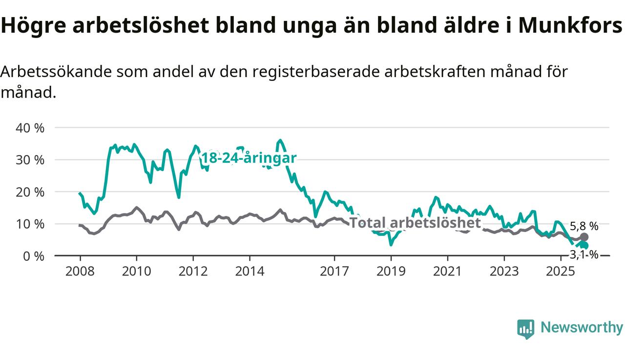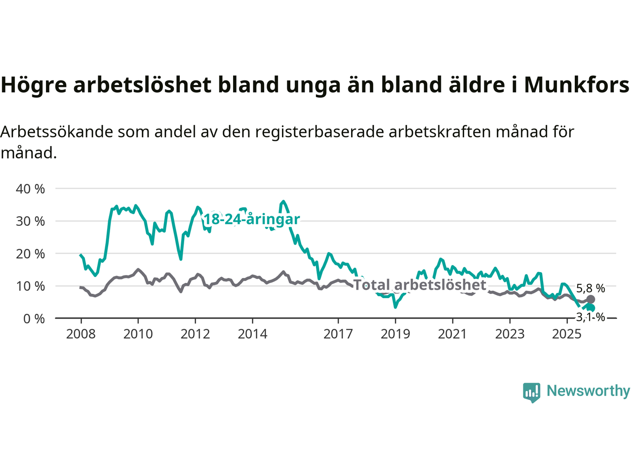 I och med den senaste månadens nedgång har de ungas arbetslöshet i Munkfors sjunkit 21 månader i följd (ner från 13,7 procent i februari 2024 till 3,1 procent nu).