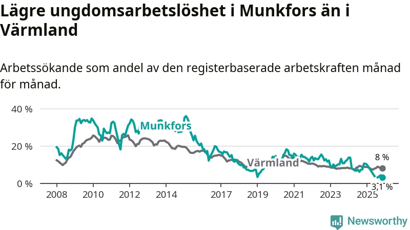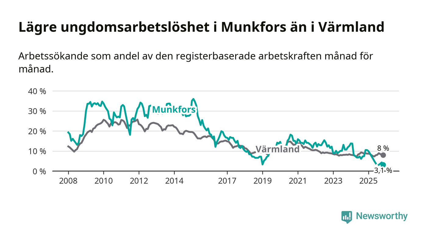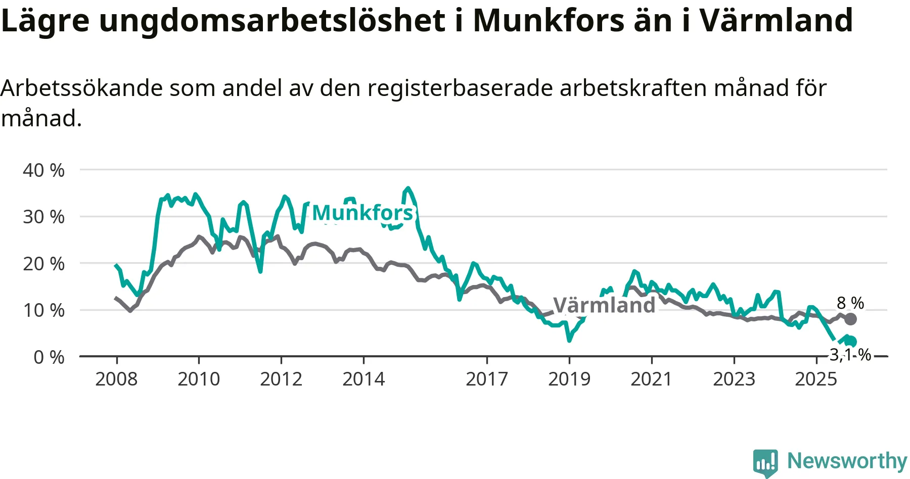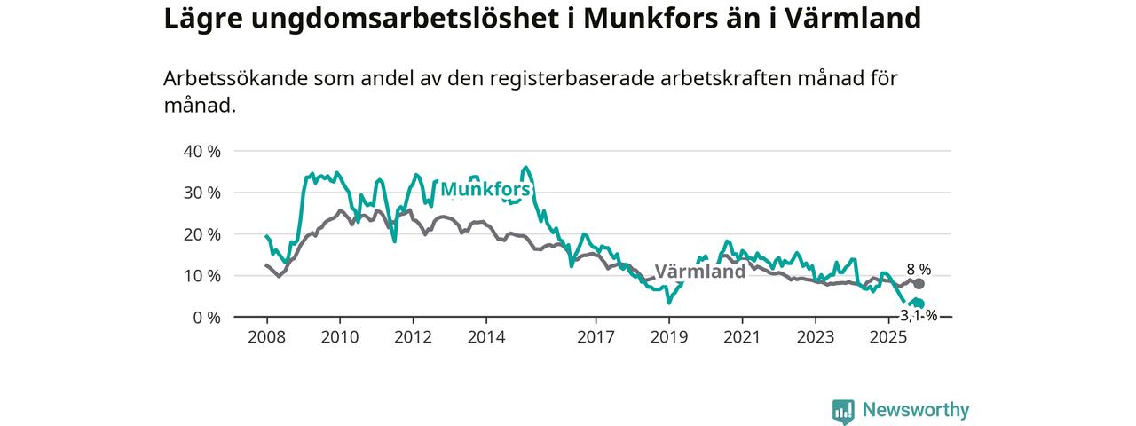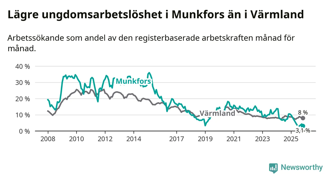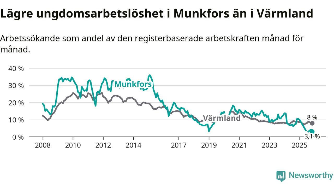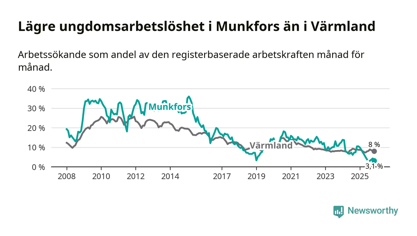 Medan Munkfors har ungefär samma total arbetslöshet som Värmland, ligger ungdomsarbetslösheten 4,9 procentenheter lägre i Munkfors.