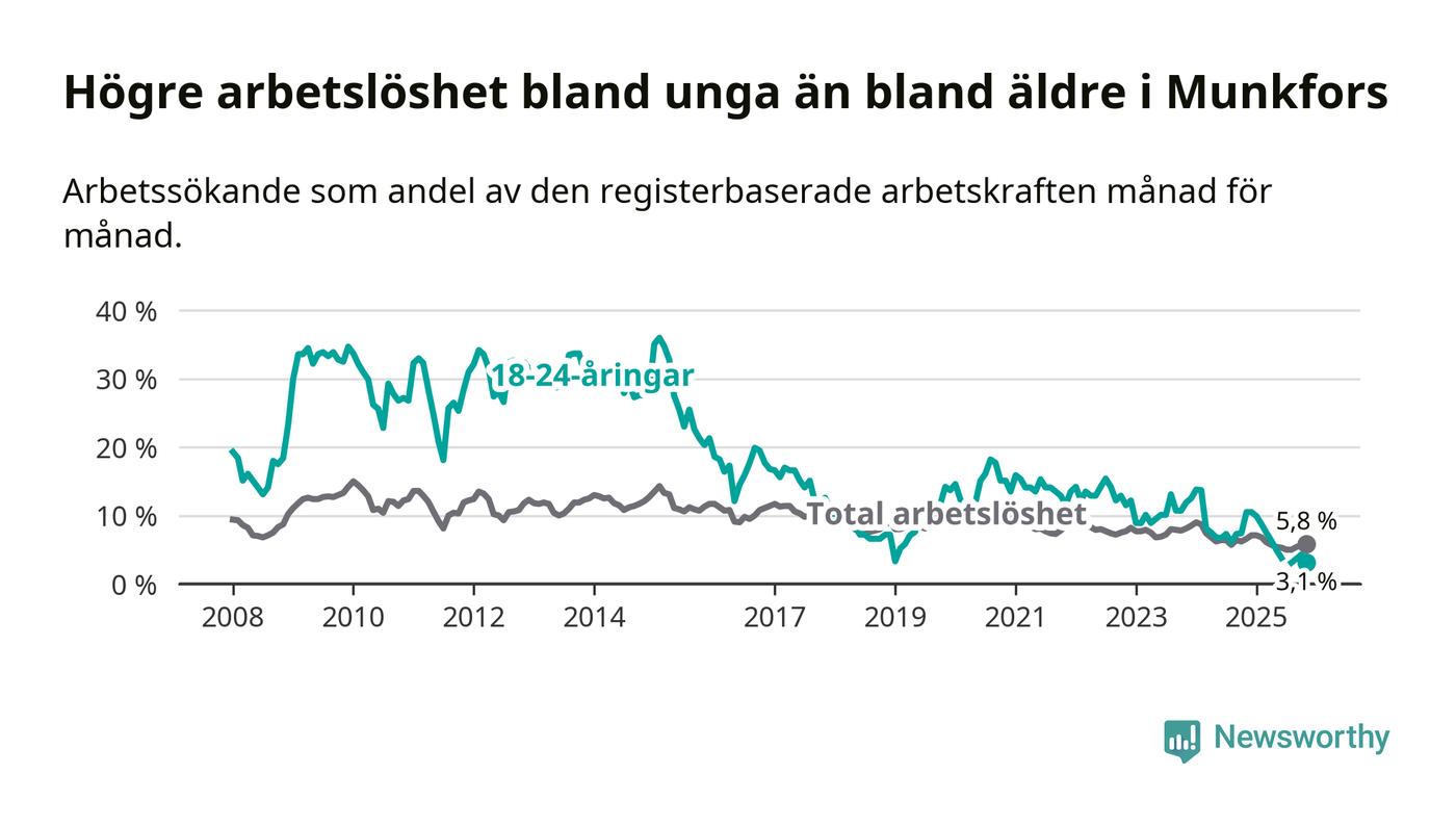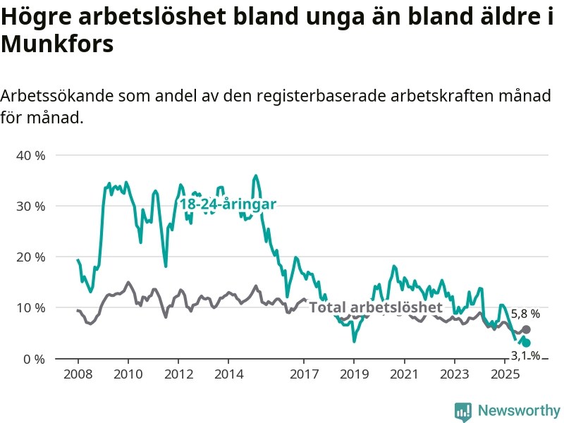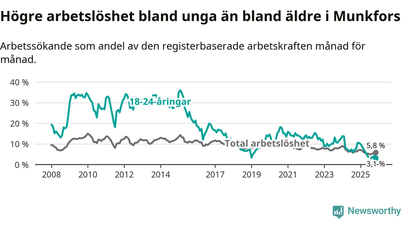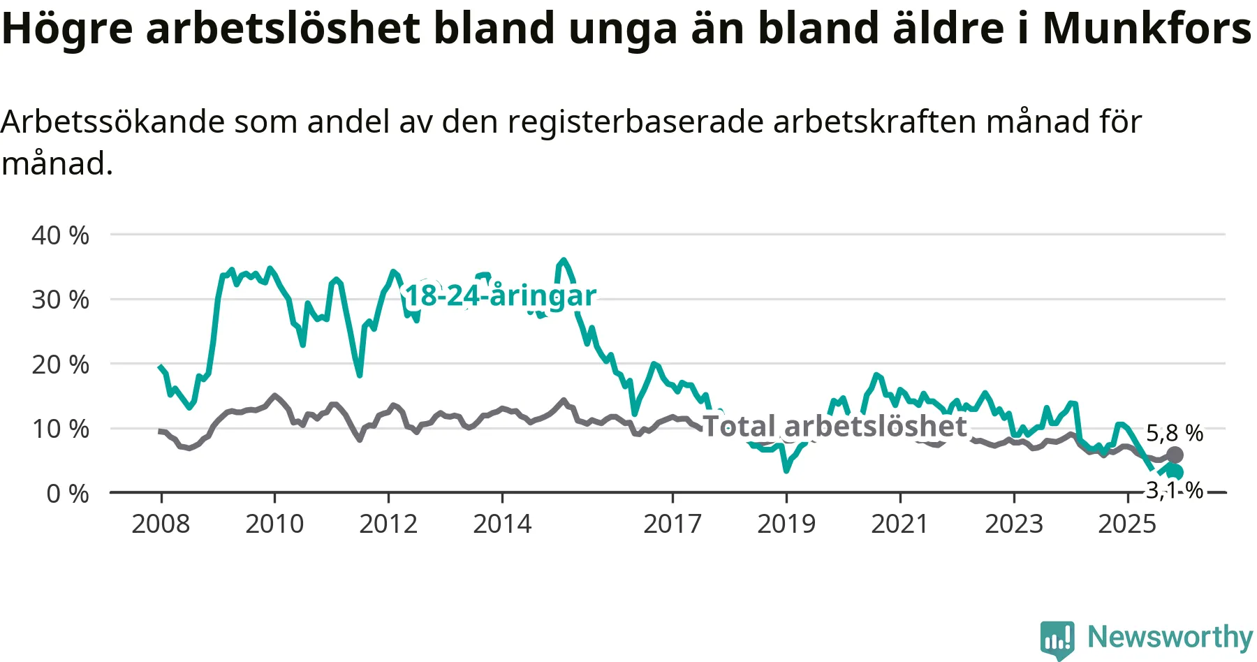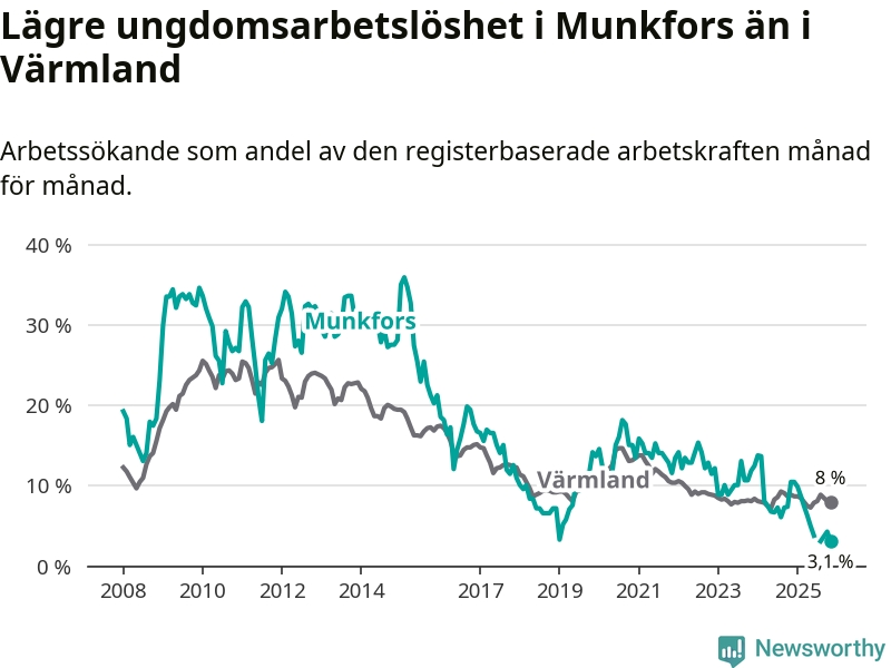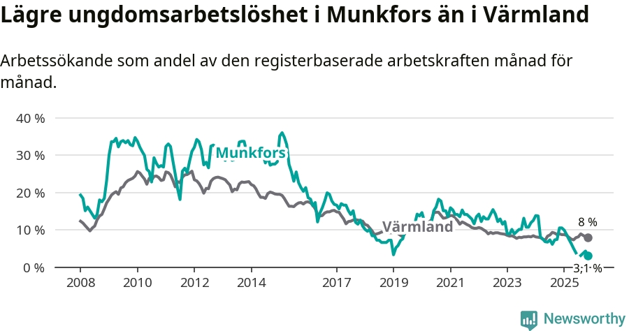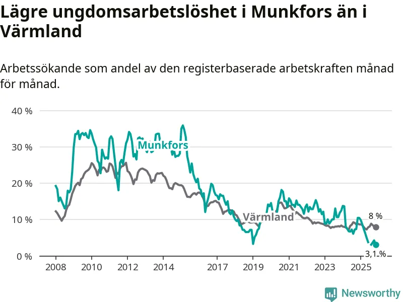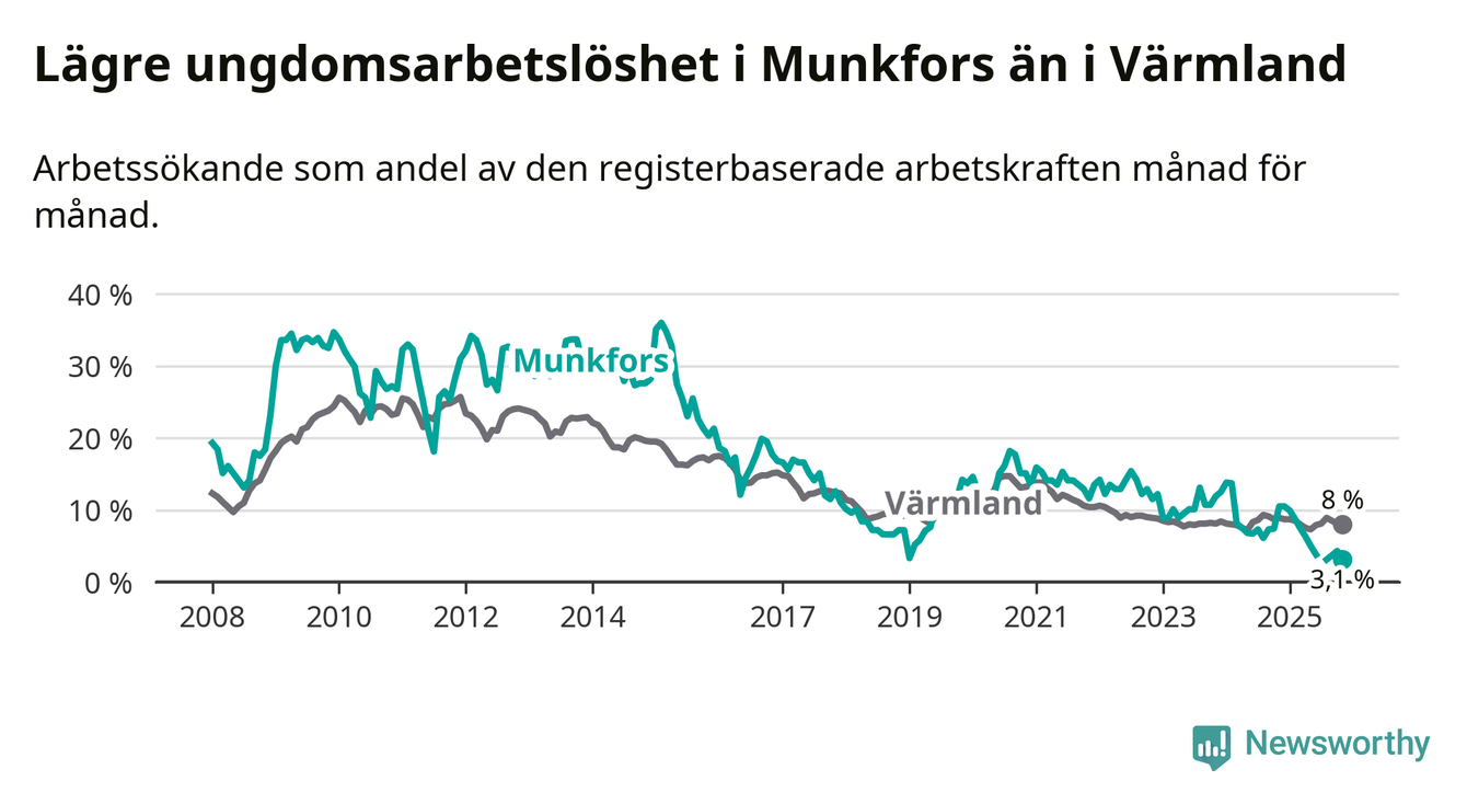 Medan Munkfors har ungefär samma total arbetslöshet som Värmland, ligger ungdomsarbetslösheten 4,9 procentenheter lägre i Munkfors.