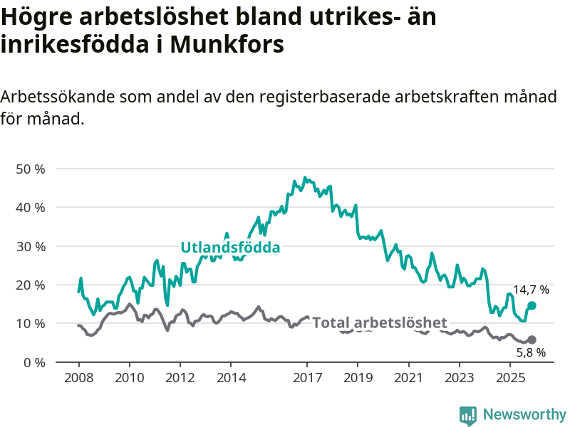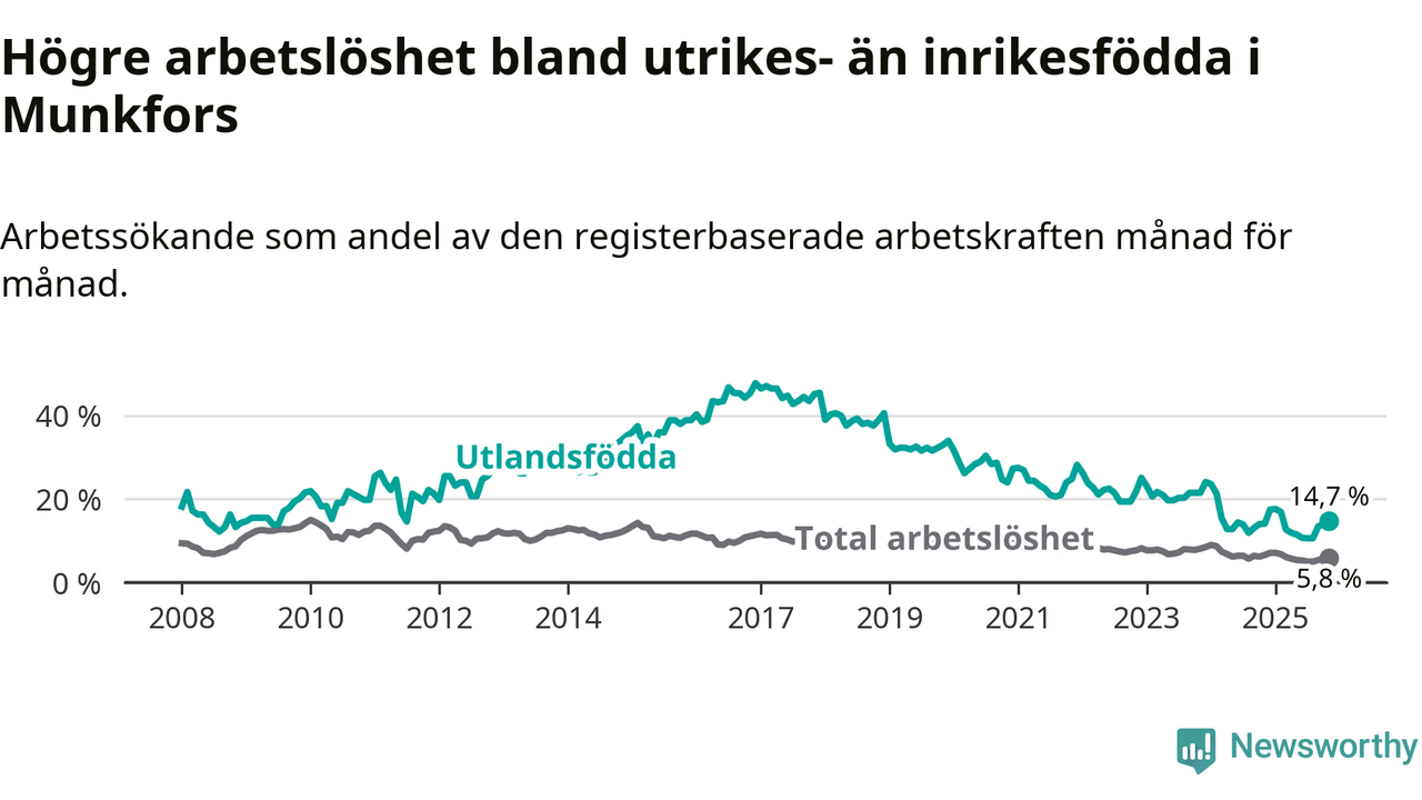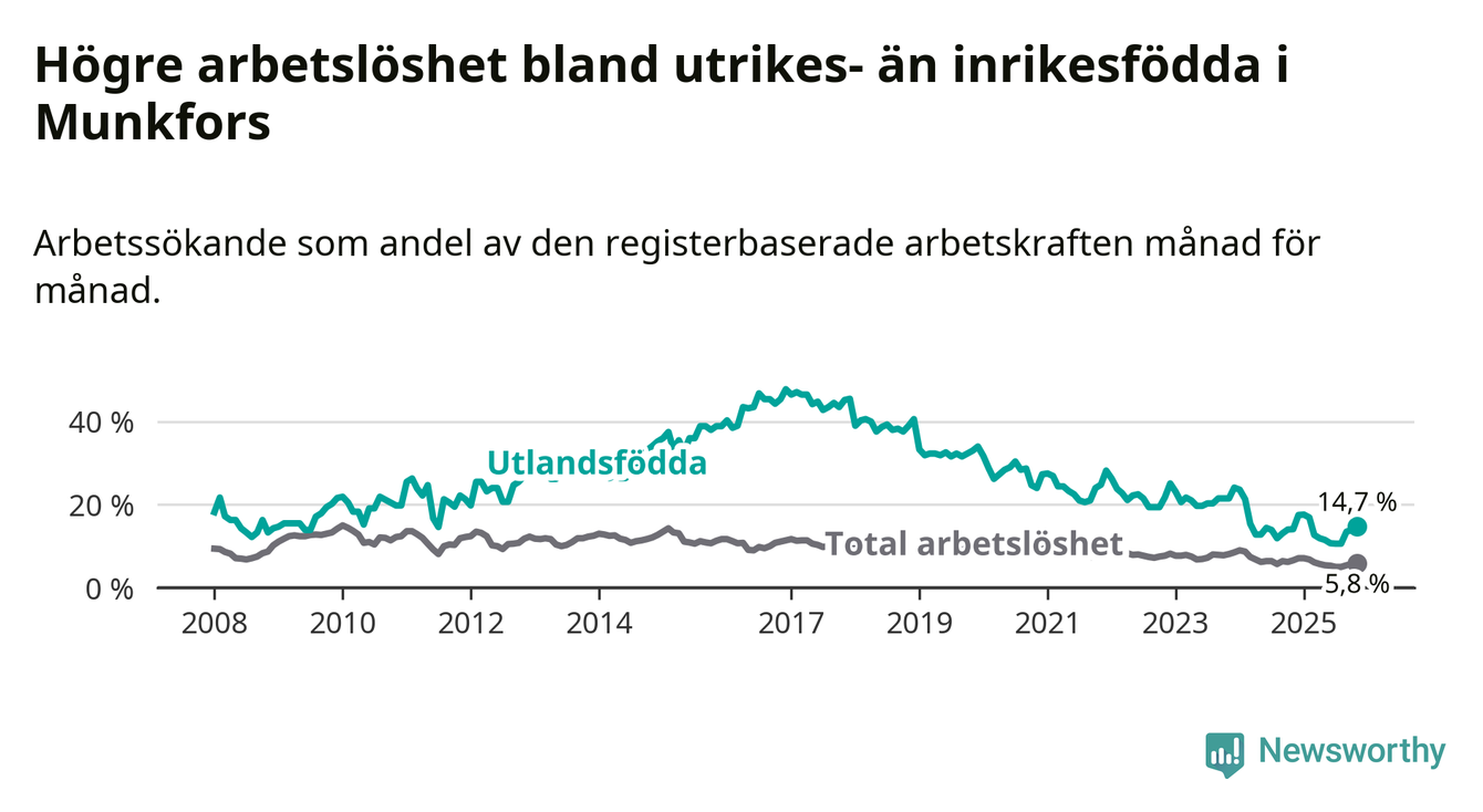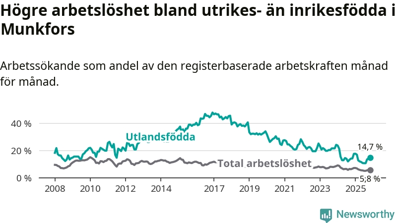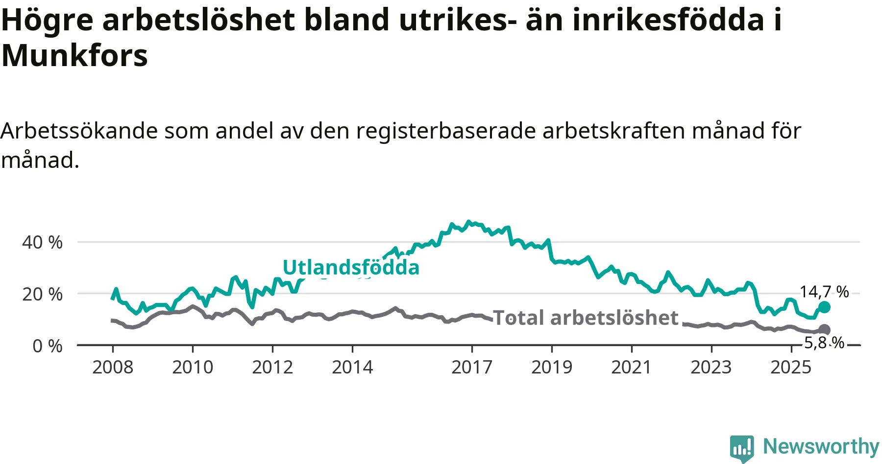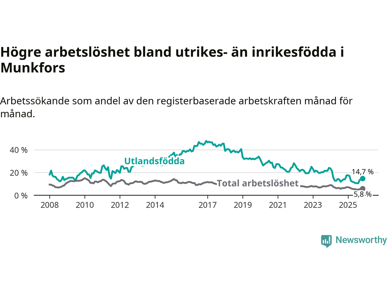Arbetslösheten bland utlandsfödda var 14,7 procent i Munkfors under november månad, motsvarande 35 av 238 personer. Det är 0,6 procentenheter fler än vid samma tidpunkt i fjol (+1 om man räknar personer). Den senaste månadens uppgång innebär ett trendbrott. Under de ett föregående månaderna hade arbetslösheten bland utlandsfödda varit lägre än motsvarande tidpunkt året innan.
