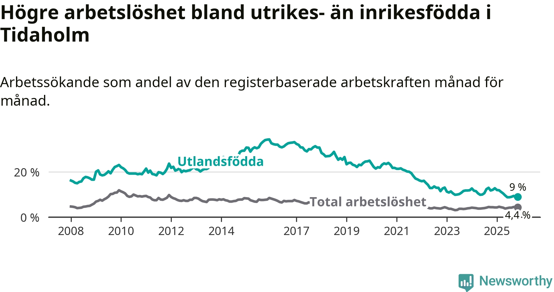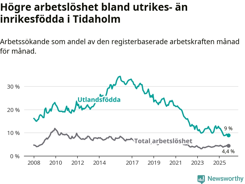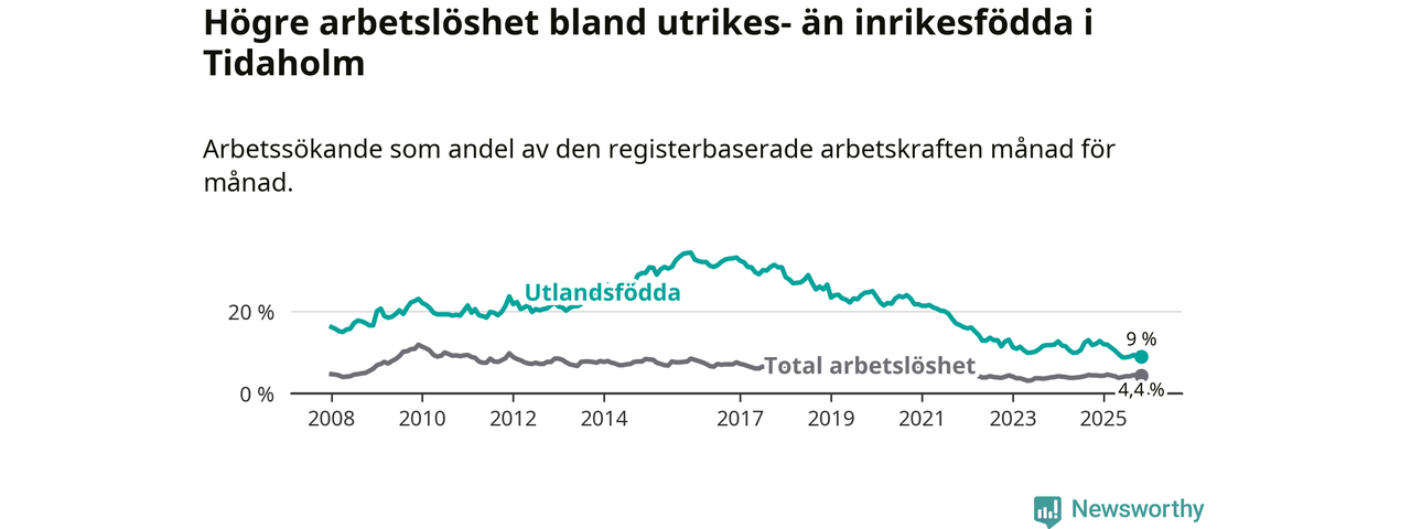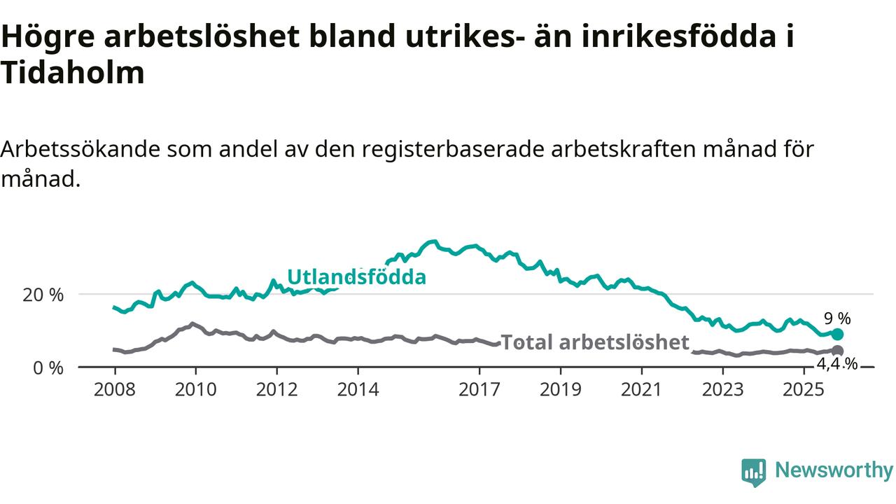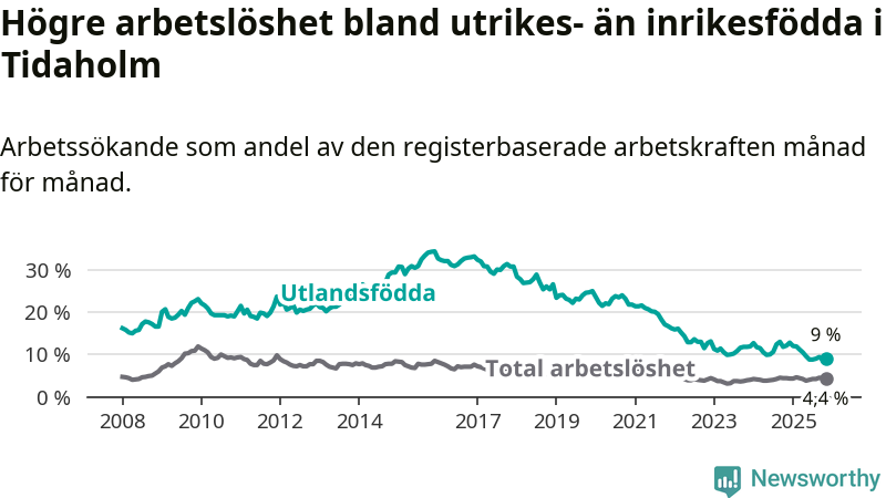 Skillnaden i arbetslöshet mellan utrikesfödda och hela befolkningen är 4,6 procentenheter i Tidaholm. Det är en betydligt mindre skillnad än för ett år sedan (−3,1 procentenheter).