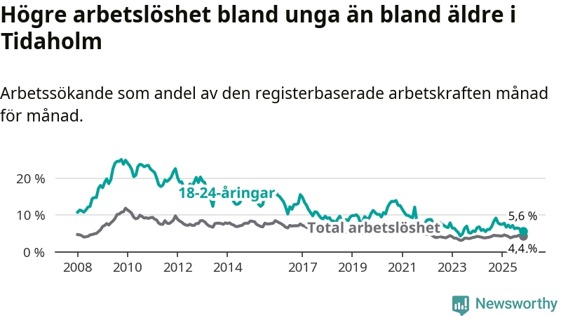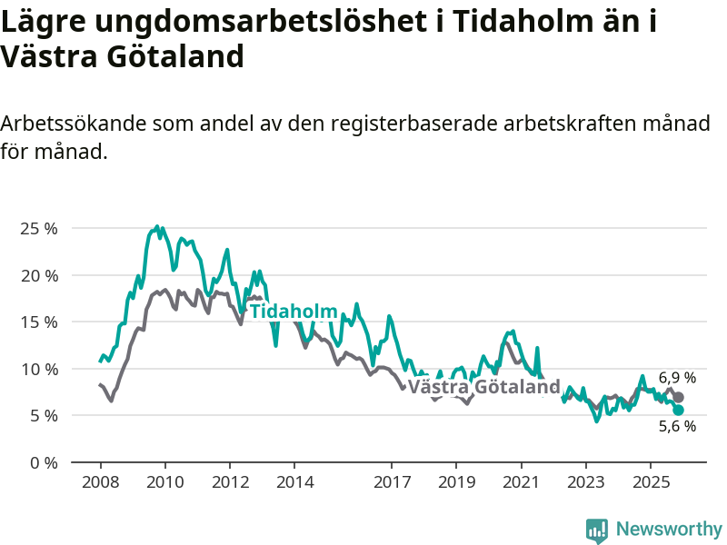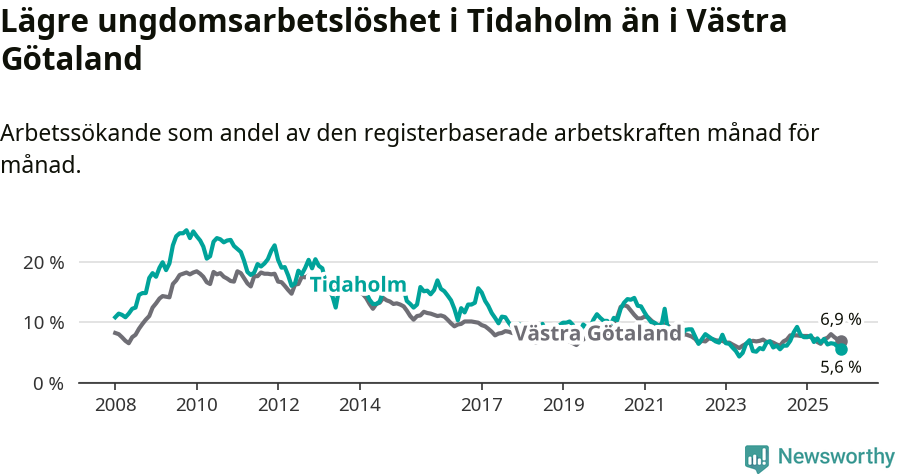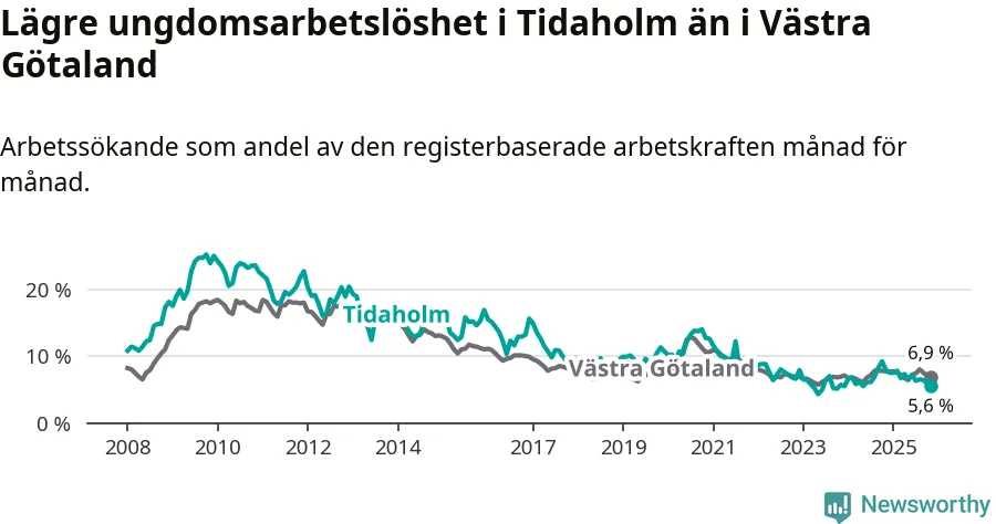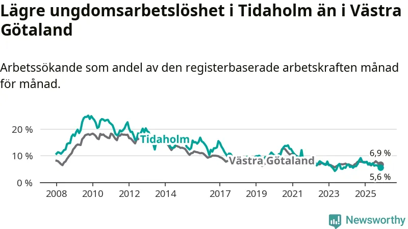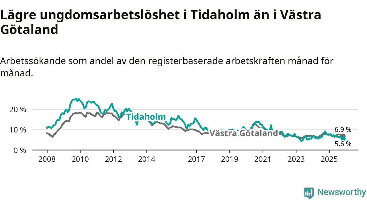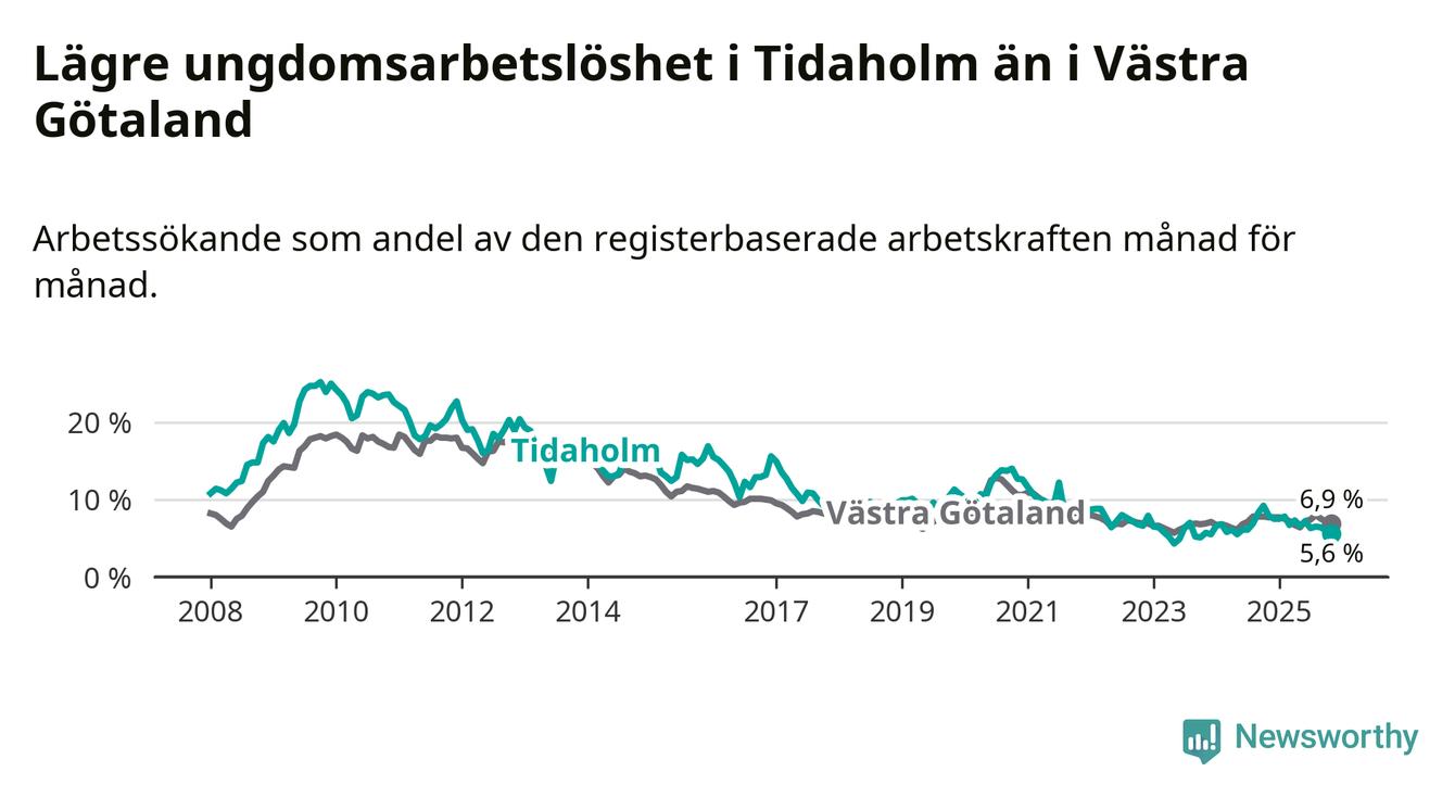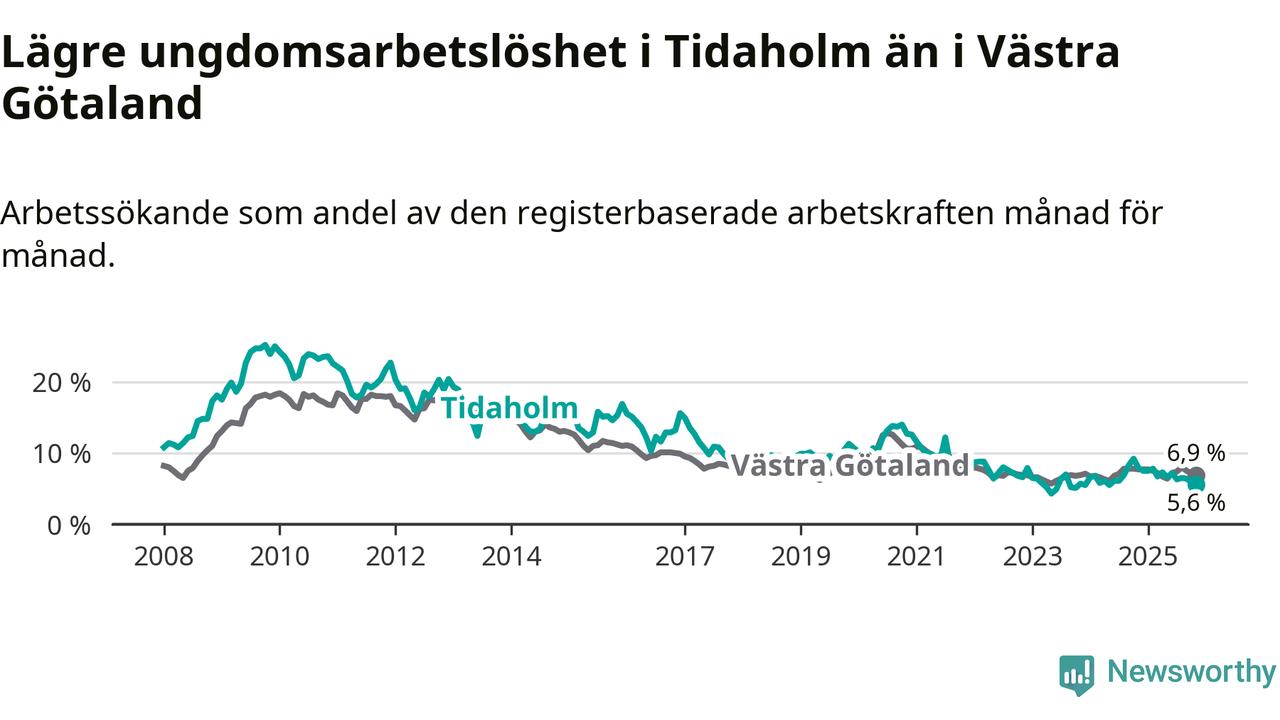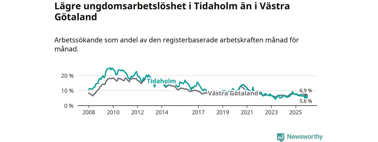 Precis som den totala arbetslösheten ligger ungdomsarbetslösheten i Tidaholm lägre än i Västra Götaland som helhet. Skillnaden mellan kommunen och länet är 1,3 procentenheter.