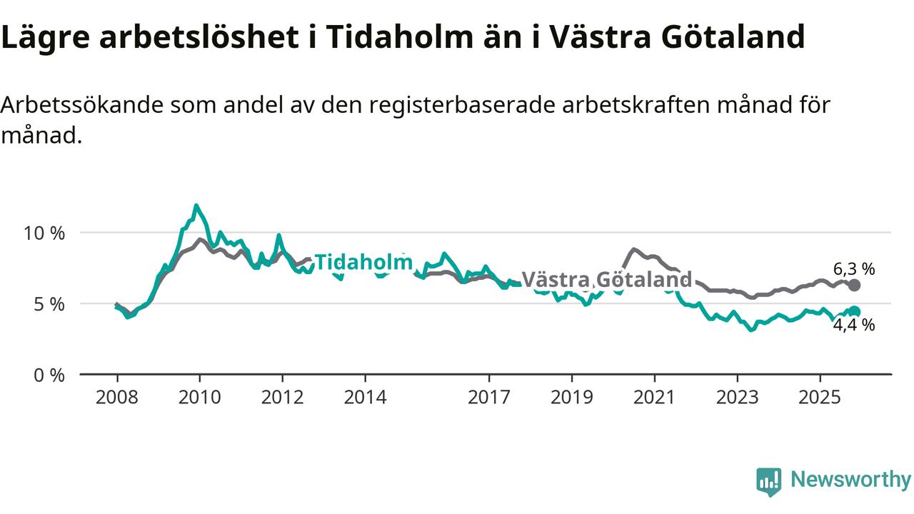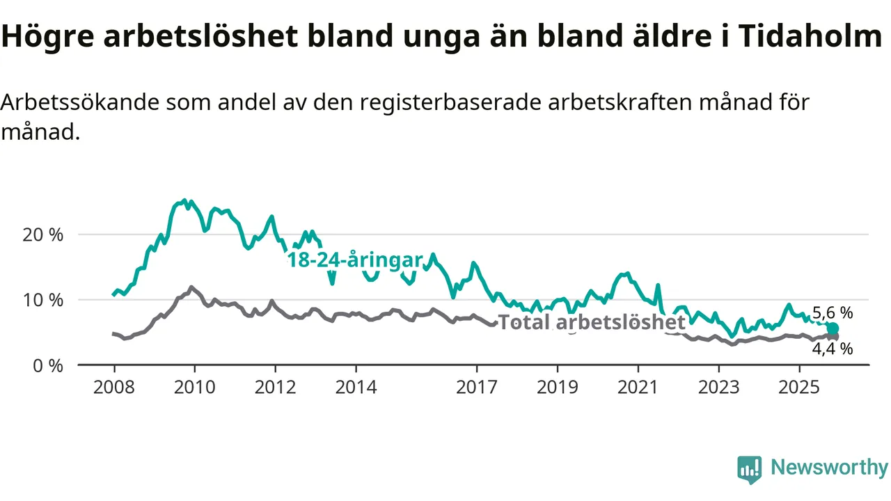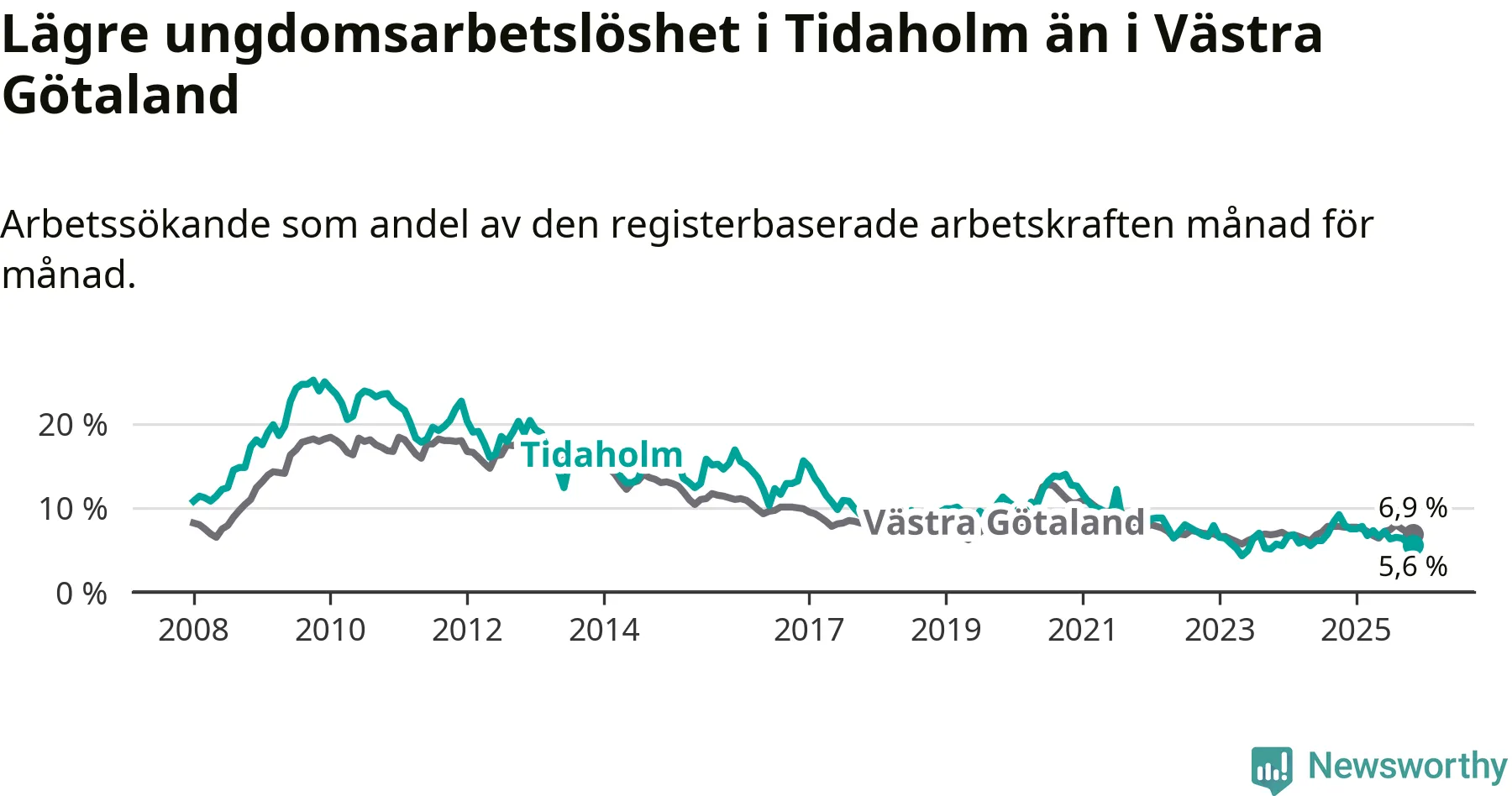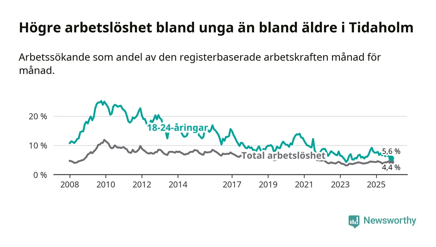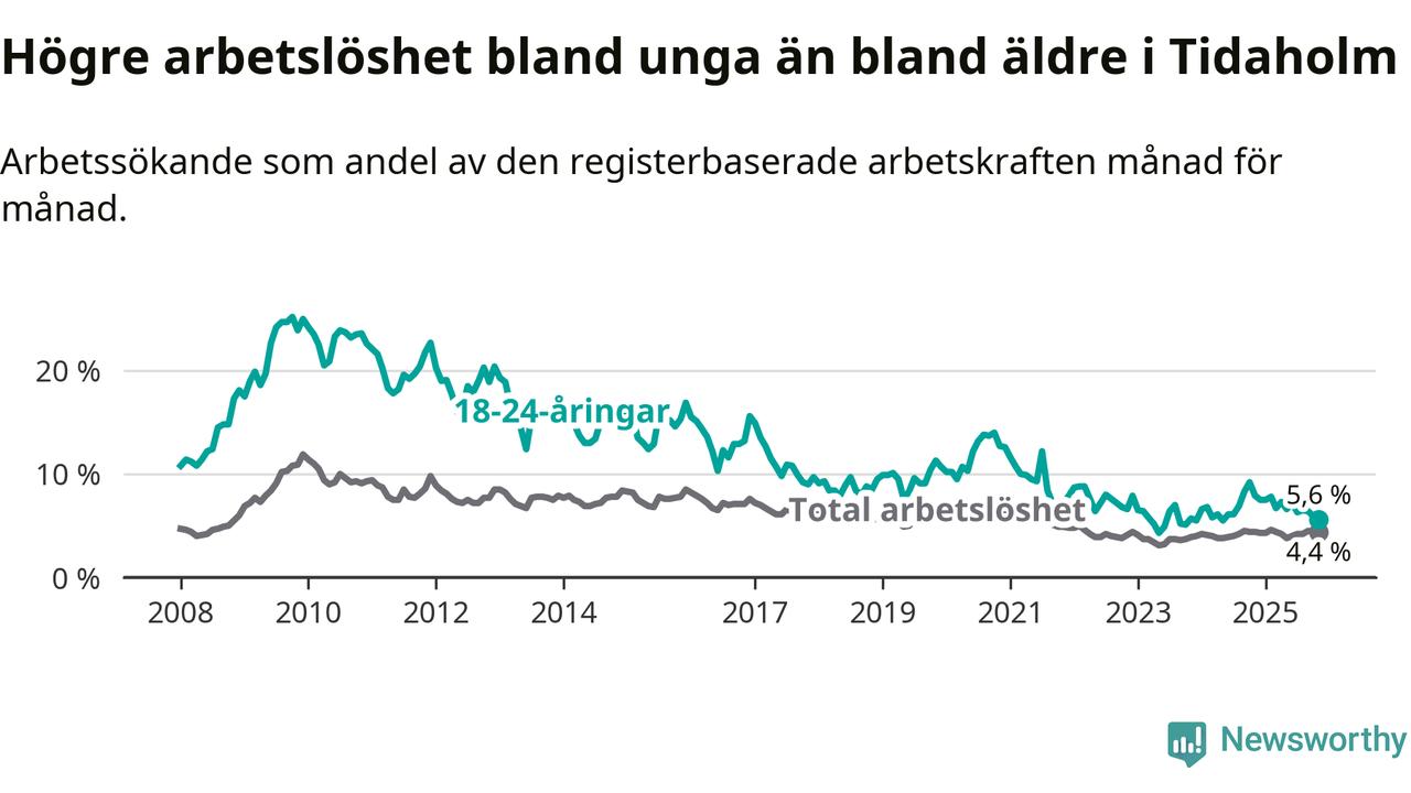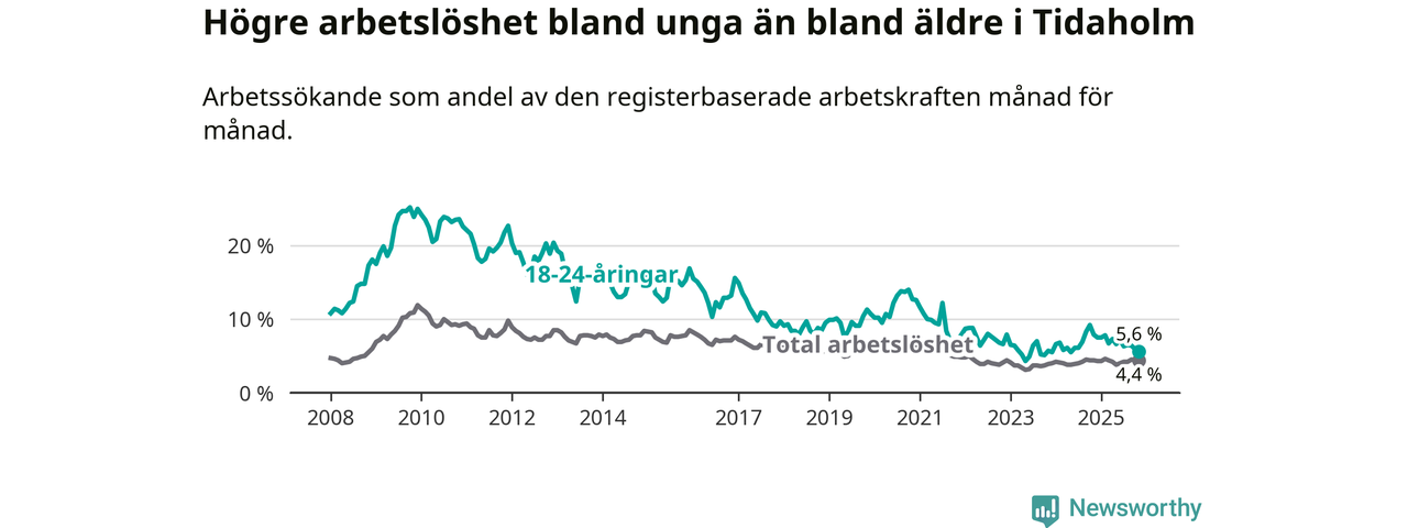 Precis som den totala arbetslösheten ligger ungdomsarbetslösheten i Tidaholm lägre än i Västra Götaland som helhet. Skillnaden mellan kommunen och länet är 1,3 procentenheter.