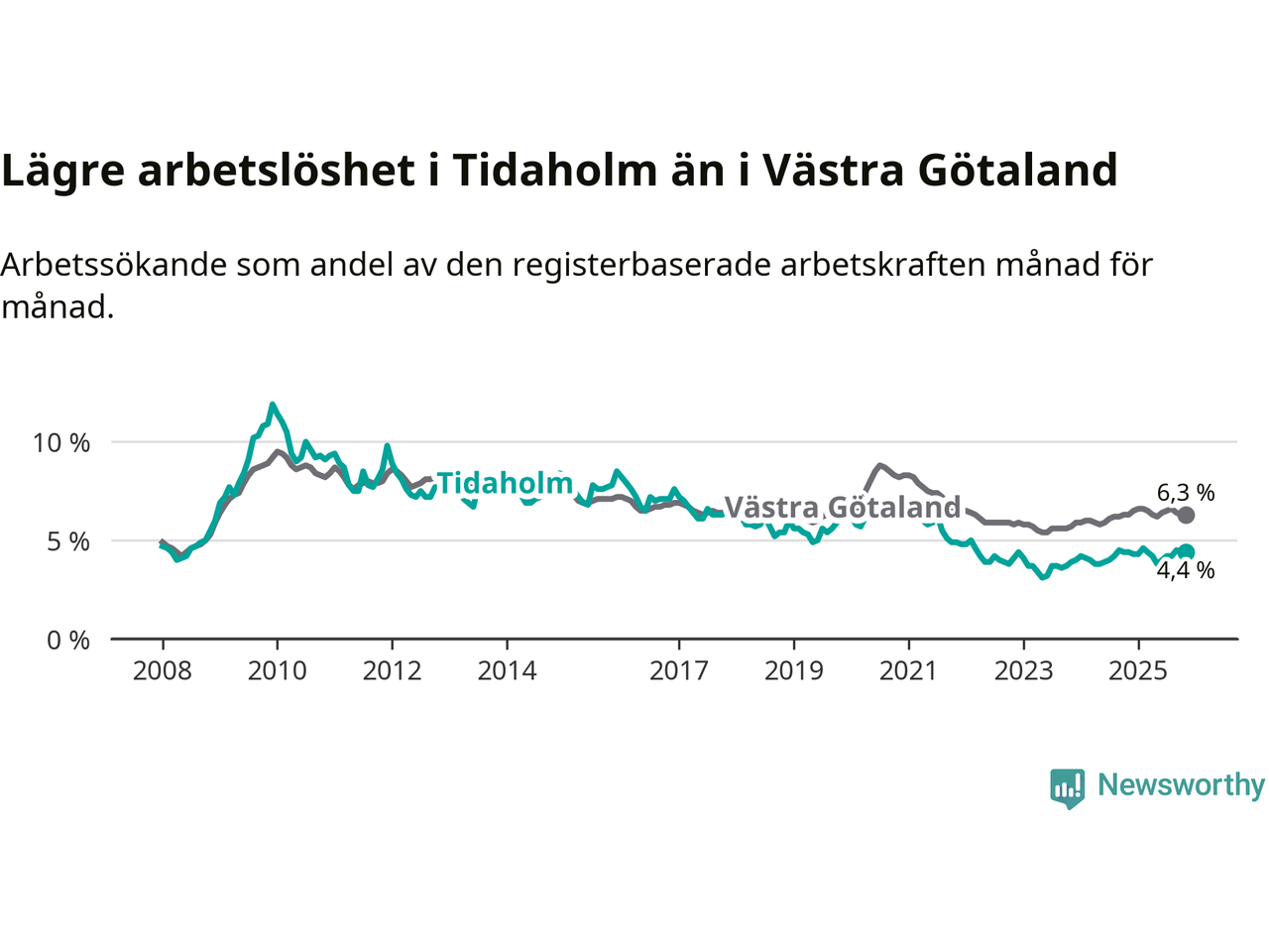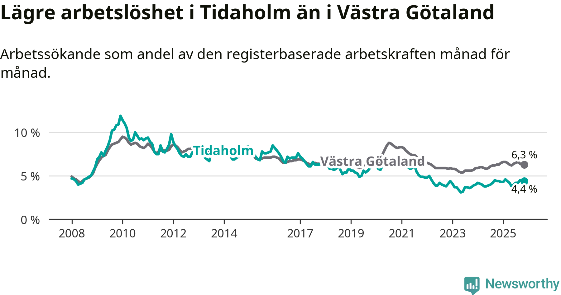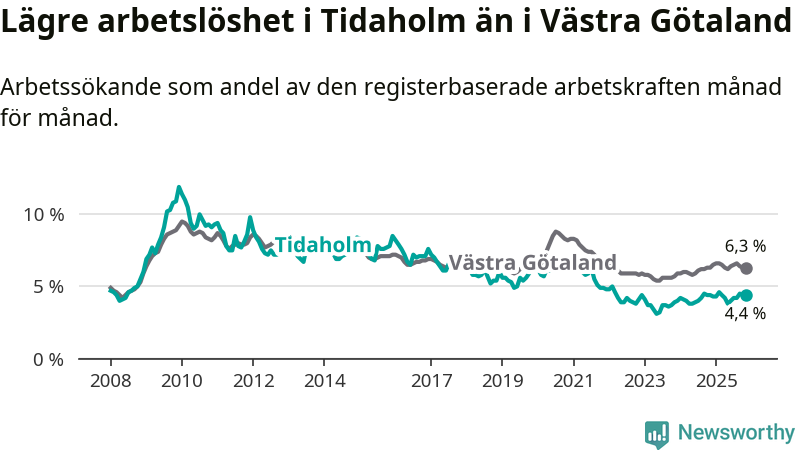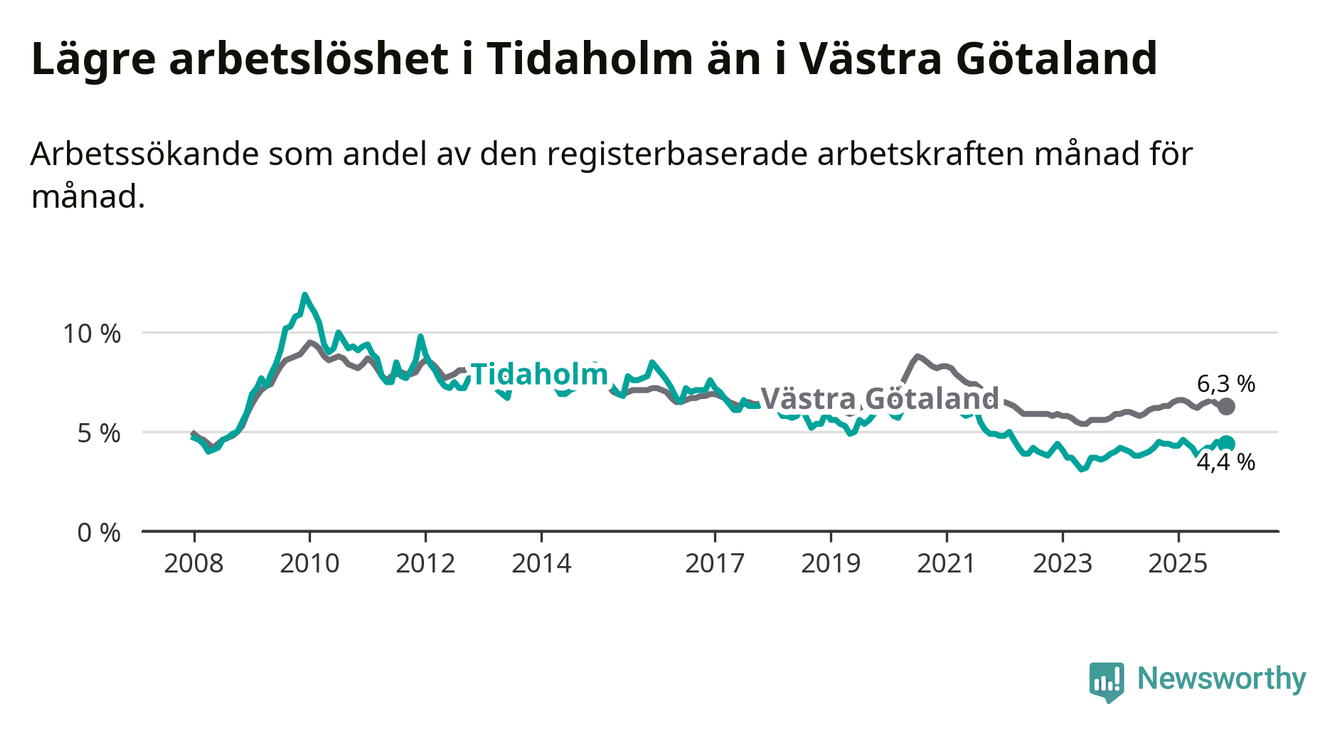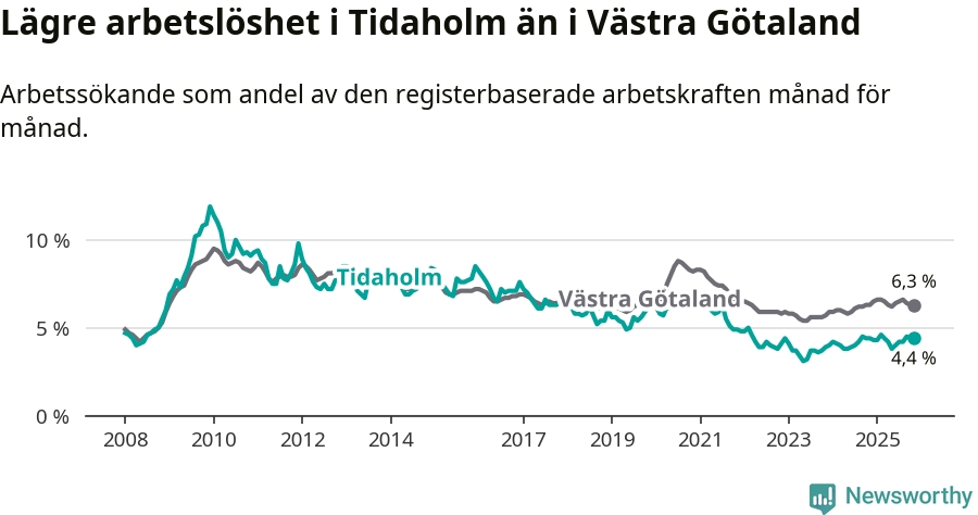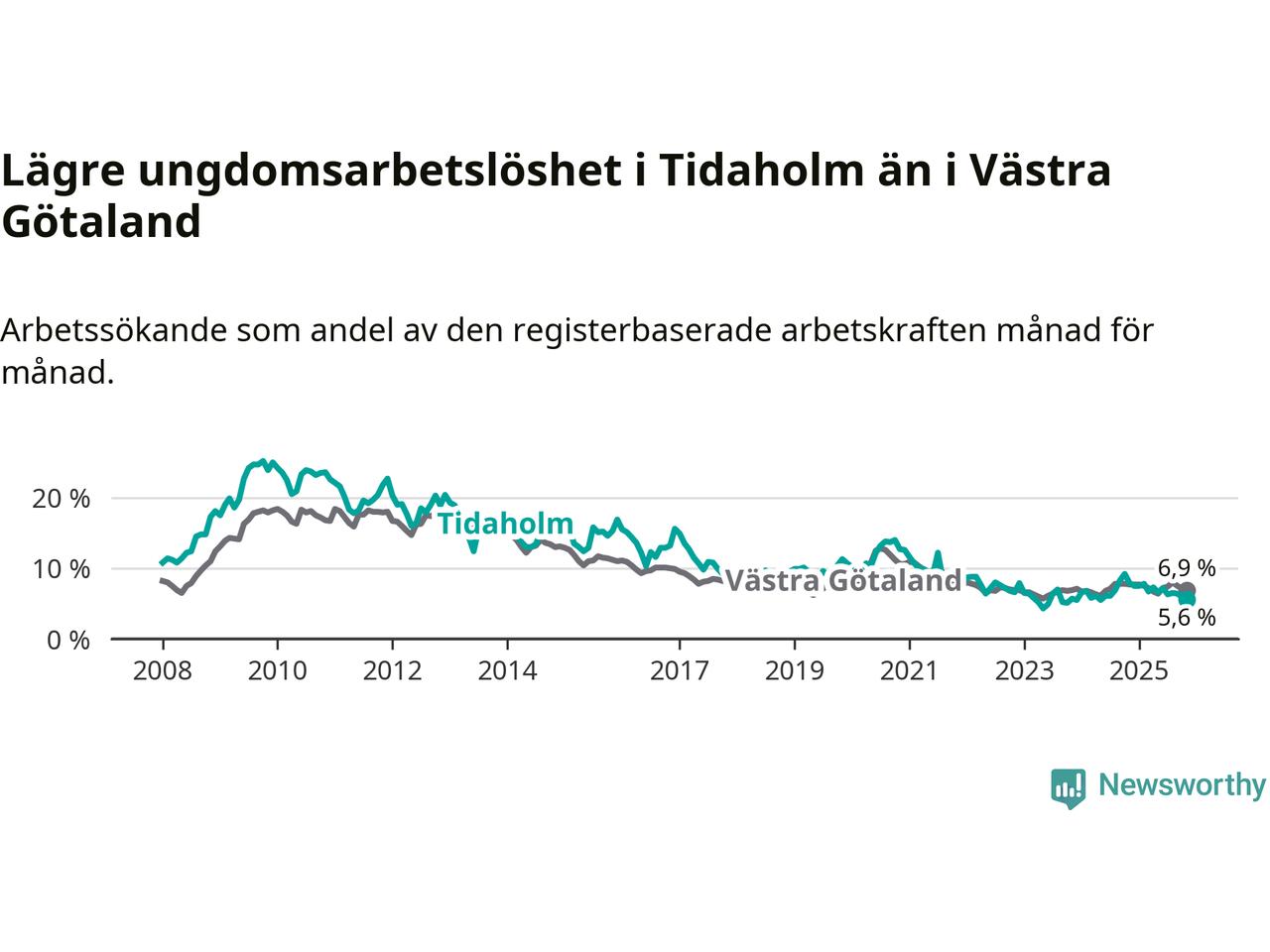 Precis som den totala arbetslösheten ligger ungdomsarbetslösheten i Tidaholm lägre än i Västra Götaland som helhet. Skillnaden mellan kommunen och länet är 1,3 procentenheter.