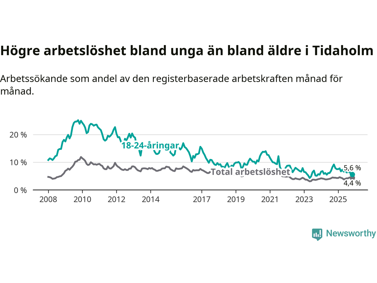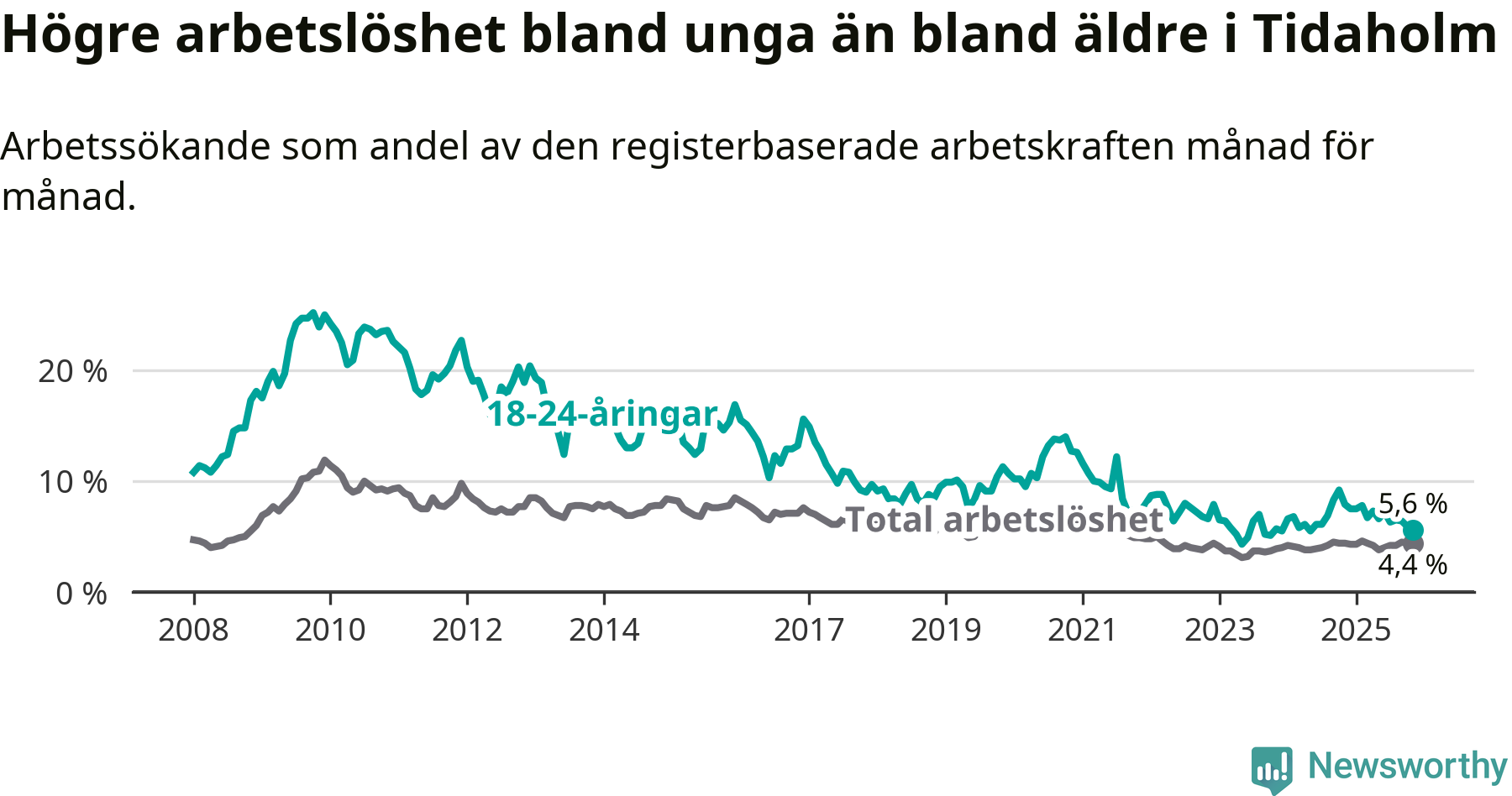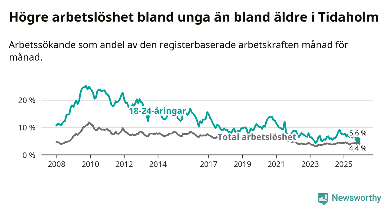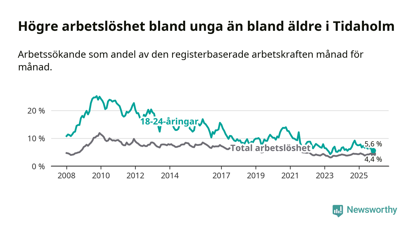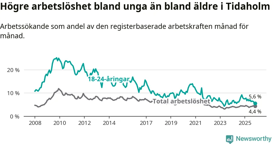 Till skillnad från den totala arbetslösheten sjunker arbetslösheten bland unga (−2,3 procentenheter). I november var 5,6 procent av 18–24-åringarna inskrivna som arbetssökande (motsvarande 34 personer). Mäter vi antalet inskrivna ser vi en minskning med 18 personer på ett års sikt.