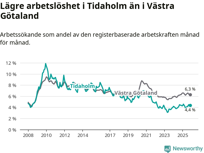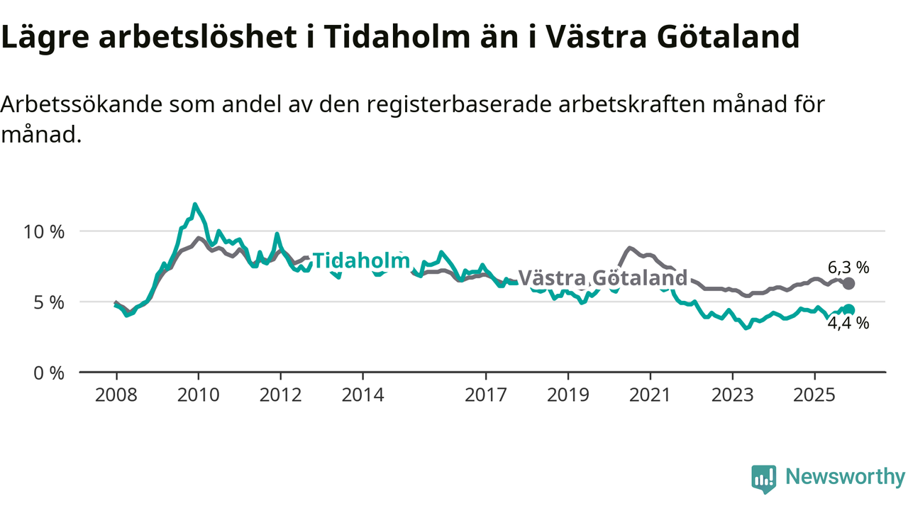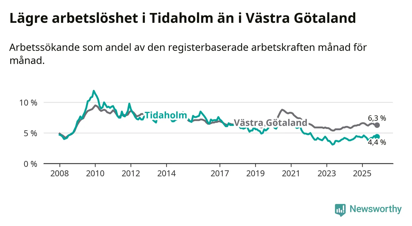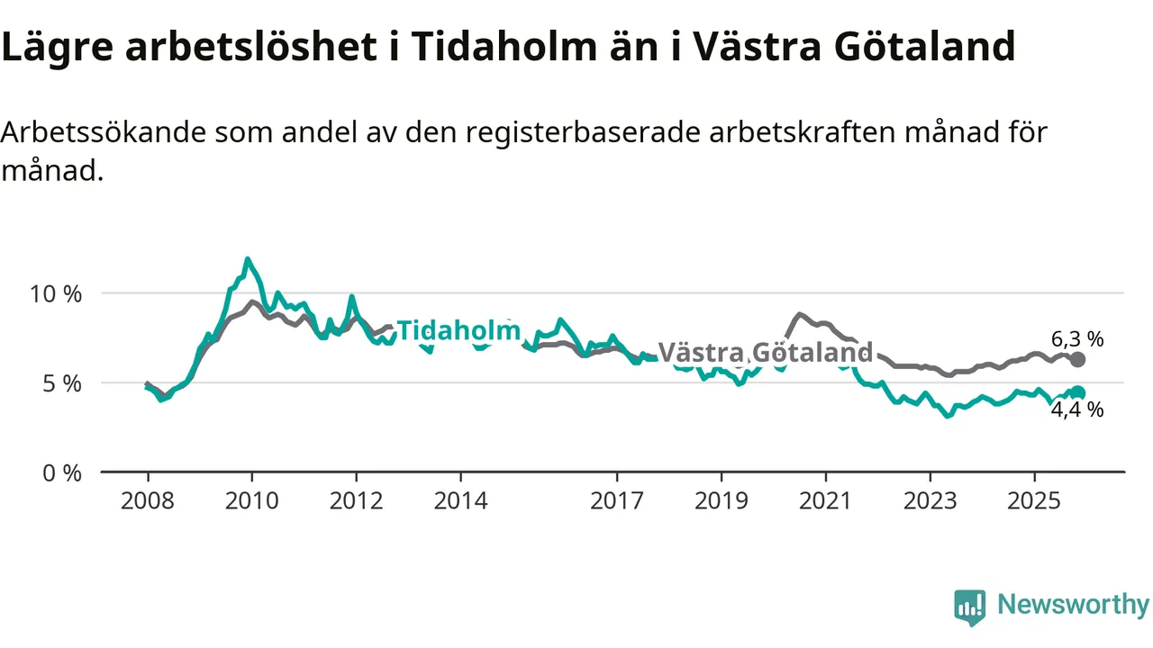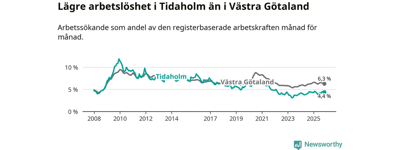 Under november månad rapporterade Tidaholms kommun en total arbetslöshet på 4,4 procent. Det är i samma nivå som i november i fjol. Även i Västra Götalands län står arbetslösheten stilla