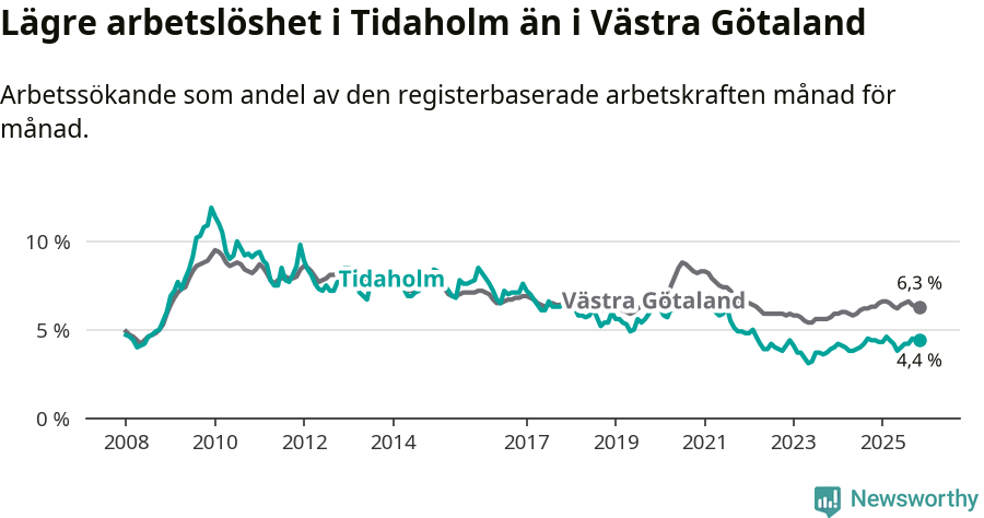 Arbetslösheten i Tidaholm ligger under nivån i hela Västra Götalands län (4,4 procent i kommunen, jämfört med 6,3 procent i hela länet). Öckerö har den lägsta arbetslösheten i länet (2,9 procent), medan Gullspång har den högsta (8,6 procent). För att Tidaholm skulle komma ner i samma arbetslöshetsnivå som Öckerö skulle 91 personer behöva sysselsättas.
