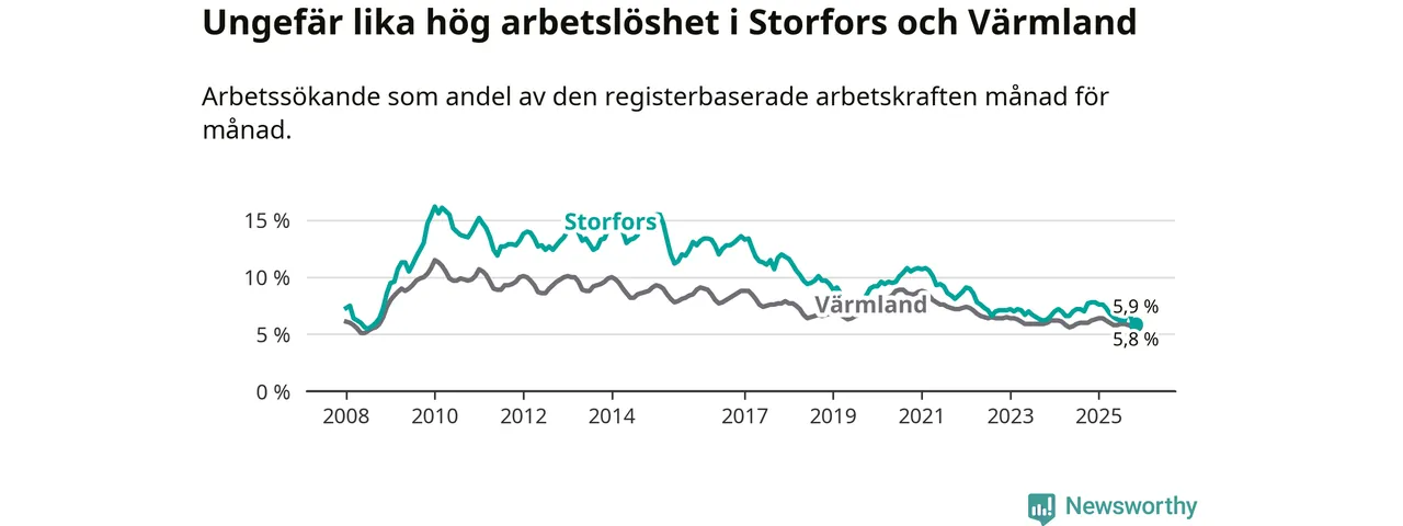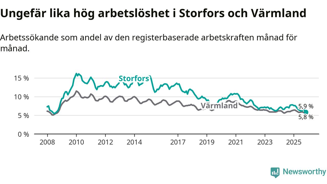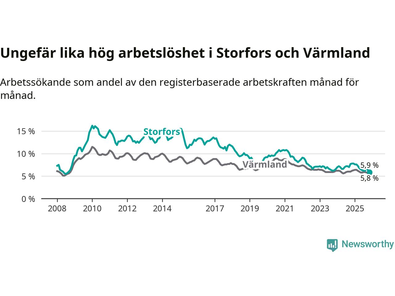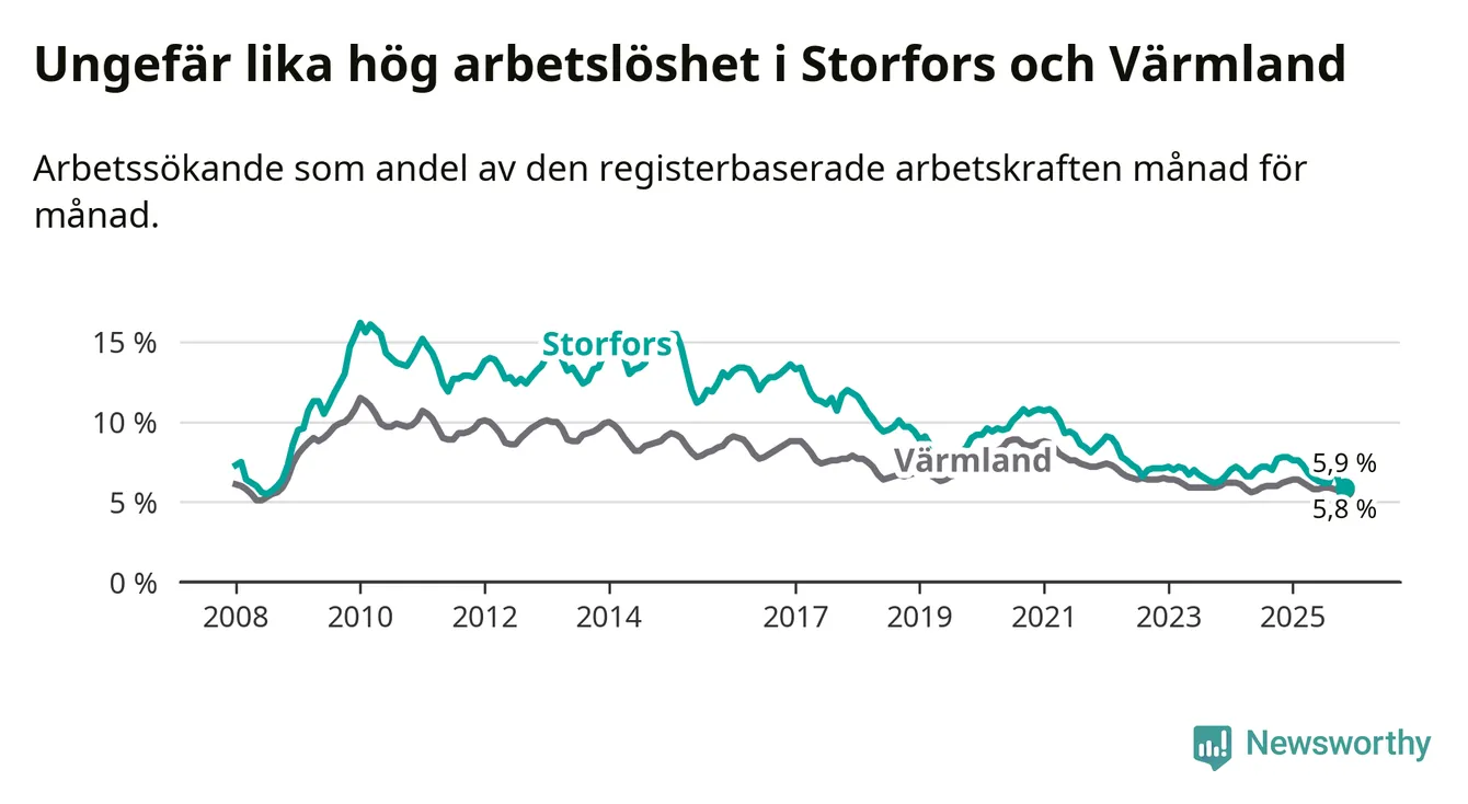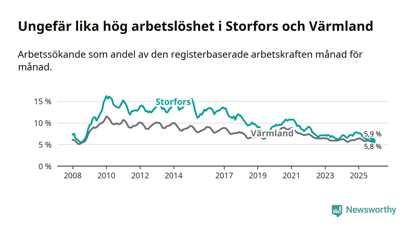 Under november månad rapporterade Storfors kommun en total arbetslöshet på 5,9 procent. Det är en minskning jämfört med samma tidpunkt i fjol (−1,9 procentenheter). Även i Värmlands län sjunker arbetslösheten .