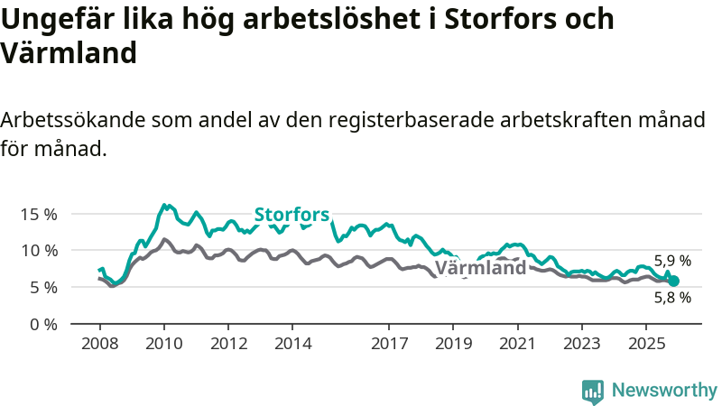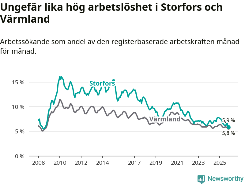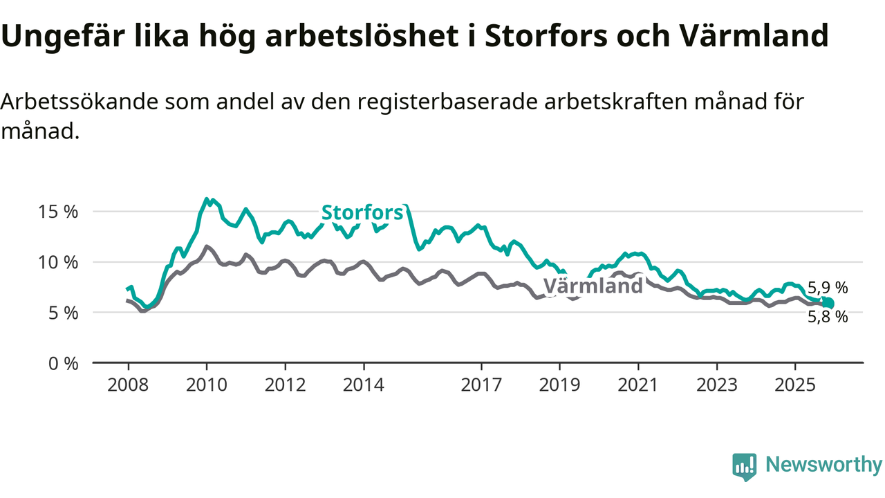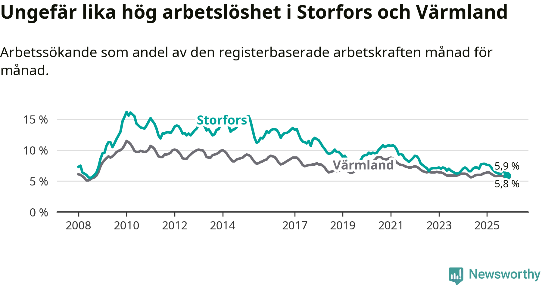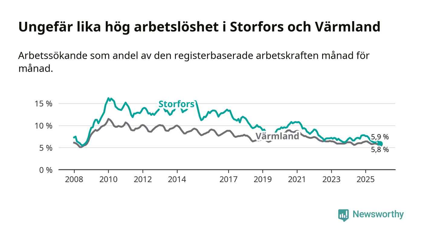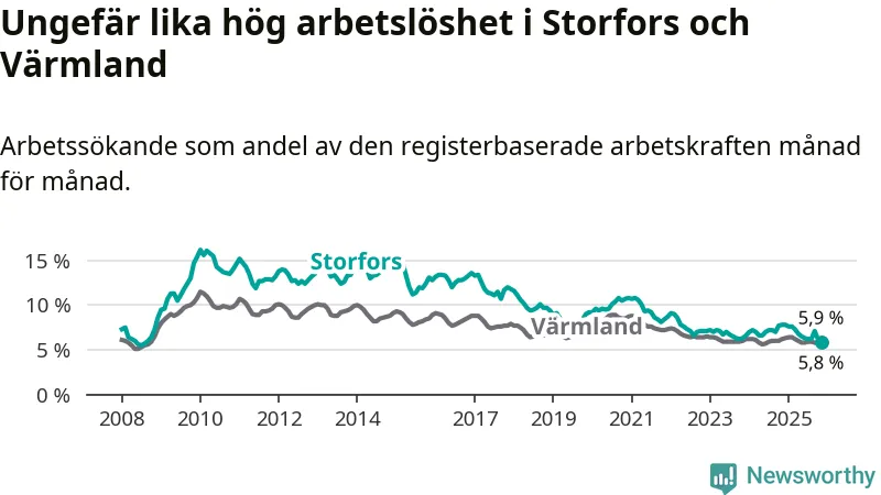 Under november månad rapporterade Storfors kommun en total arbetslöshet på 5,9 procent. Det är en minskning jämfört med samma tidpunkt i fjol (−1,9 procentenheter). Även i Värmlands län sjunker arbetslösheten .