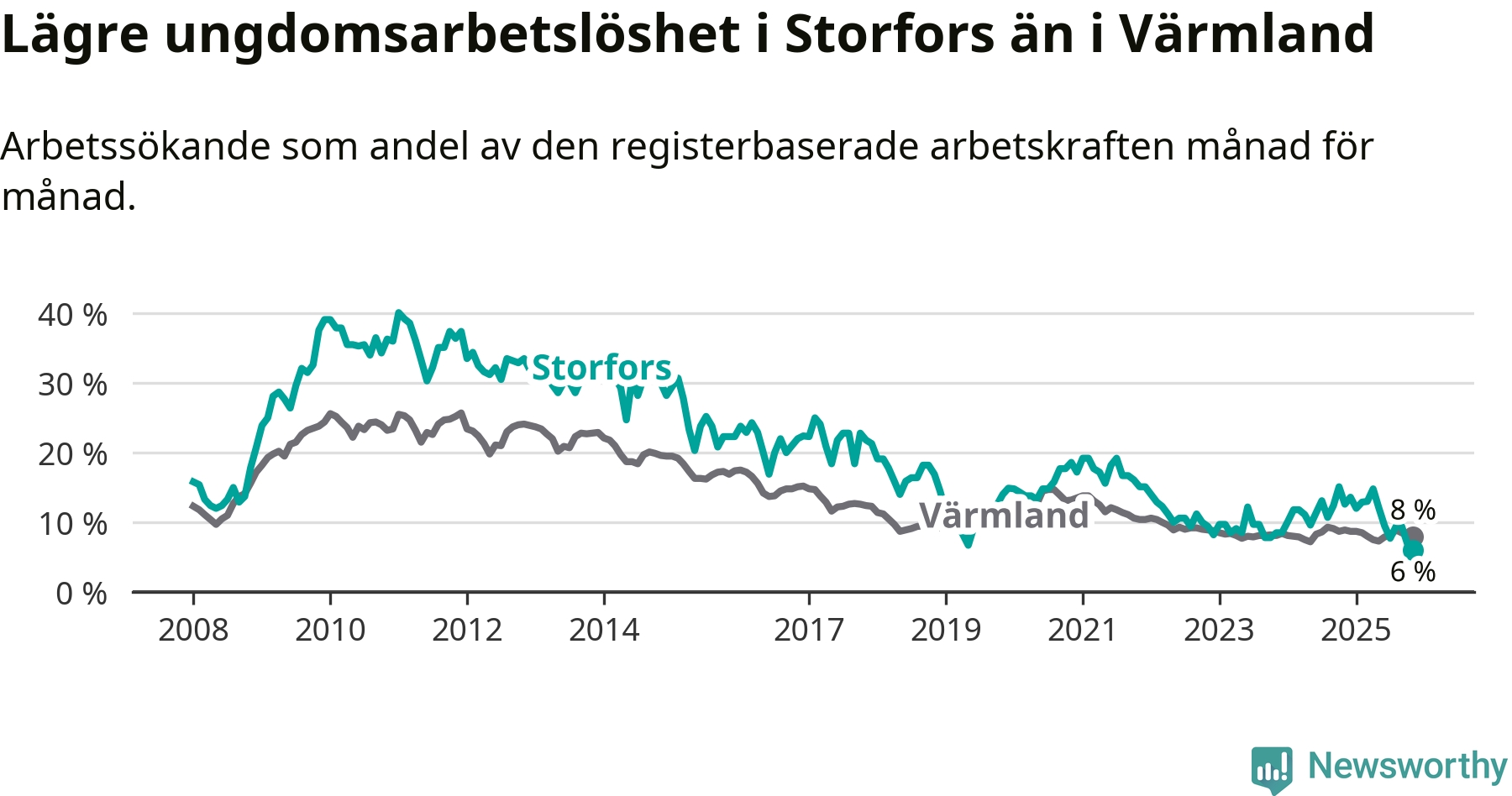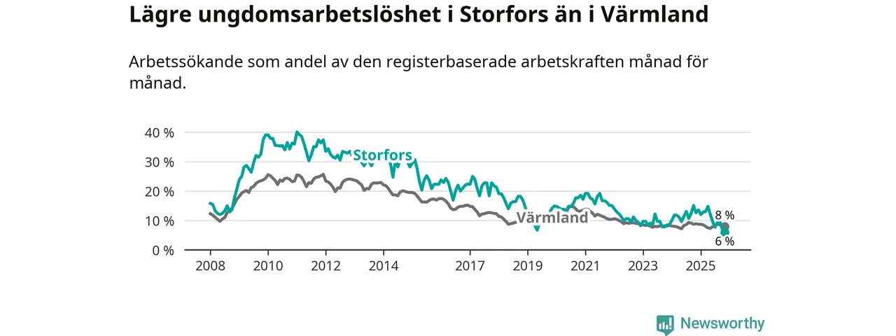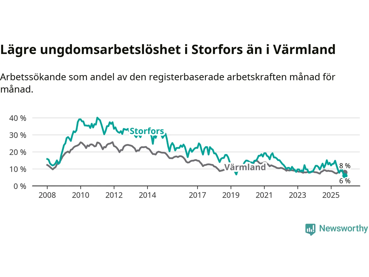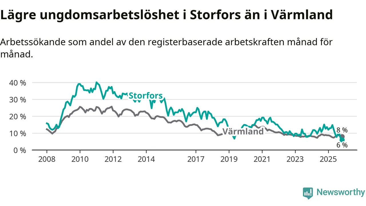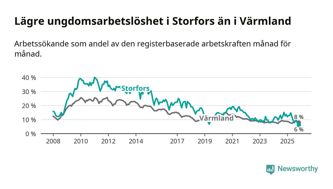 Medan Storfors har ungefär samma total arbetslöshet som Värmland, ligger ungdomsarbetslösheten 2,0 procentenheter lägre i Storfors.