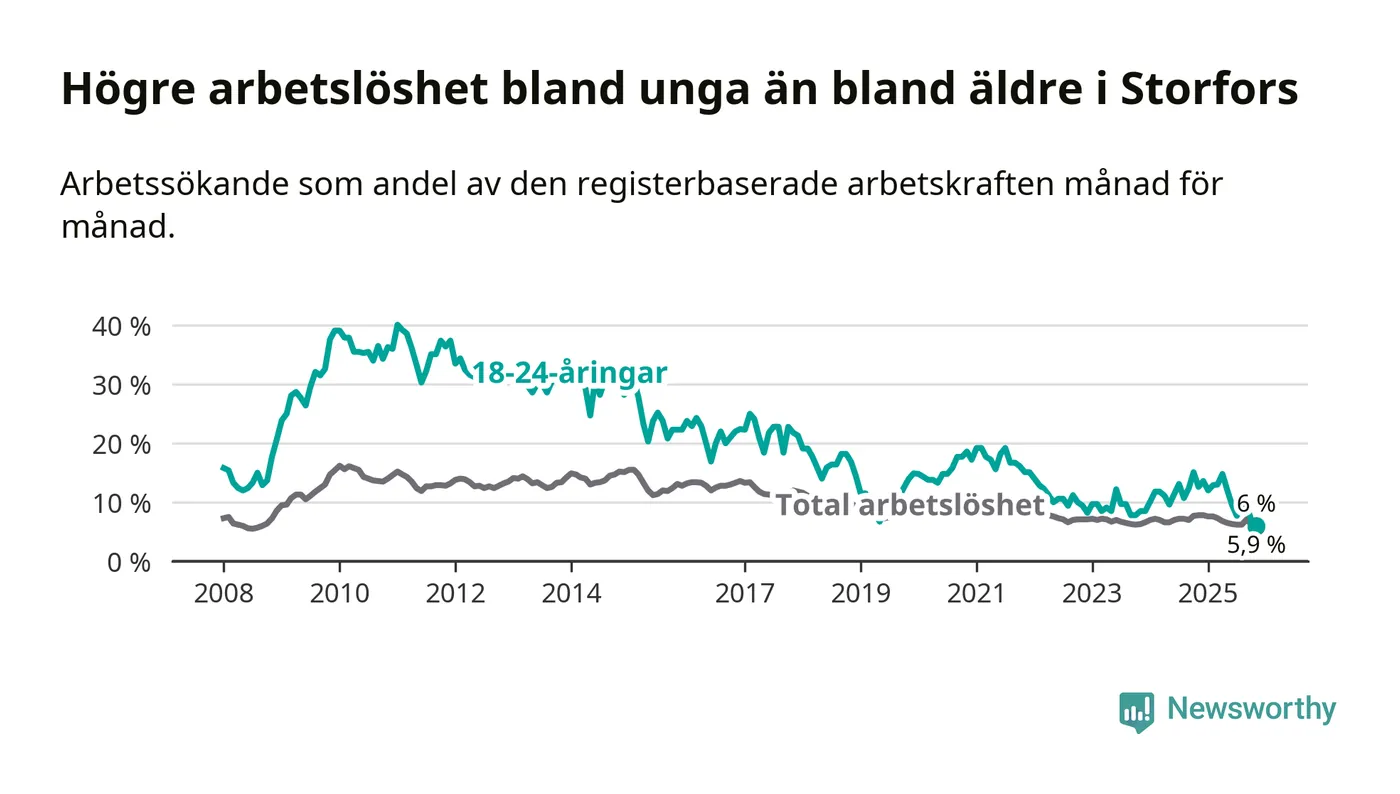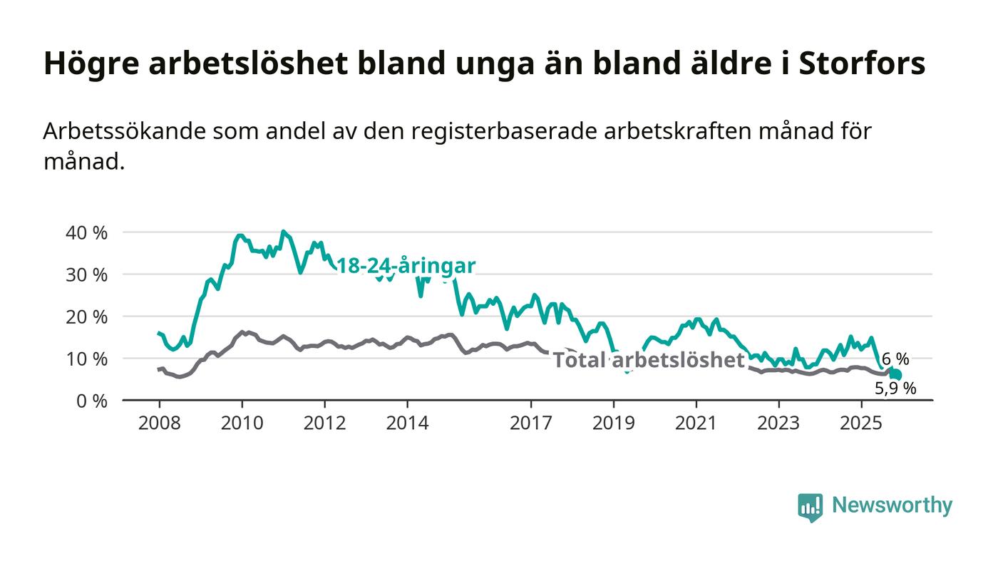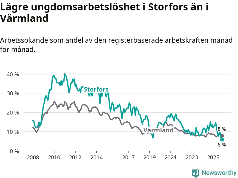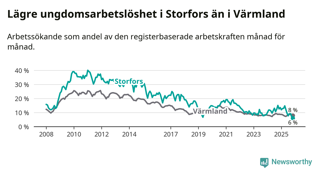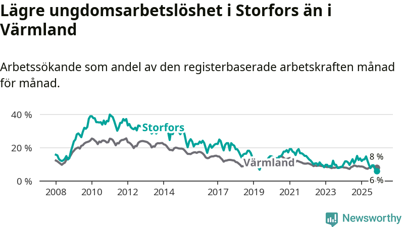 Medan Storfors har ungefär samma total arbetslöshet som Värmland, ligger ungdomsarbetslösheten 2,0 procentenheter lägre i Storfors.