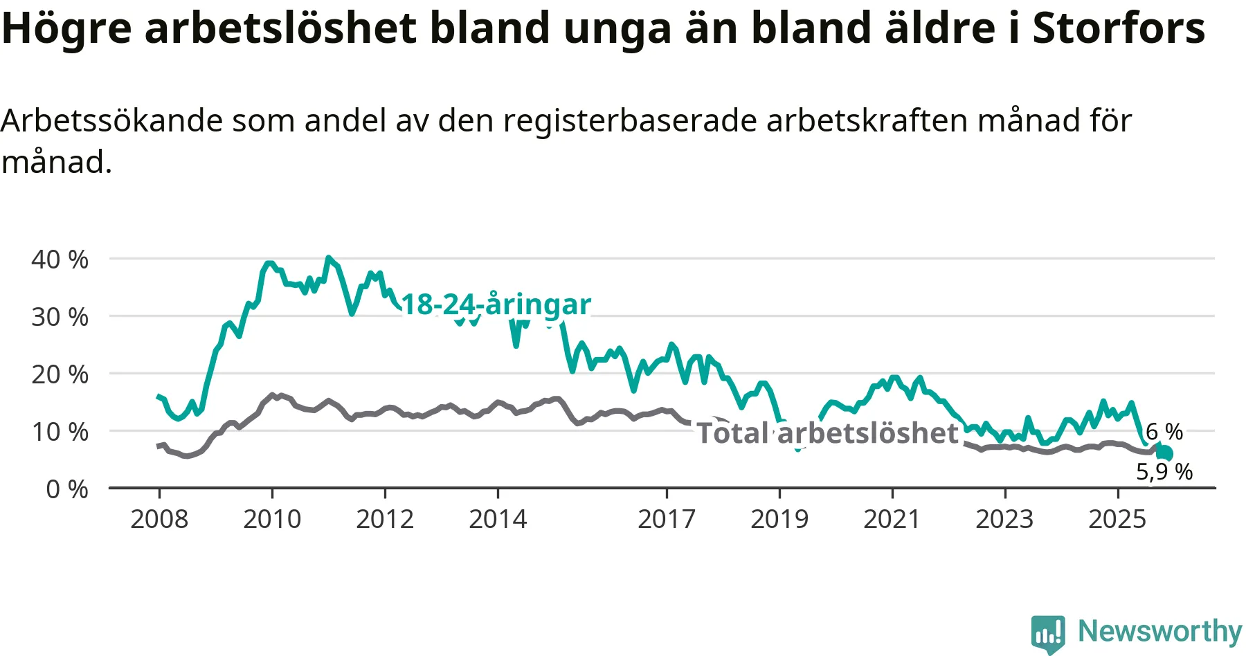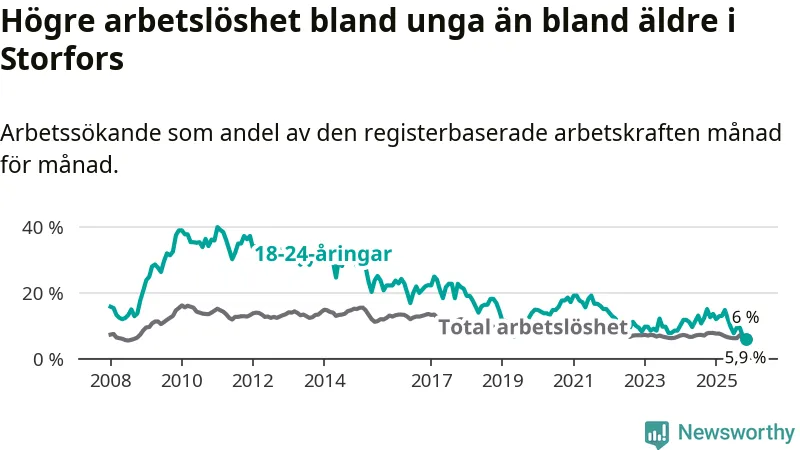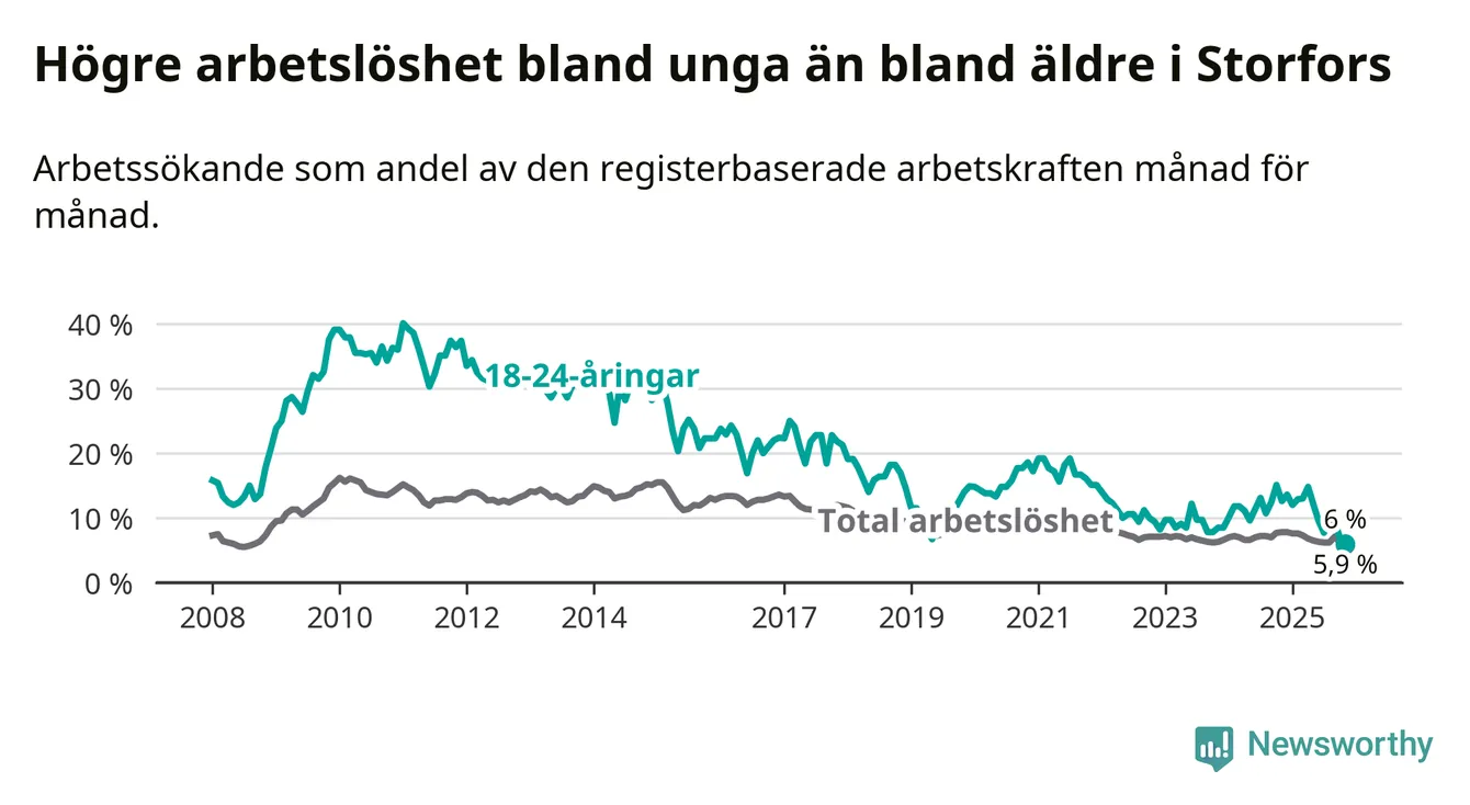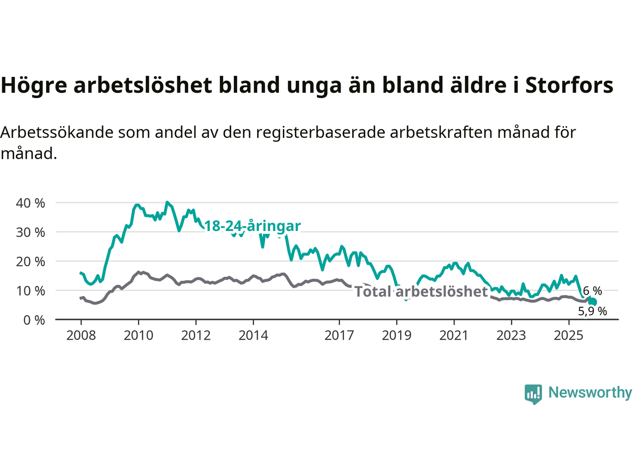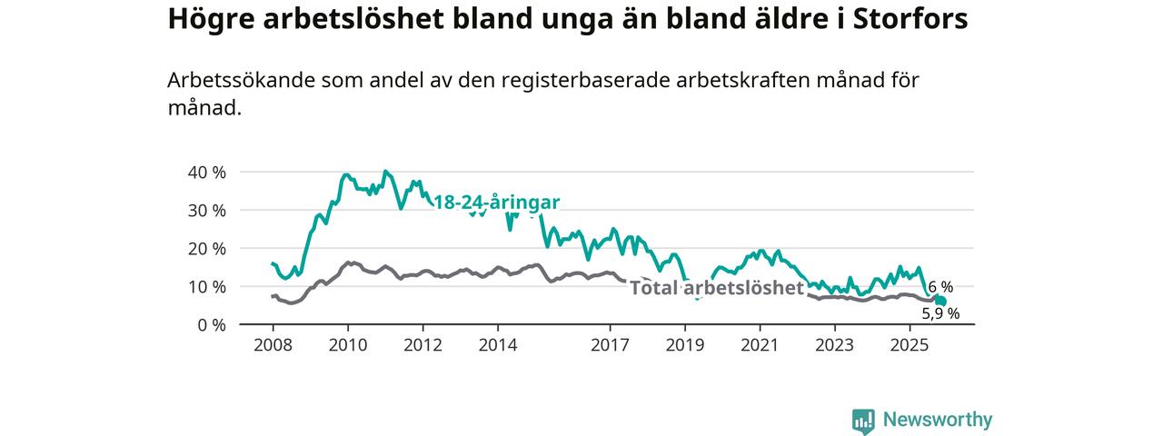 Medan Storfors har ungefär samma total arbetslöshet som Värmland, ligger ungdomsarbetslösheten 2,0 procentenheter lägre i Storfors.