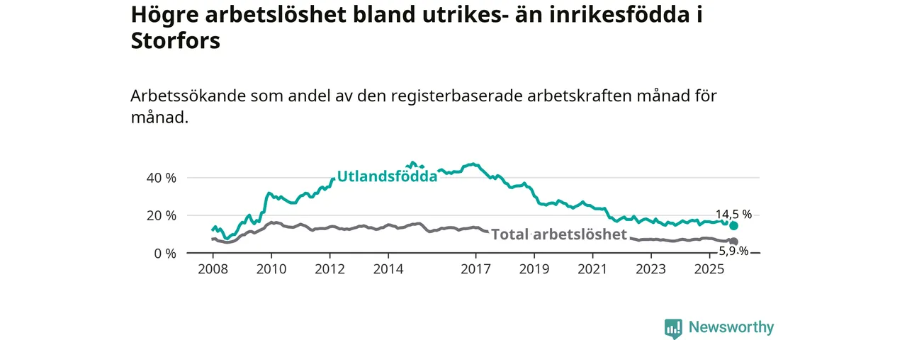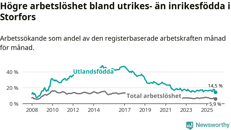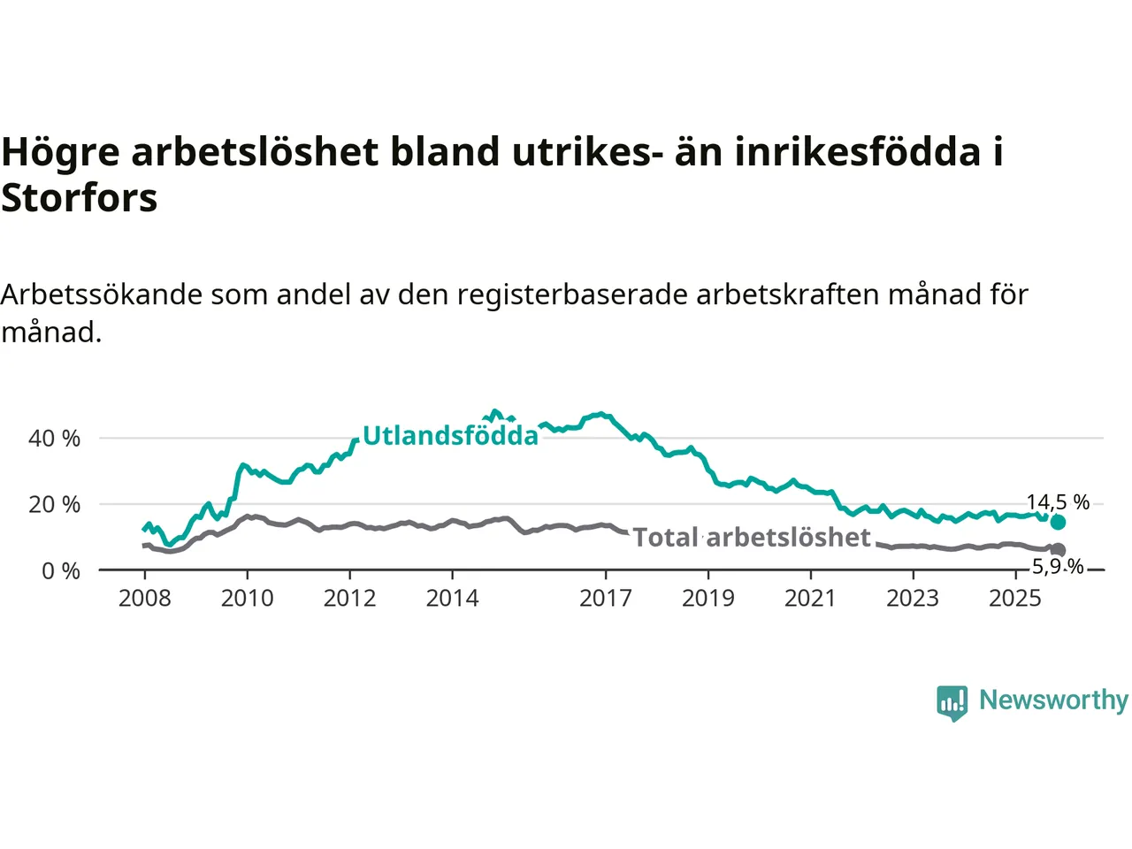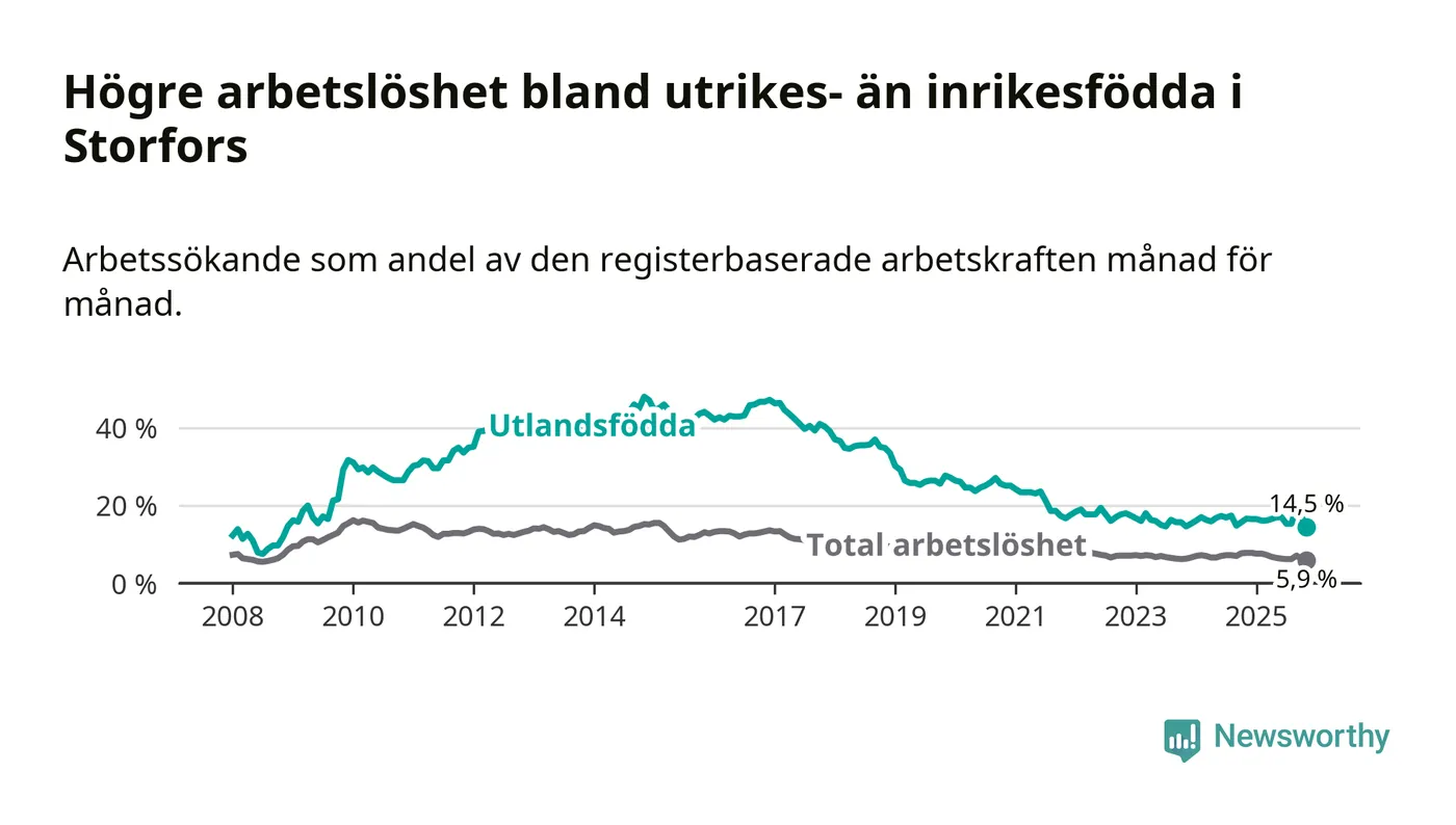 Skillnaden i arbetslöshet mellan utrikesfödda och hela befolkningen är 8,6 procentenheter i Storfors.