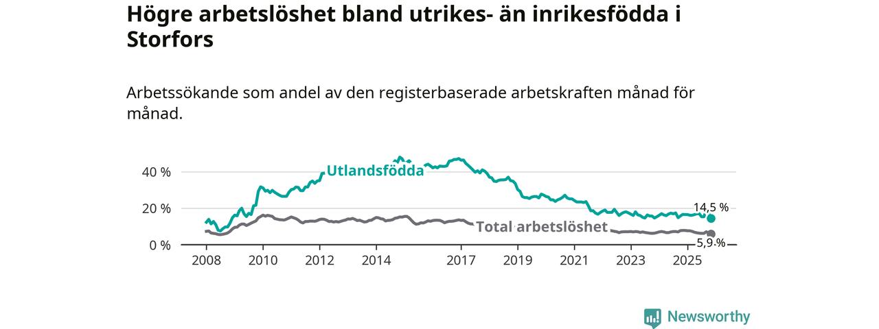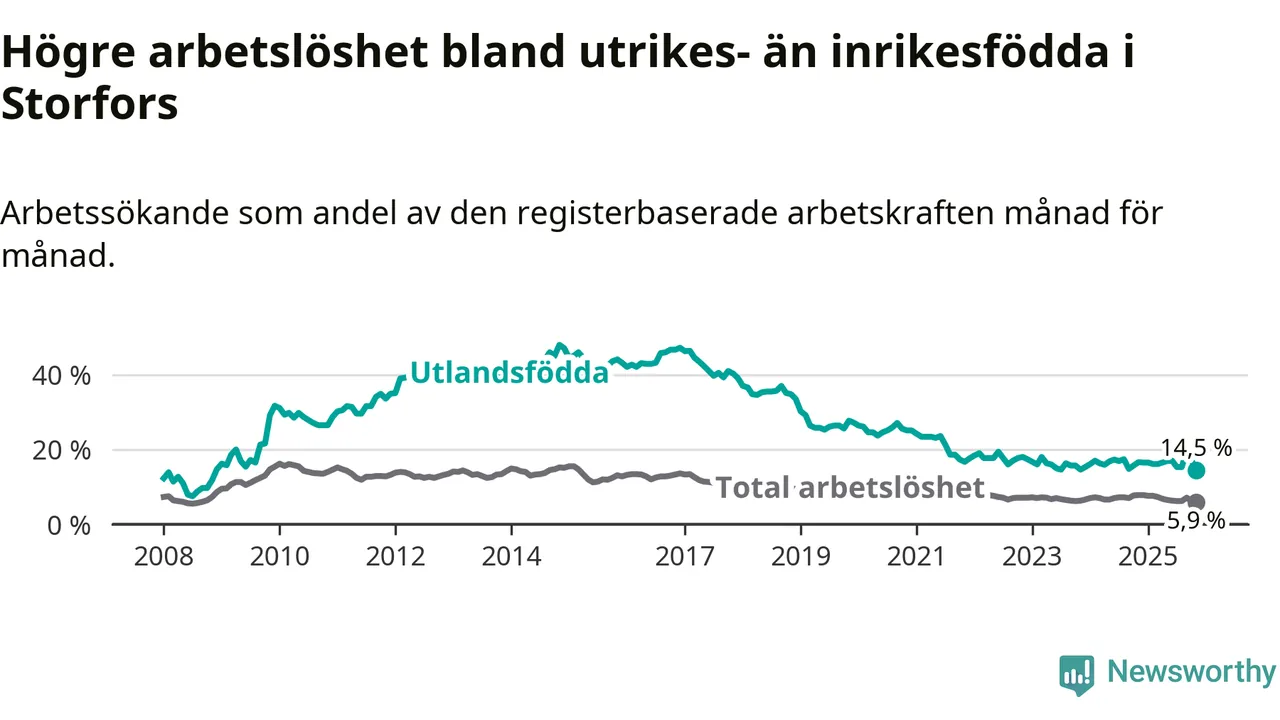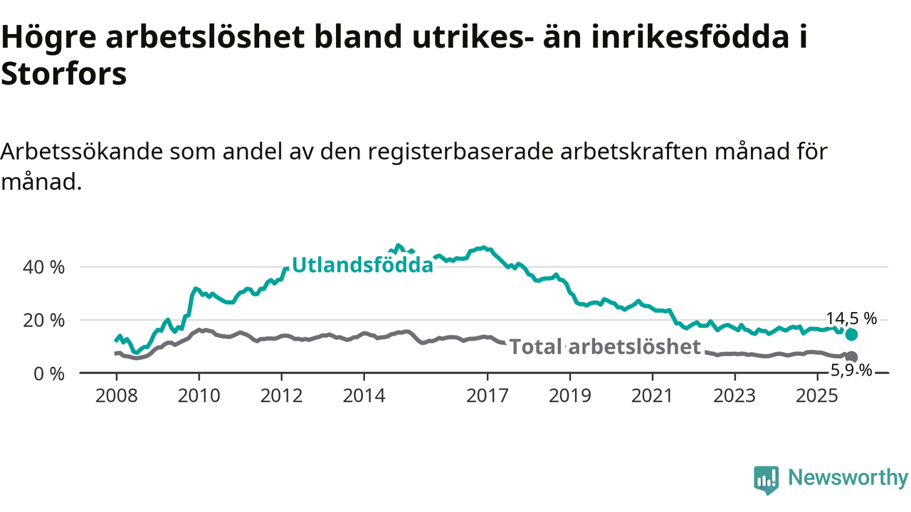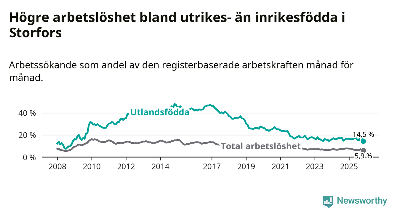 | Bland utlandsfödda | 14,5 % | −2,1 % ▼ | 14,5 % | −1,2 % ▼ | 14,3 % | −1,1 % ▼ |