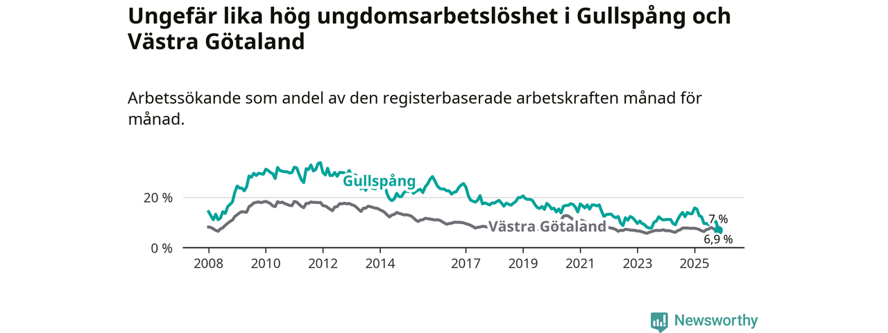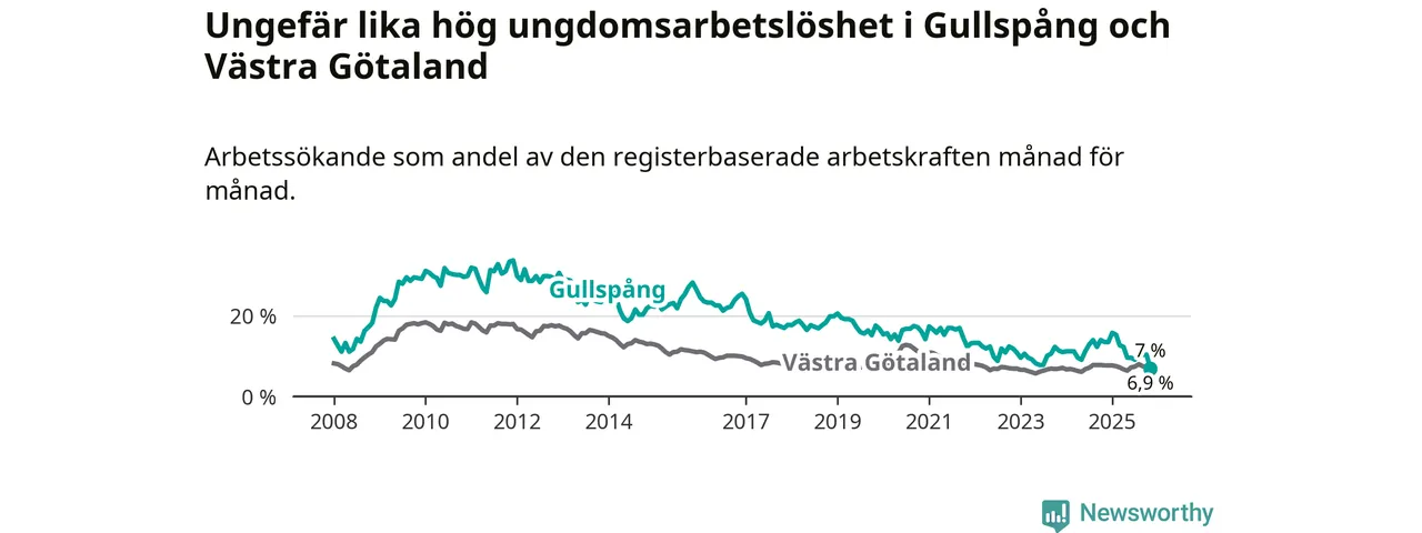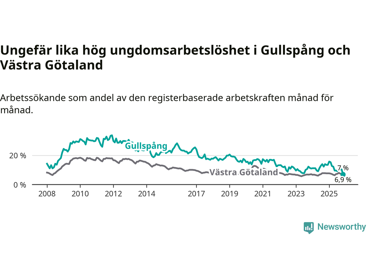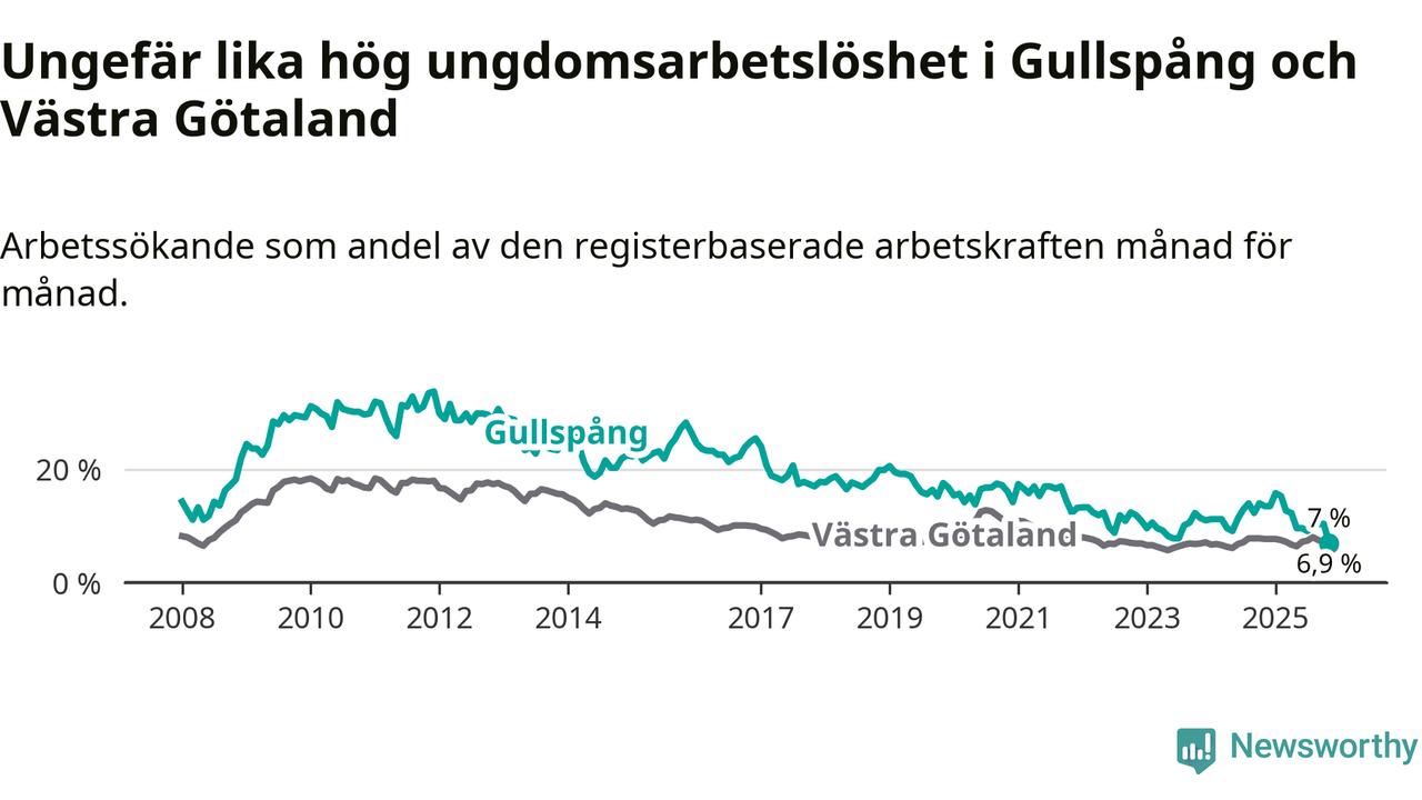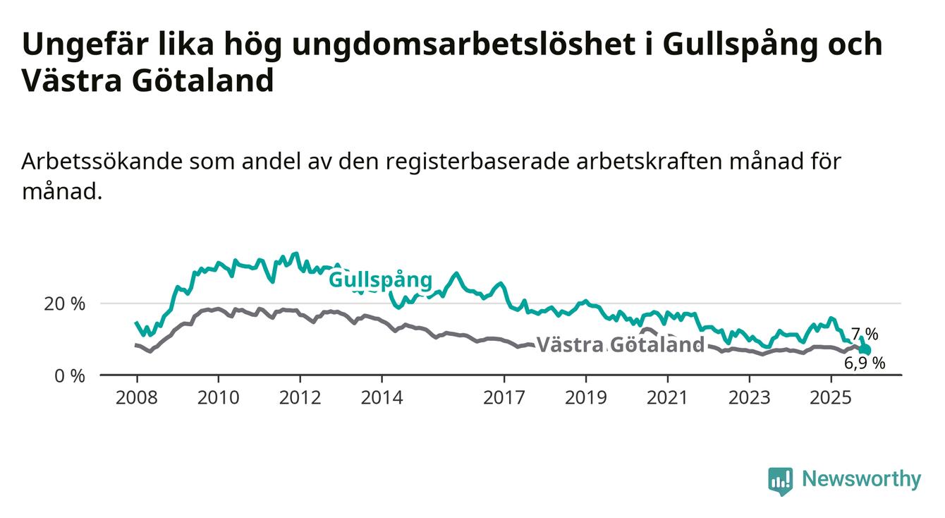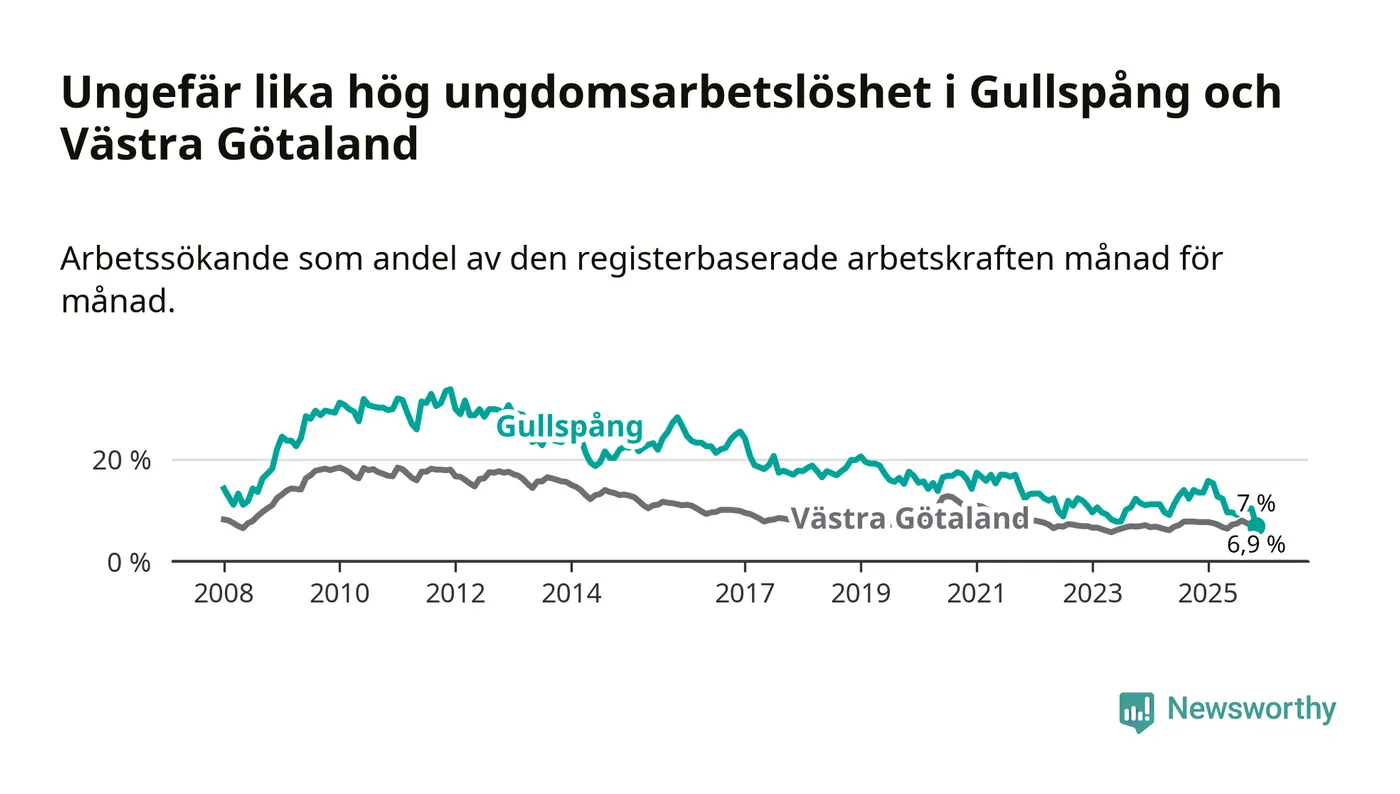 Medan Gullspång har högre total arbetslöshet än Västra Götaland, ligger ungdomsarbetslösheten på i stort sett samma nivå.