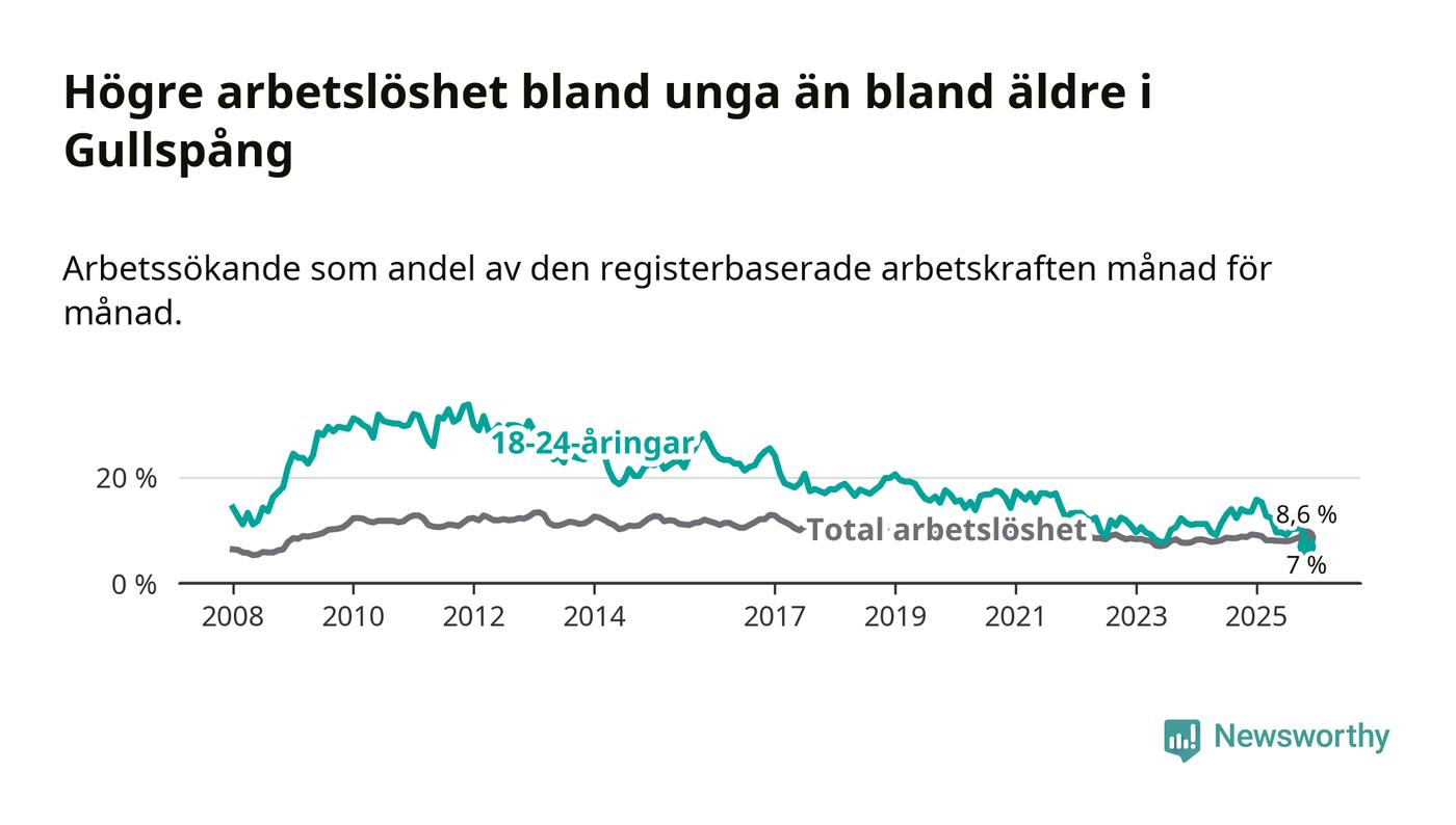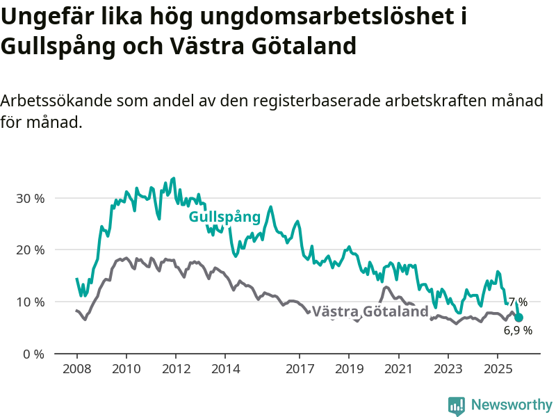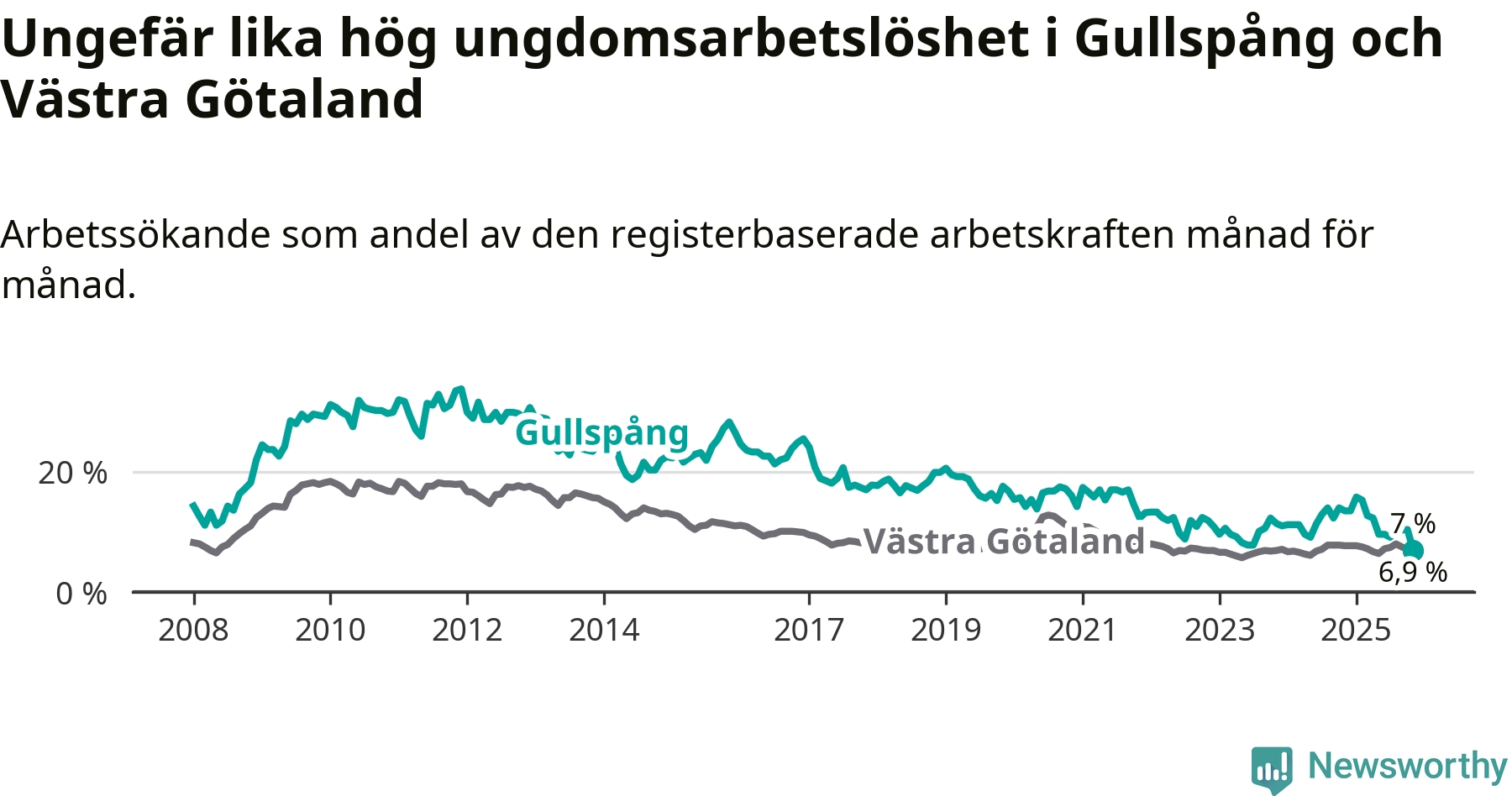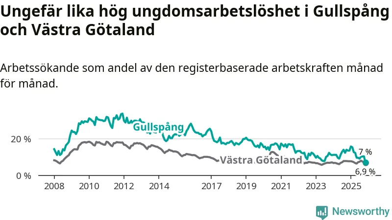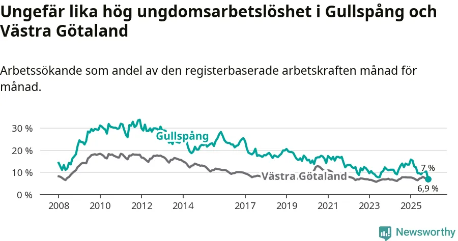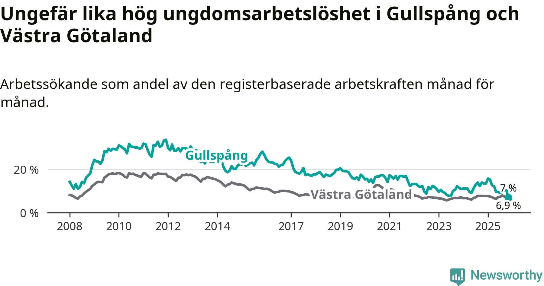 Medan Gullspång har högre total arbetslöshet än Västra Götaland, ligger ungdomsarbetslösheten på i stort sett samma nivå.