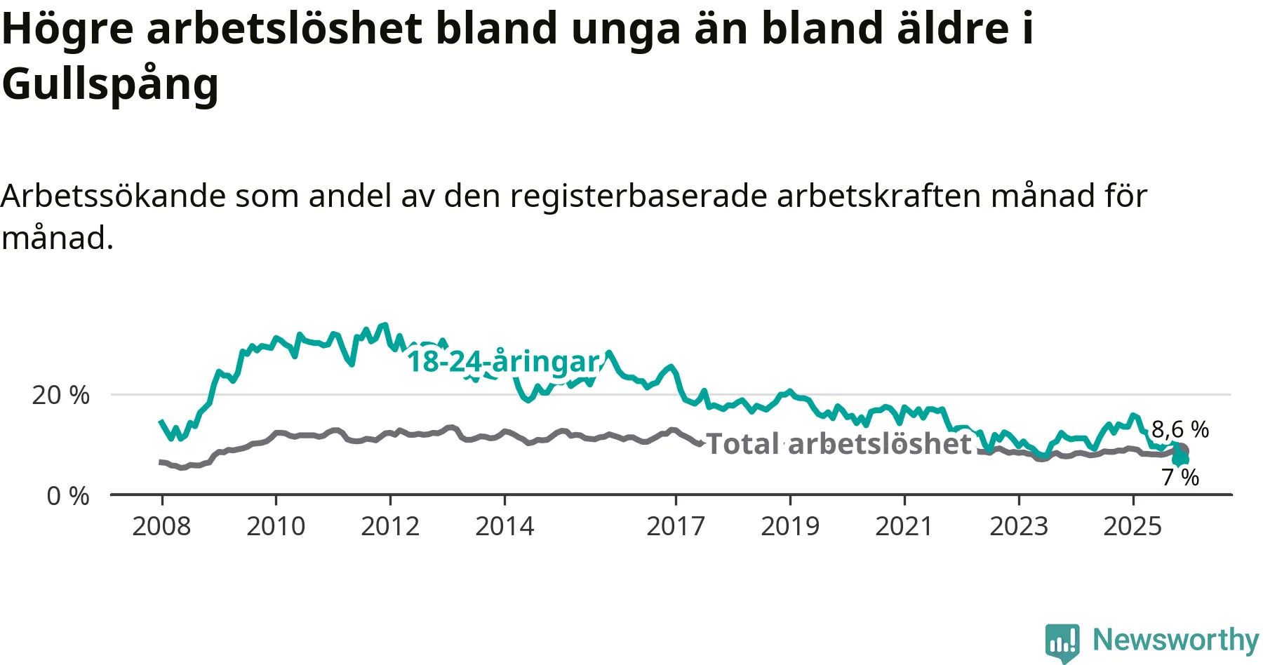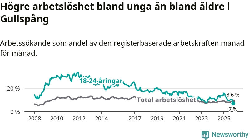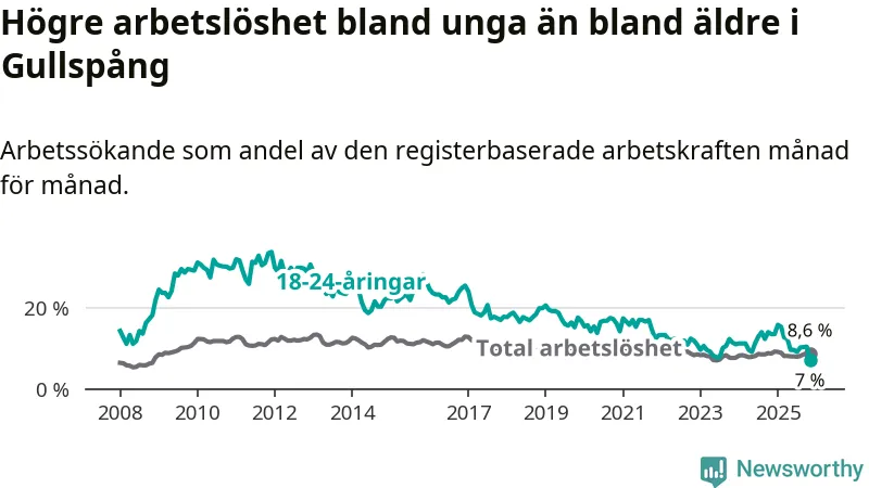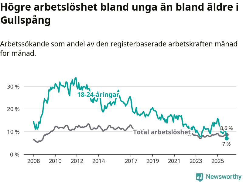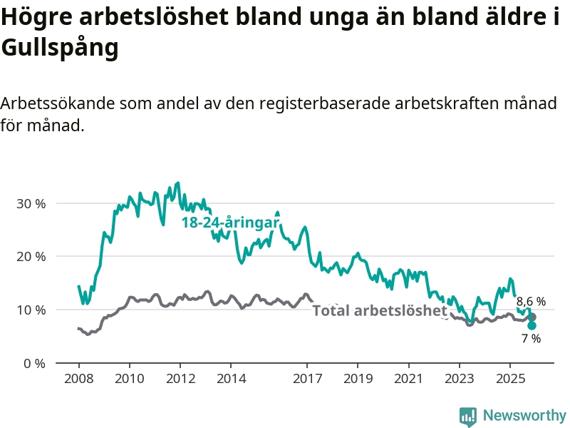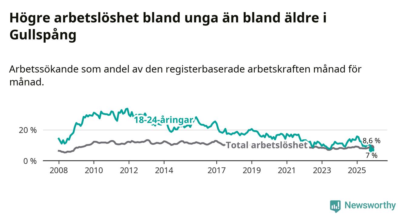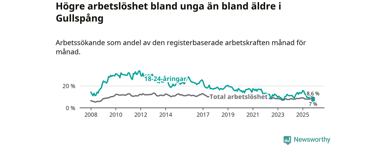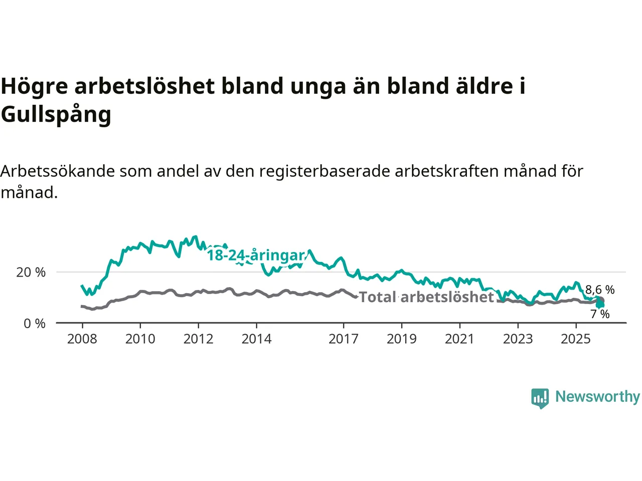 Medan Gullspång har högre total arbetslöshet än Västra Götaland, ligger ungdomsarbetslösheten på i stort sett samma nivå.