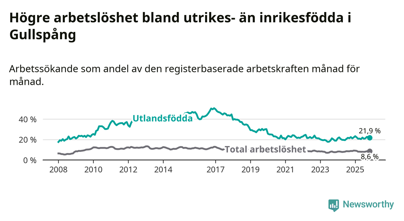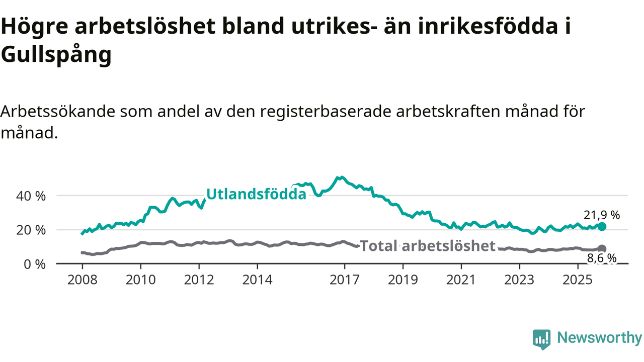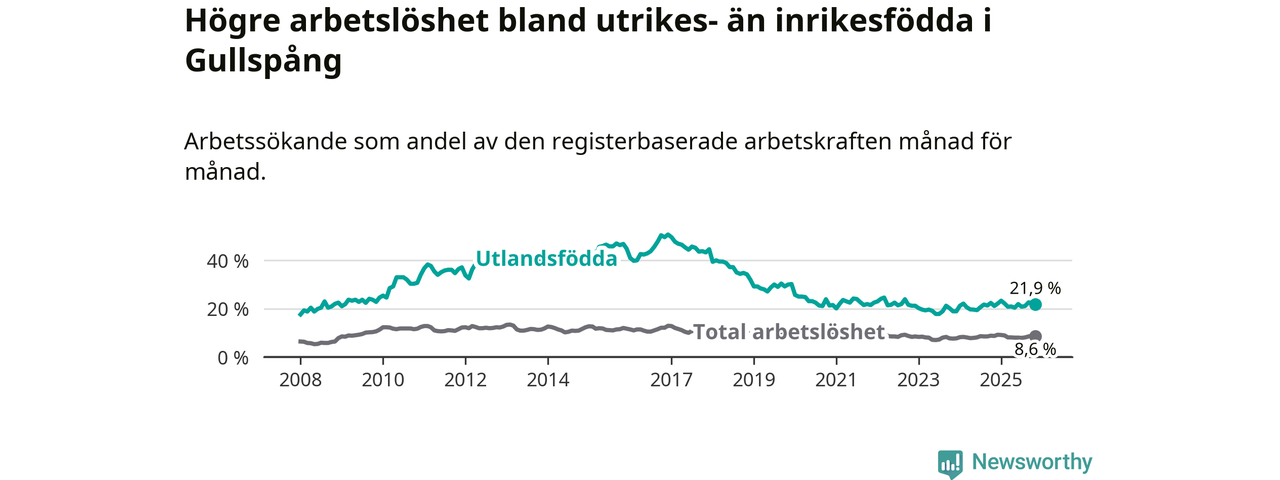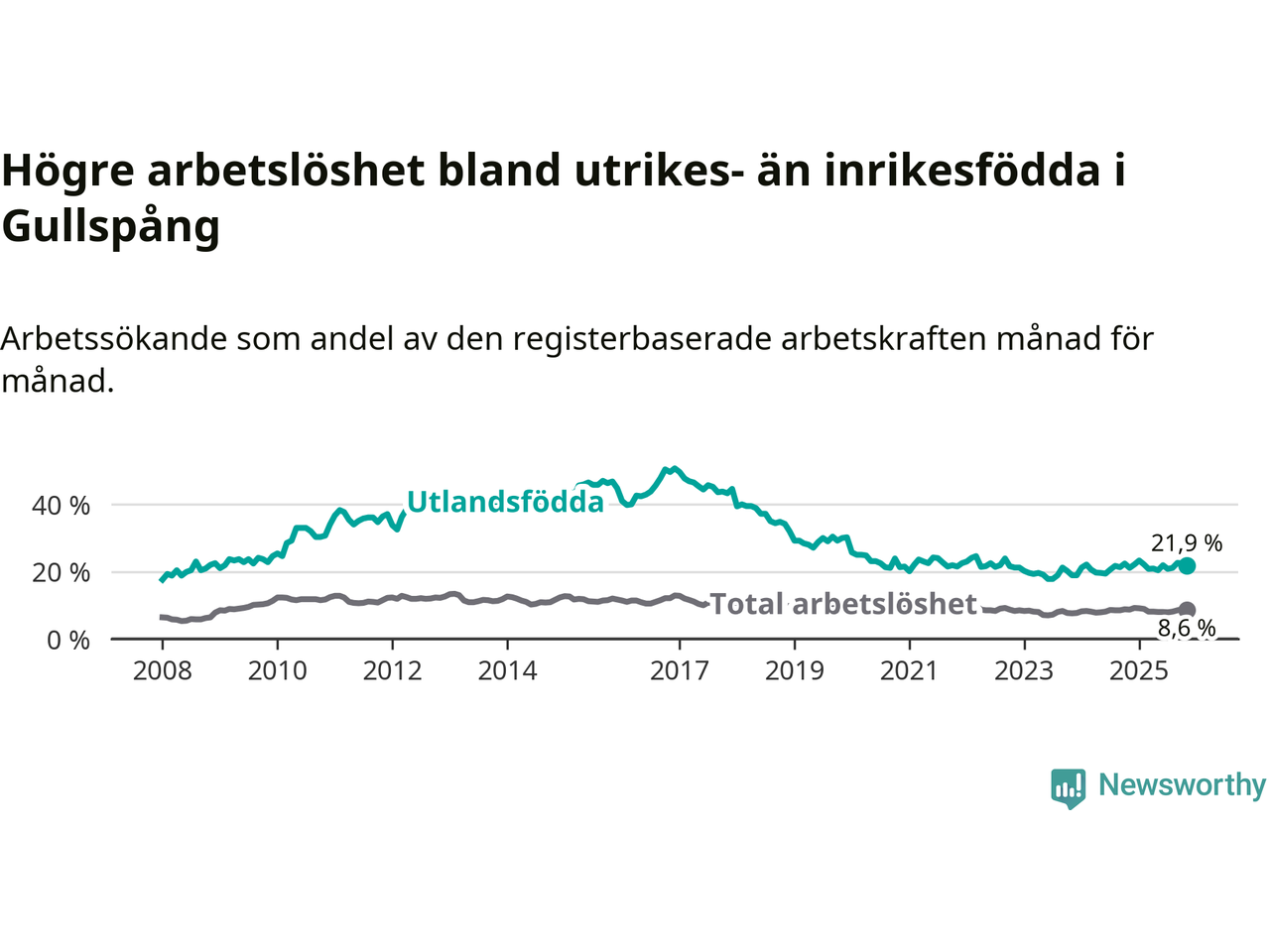 Arbetslösheten bland utlandsfödda var 21,9 procent i Gullspång under november månad, motsvarande 81 av 370 personer. Det är 0,8 procentenheter fler än vid samma tidpunkt i fjol (+1 om man räknar personer). Den senaste månadens uppgång innebär ett trendbrott. Under de ett föregående månaderna hade arbetslösheten bland utlandsfödda varit lägre än motsvarande tidpunkt året innan.