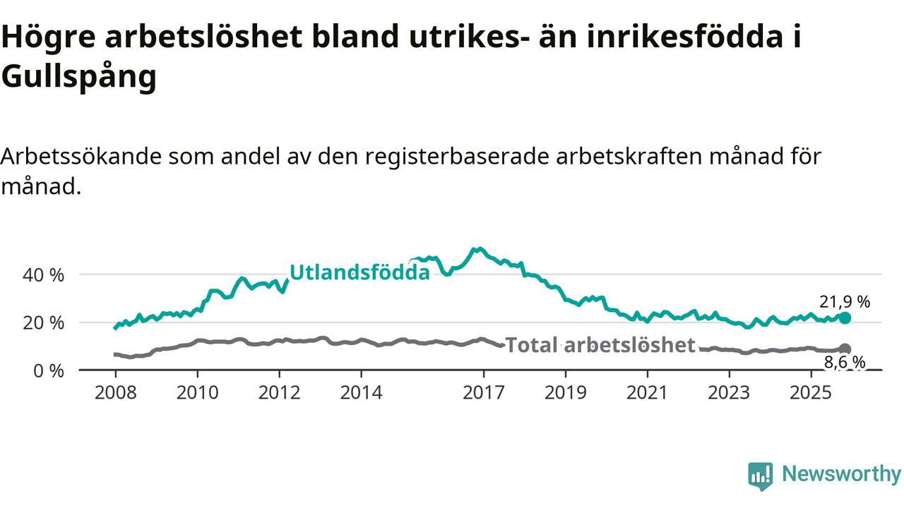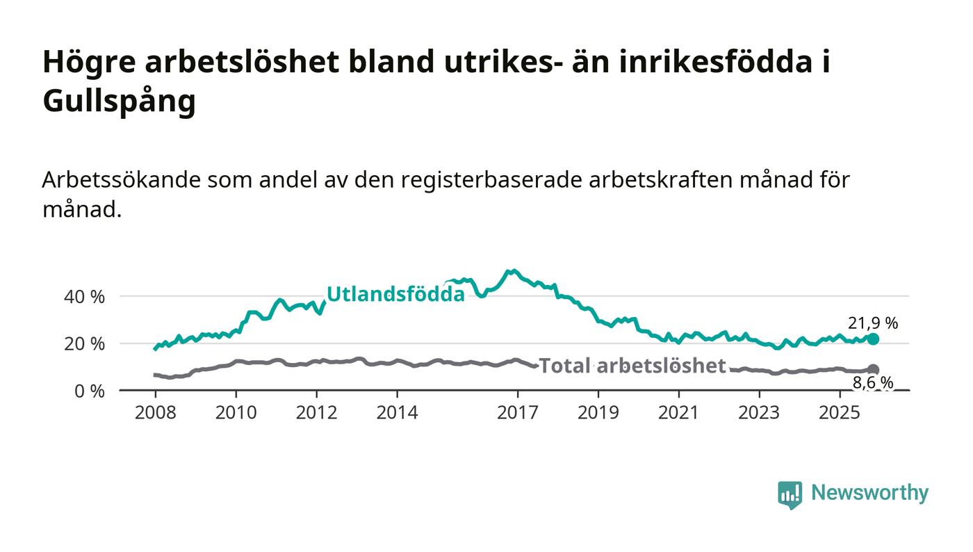 Skillnaden i arbetslöshet mellan utrikesfödda och hela befolkningen är 13,3 procentenheter i Gullspång. Det är en större skillnad än för ett år sedan (+0,9 procentenheter).