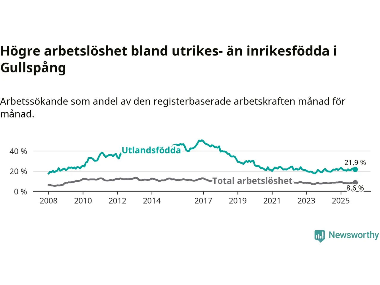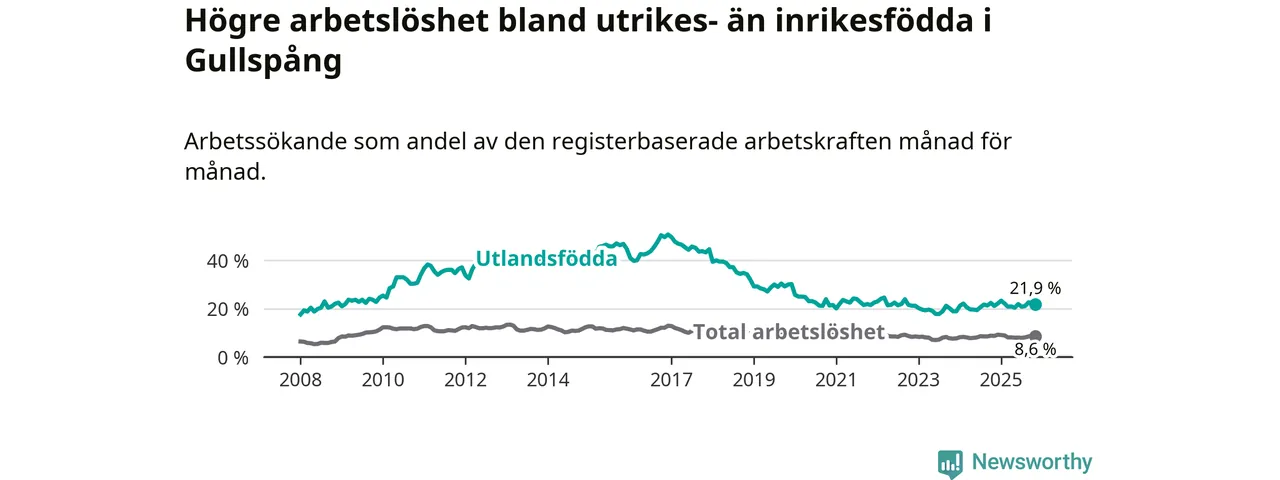 Den senaste månadsstatistiken från Arbetsförmedlingen visar på en uppgång i arbetslöshet bland utlandsfödda i Gullspångs kommun med 0,8 procentenheter. Arbetslösheten bland invånare födda i ett annat land låg i november på 21,9 procent.
