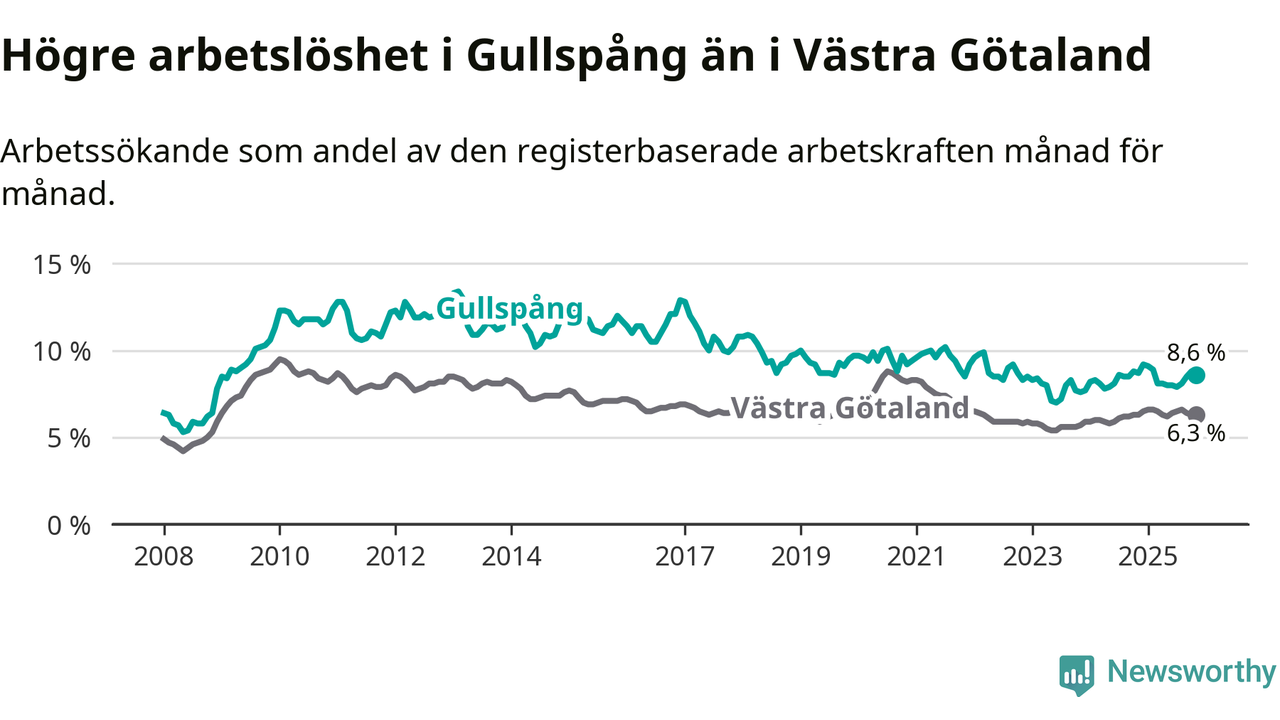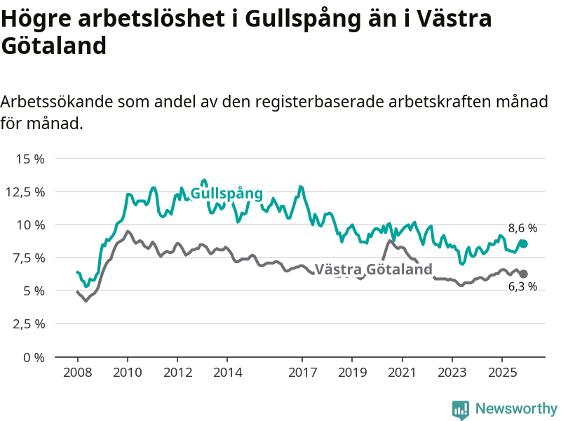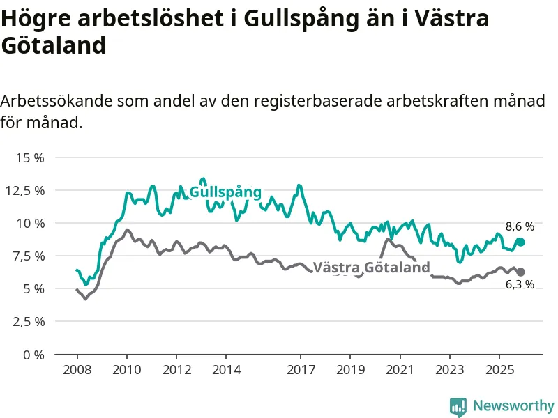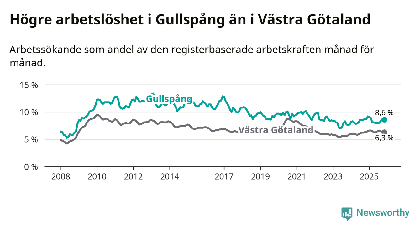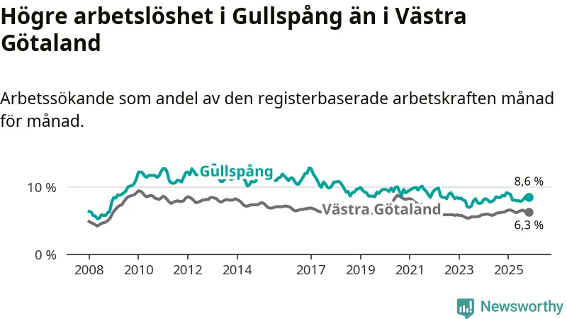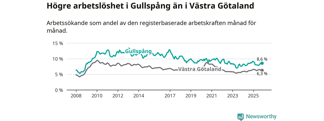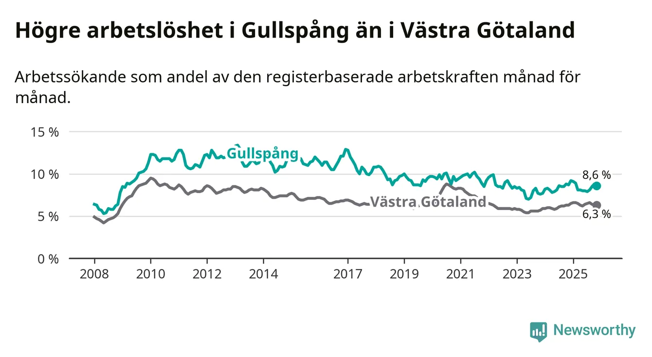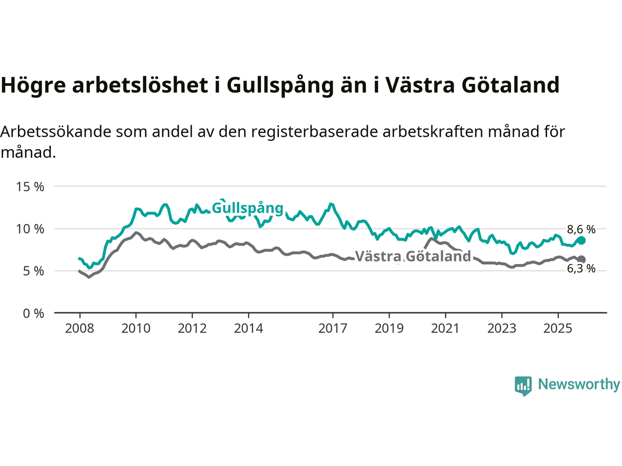 Under november månad rapporterade Gullspångs kommun en total arbetslöshet på 8,6 procent. Det är en minskning jämfört med samma tidpunkt i fjol (−0,1 procentenheter). I Västra Götalands län däremot står arbetslösheten stilla.