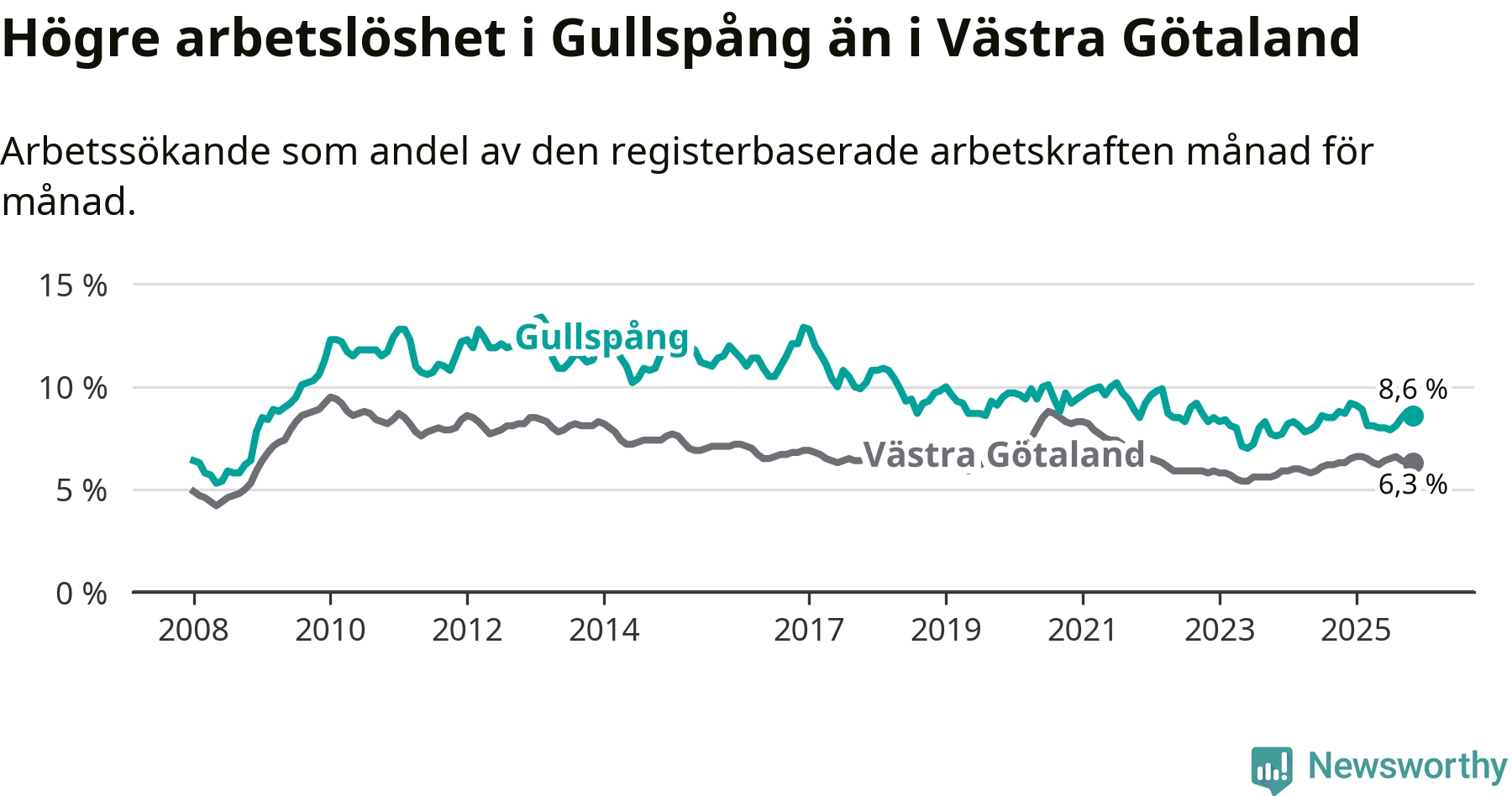 Även om arbetslösheten i Gullspång alltså minskar, så ligger den fortfarande över snittet i hela Västra Götalands län (8,6 procent i kommunen, jämfört med 6,3 procent i hela länet). Gullspång har därmed även den högsta arbetslöshetsnivån i länet. Öckerö har den lägsta (2,9 procent). För att Gullspång skulle komma ner i samma arbetslöshetsnivå som Öckerö skulle 114 personer behöva sysselsättas.