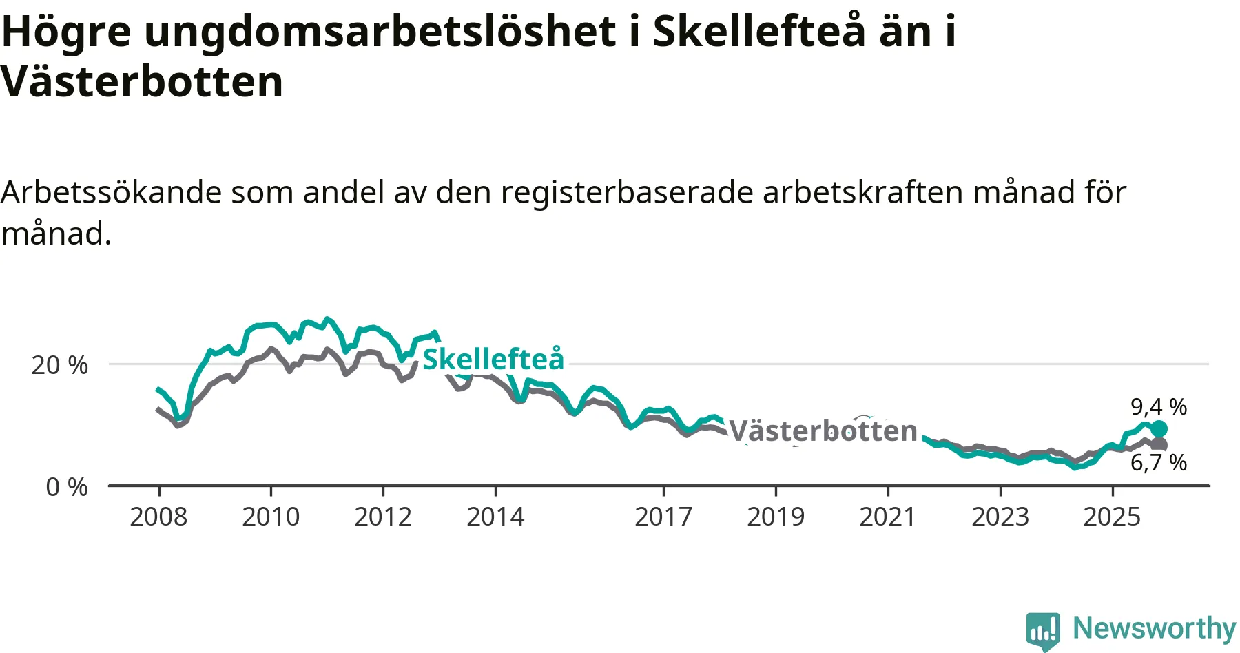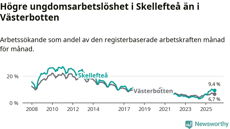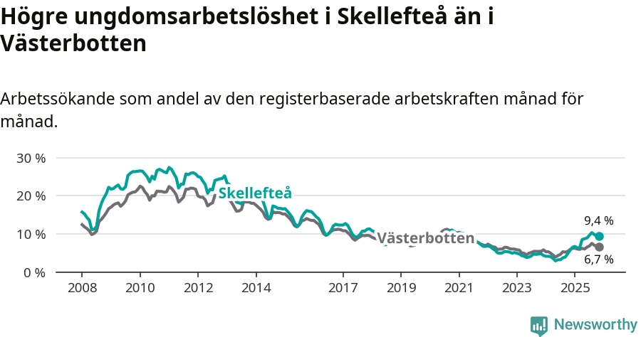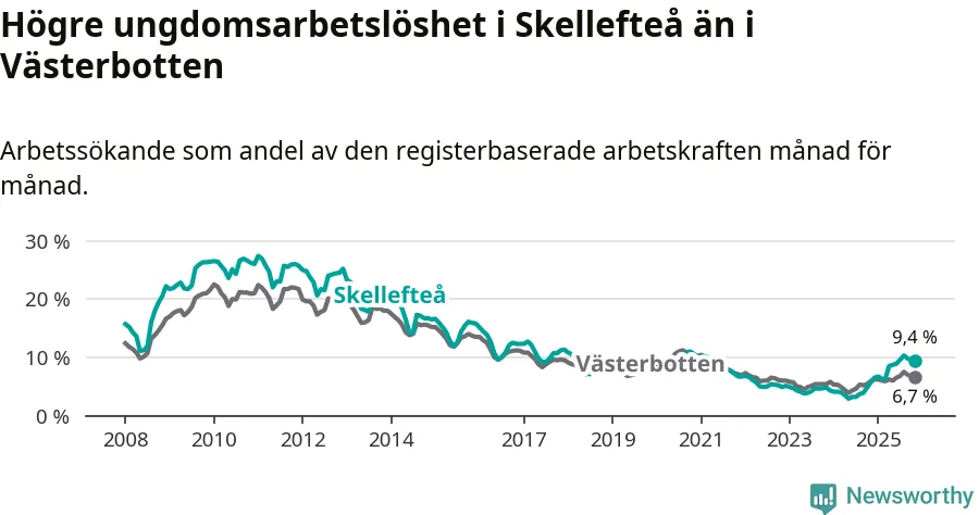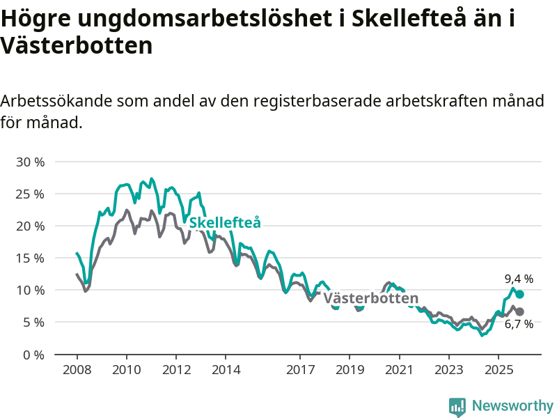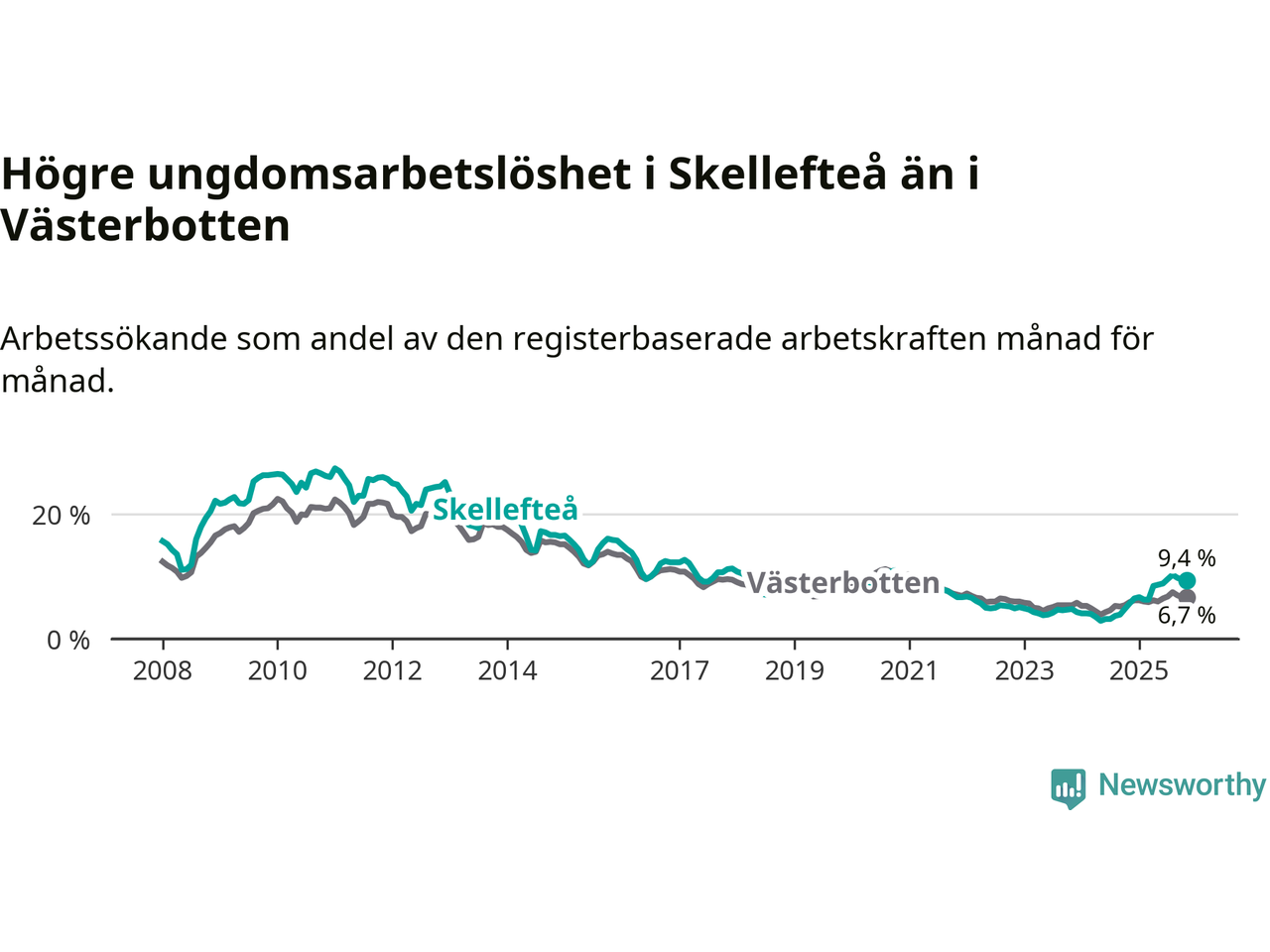 Precis som den totala arbetslösheten ligger ungdomsarbetslösheten i Skellefteå högre än i Västerbotten som helhet. Skillnaden mellan kommunen och länet är 2,7 procentenheter.