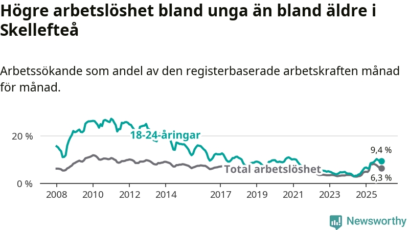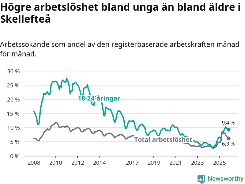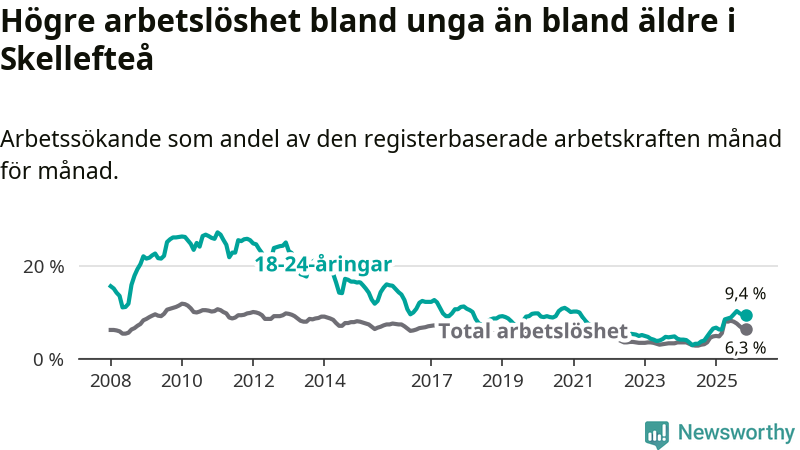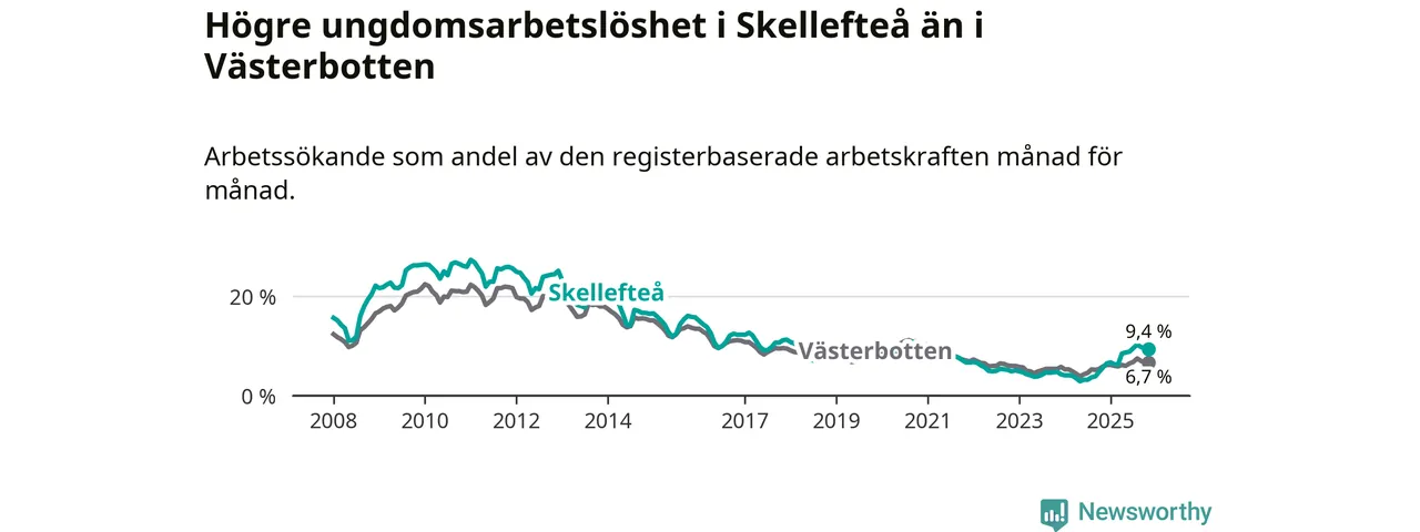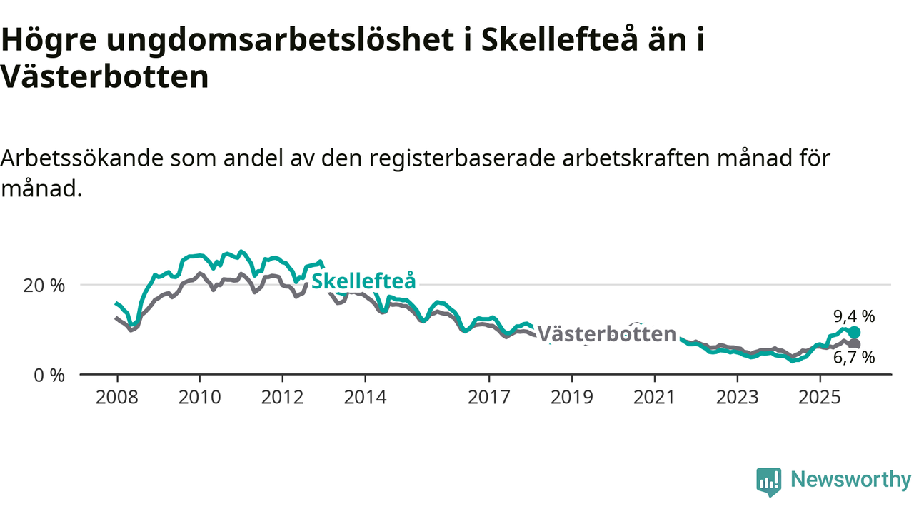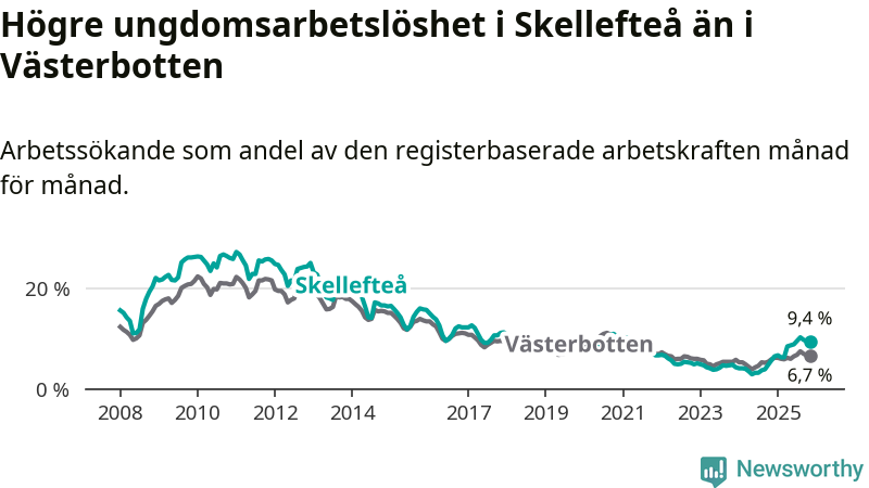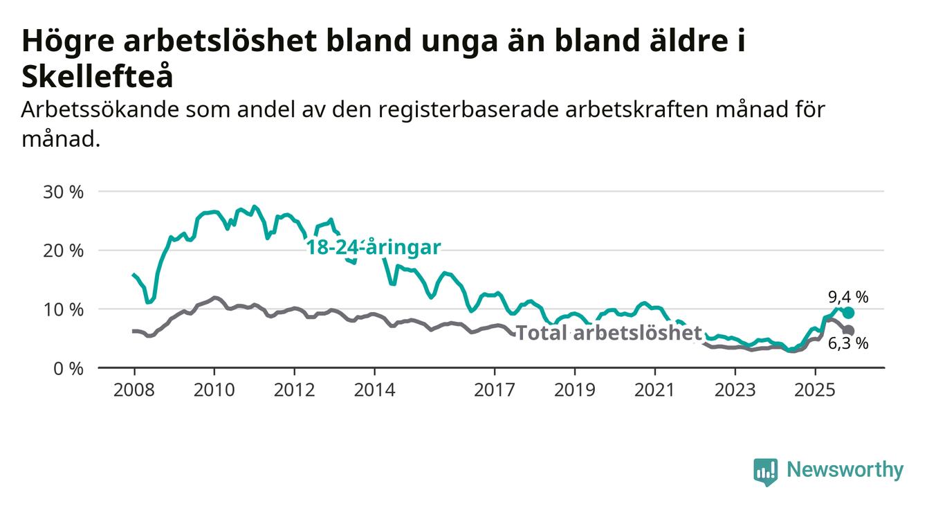 Precis som den totala arbetslösheten ligger ungdomsarbetslösheten i Skellefteå högre än i Västerbotten som helhet. Skillnaden mellan kommunen och länet är 2,7 procentenheter.