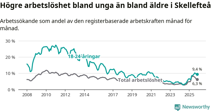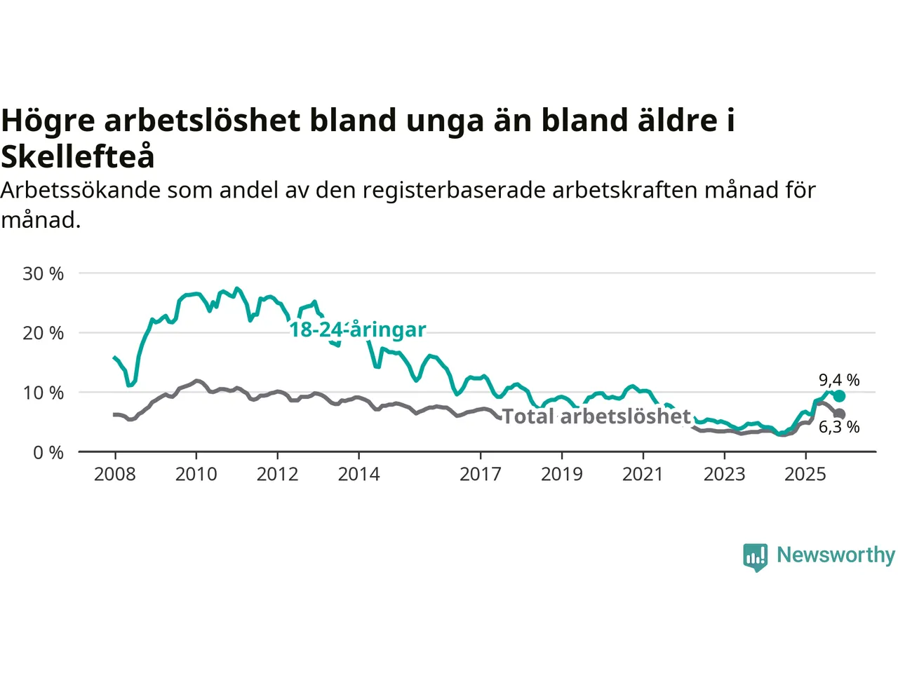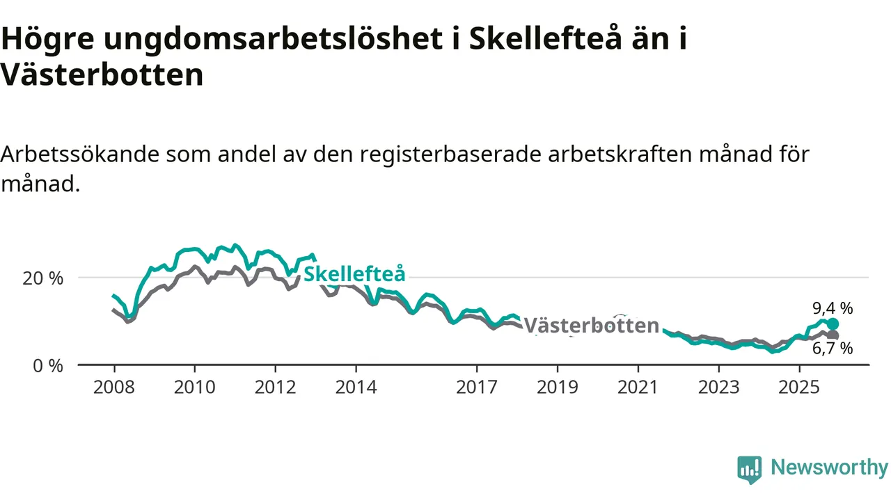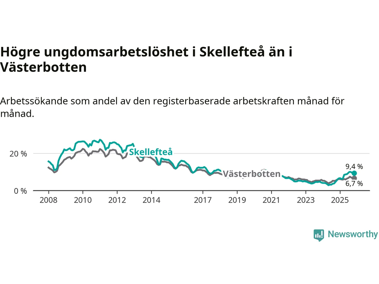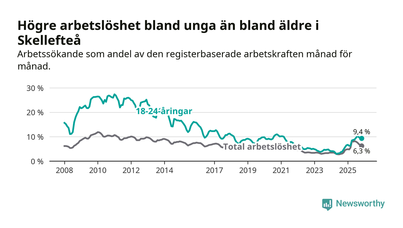 I och med den senaste månadens uppgång har de ungas arbetslöshet i Skellefteå stigit 14 månader i följd (upp från 3,9 procent i september 2024 till 9,4 procent nu).