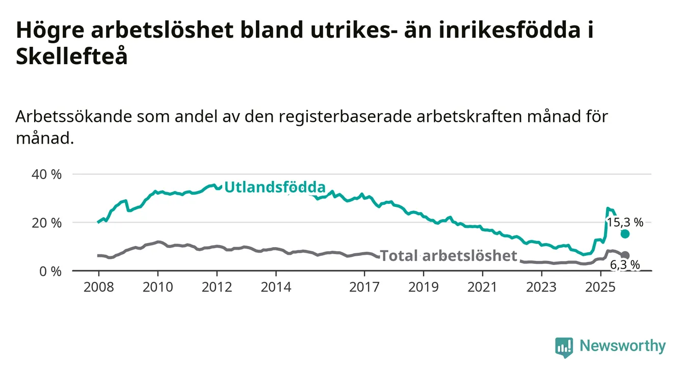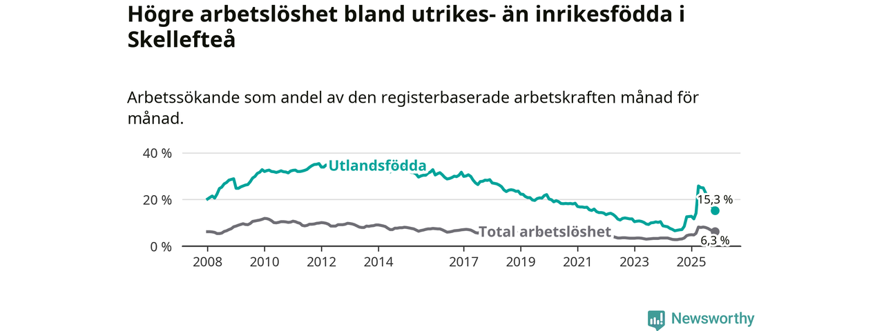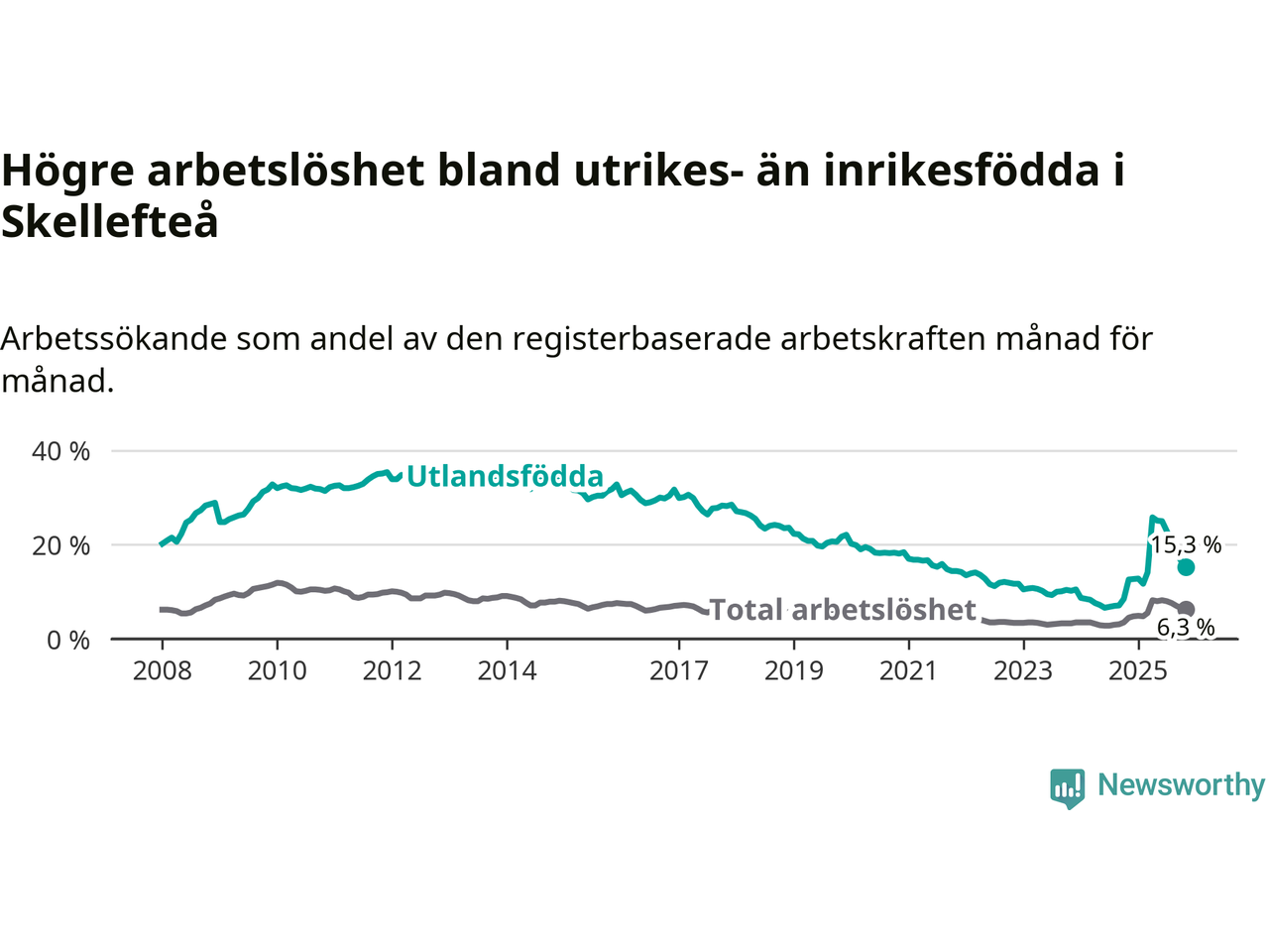 Arbetslösheten bland utlandsfödda var 15,3 procent i Skellefteå under november månad, motsvarande 1 132 av 7 399 personer. Det är 2,7 procentenheter fler än vid samma tidpunkt i fjol (+272 om man räknar personer). Därmed är de utlandsföddas arbetslöshet högre än vid samma tidpunkt i fjol för 13:e månaden i följd. Sedan oktober 2024 har arbetslösheten bland utlandsfödda ökat från 8,5 till 15,3 procent.