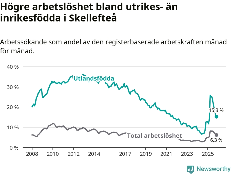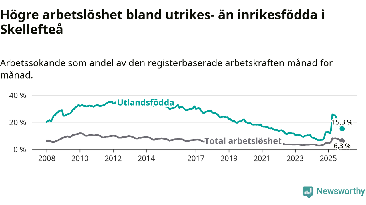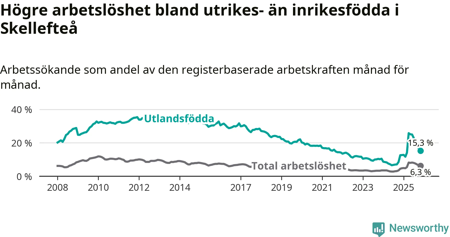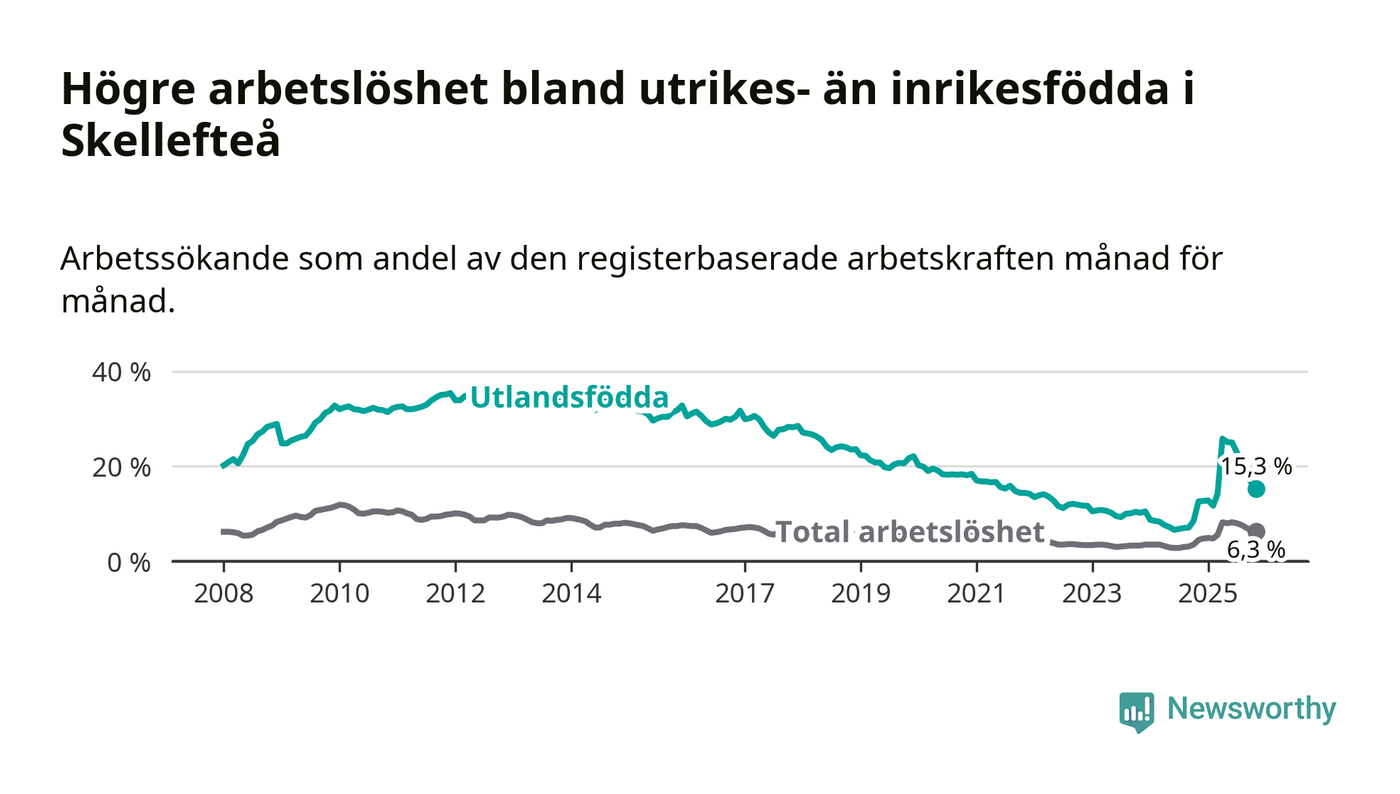 Arbetslösheten bland utlandsfödda var 15,3 procent i Skellefteå under november månad, motsvarande 1 132 av 7 399 personer. Det är 2,7 procentenheter fler än vid samma tidpunkt i fjol (+272 om man räknar personer). Därmed är de utlandsföddas arbetslöshet högre än vid samma tidpunkt i fjol för 13:e månaden i följd. Sedan oktober 2024 har arbetslösheten bland utlandsfödda ökat från 8,5 till 15,3 procent.