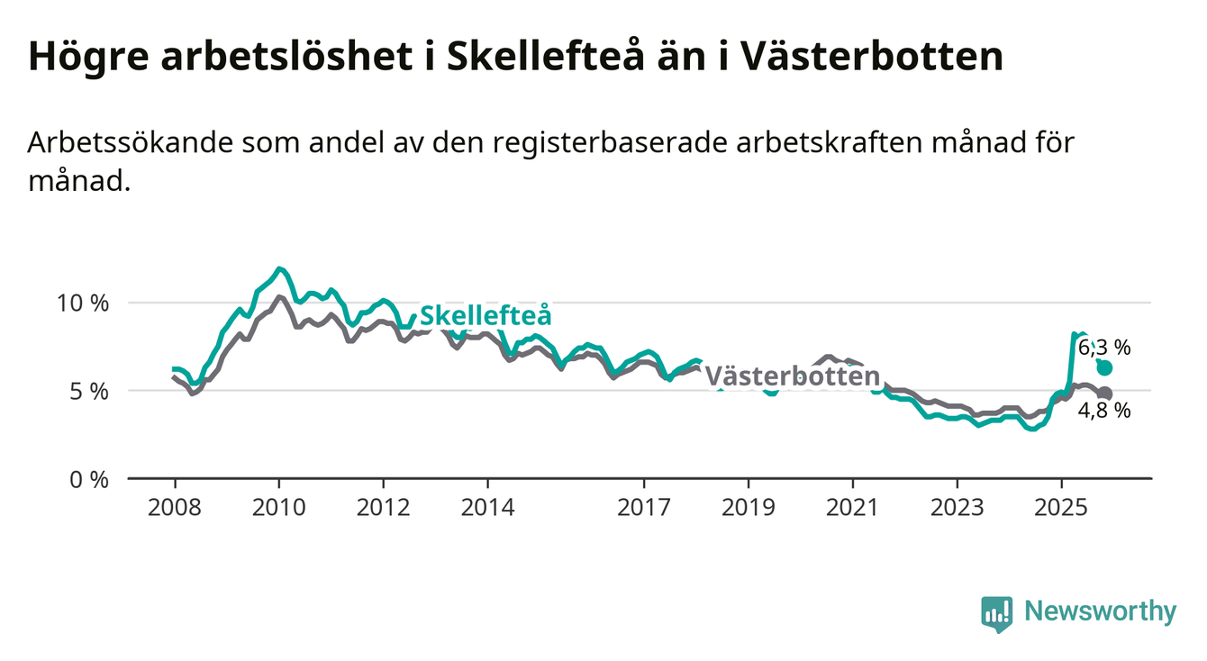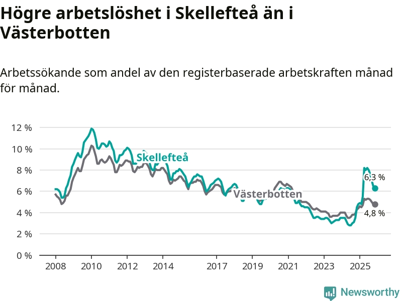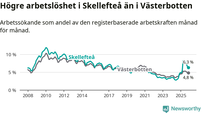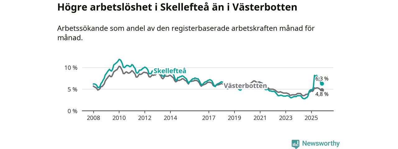 Det är 14:e månaden i följd som arbetslösheten i Skellefteå är högre än den var under samma tidpunkt året innan. Sedan september 2024 har arbetslösheten gått upp från 3,1 till 6,3 procent.