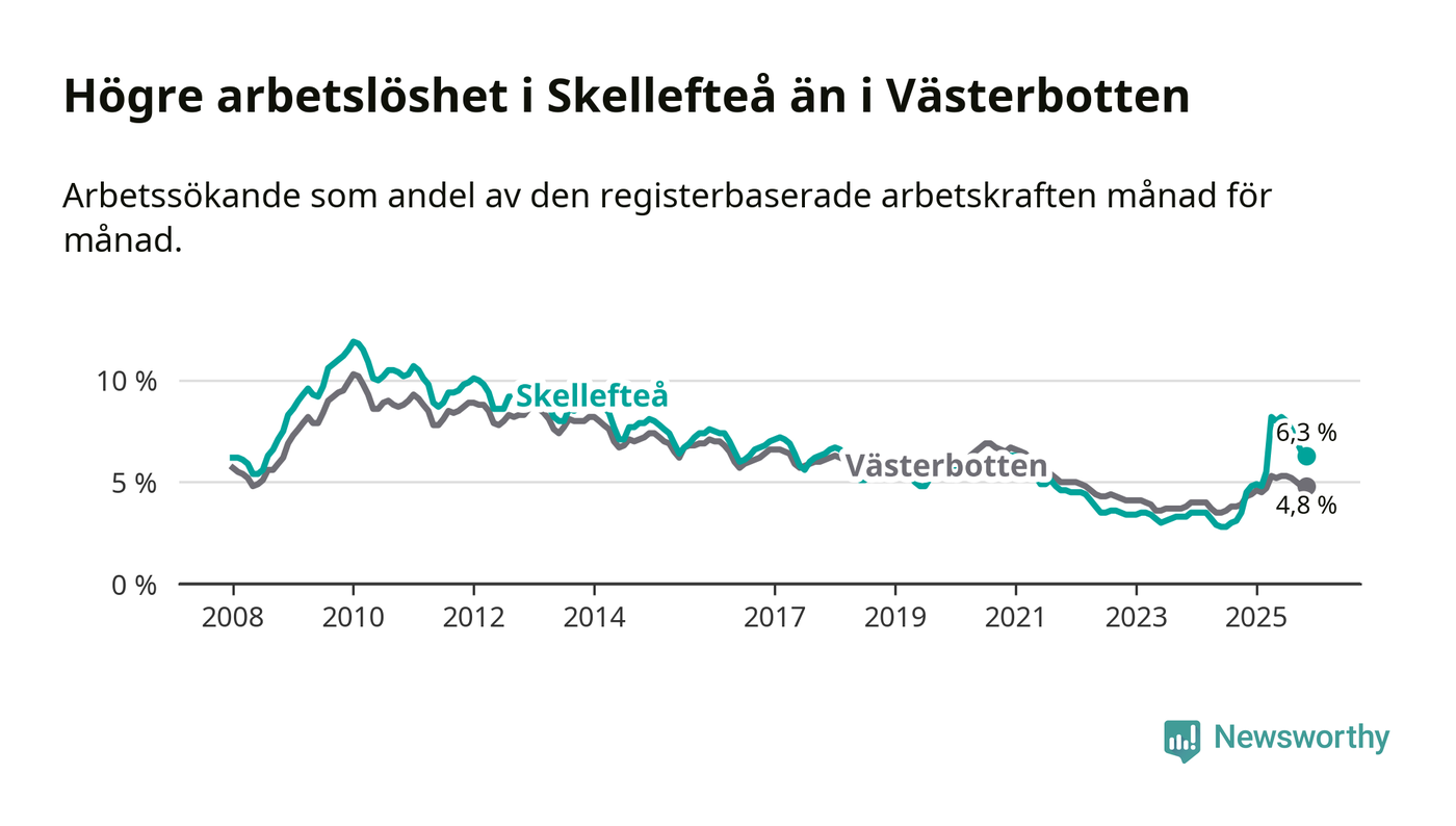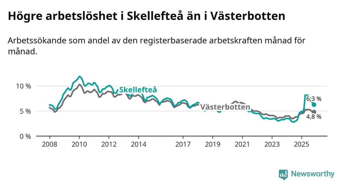 Skellefteå hade redan tidigare högre arbetslöshet än snittet i hela Västerbottens län och nu växer klyftan (6,3 procent i kommunen, jämfört med 4,8 procent i hela länet). Skellefteå har därmed även den högsta arbetslöshetsnivån i länet. Sorsele har den lägsta (2,4 procent). För att Skellefteå skulle komma ner i samma arbetslöshetsnivå som Sorsele skulle 1 533 personer behöva sysselsättas.