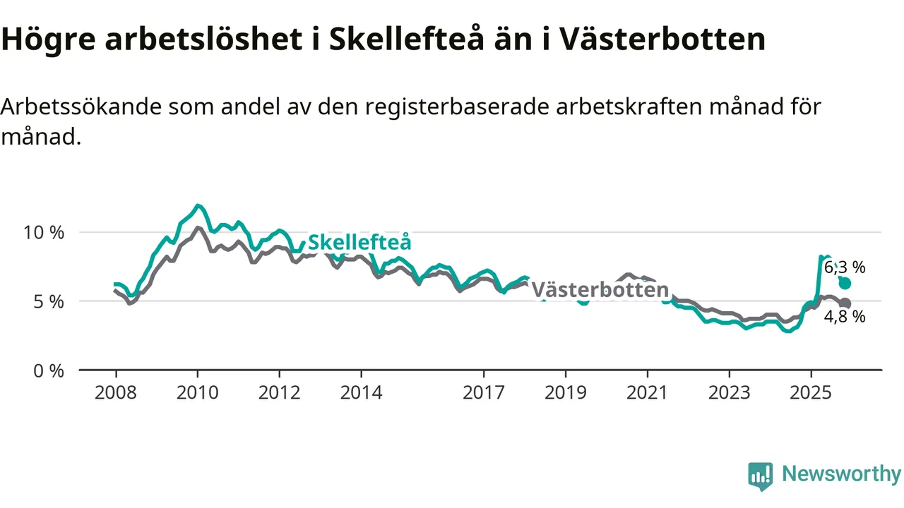 Under november månad rapporterade Skellefteå kommun en total arbetslöshet på 6,3 procent. Det är en ökning jämfört med samma tidpunkt i fjol (+1,8 procentenheter). Även i Västerbottens län stiger arbetslösheten .