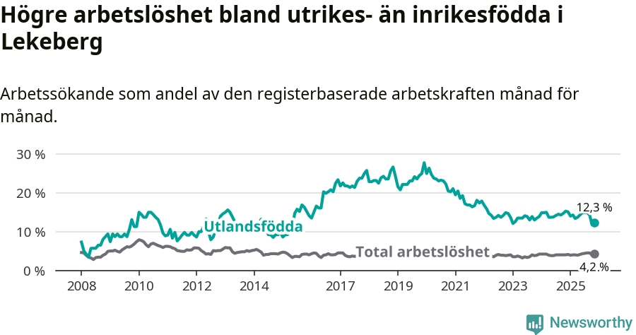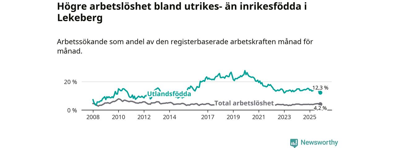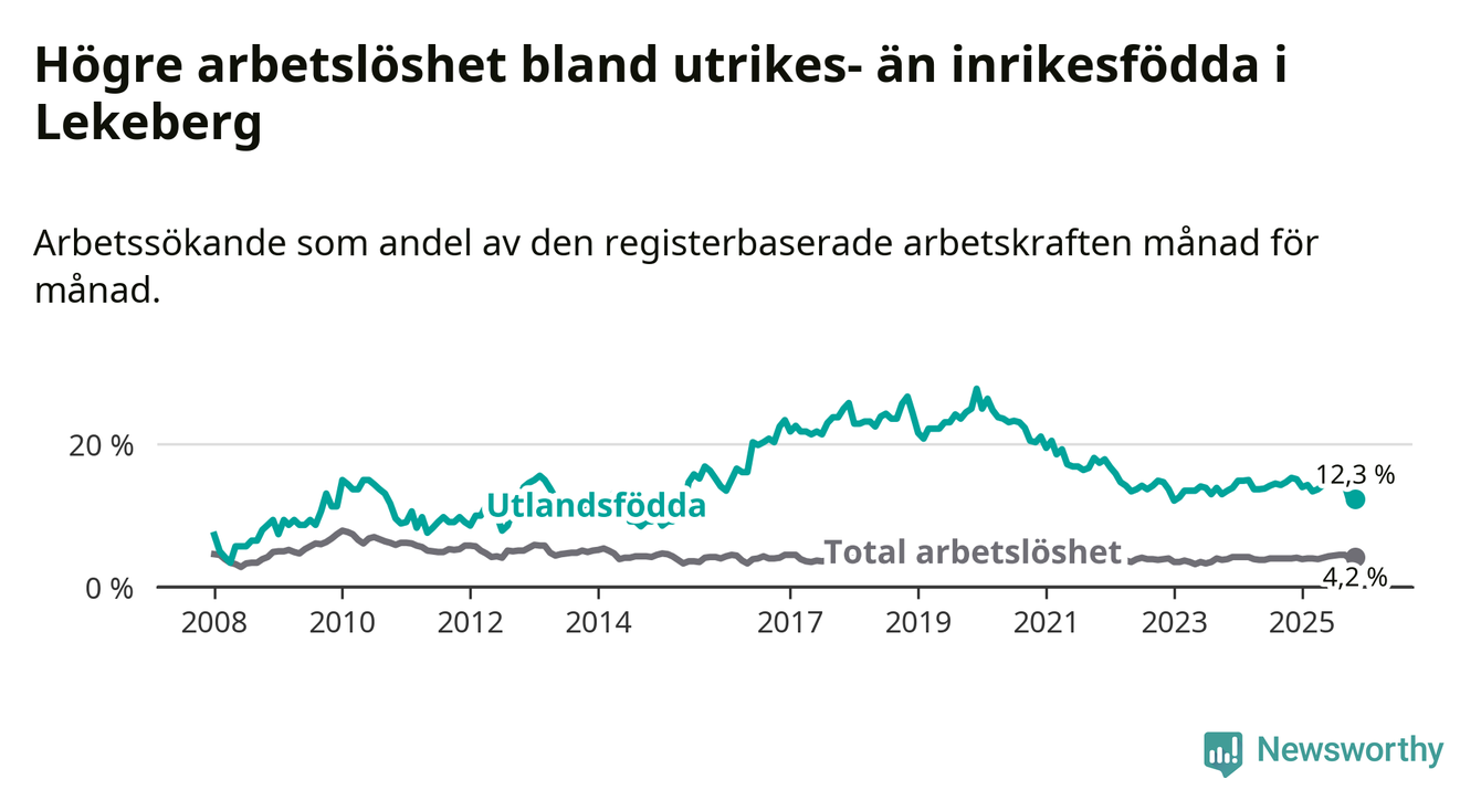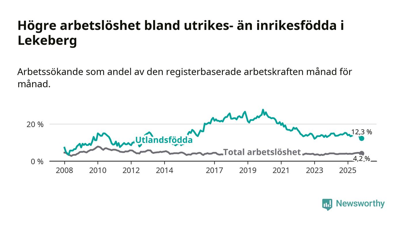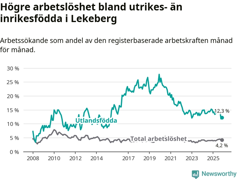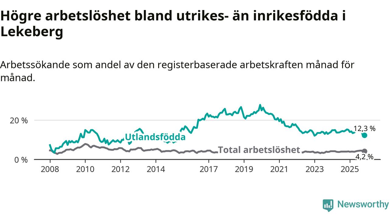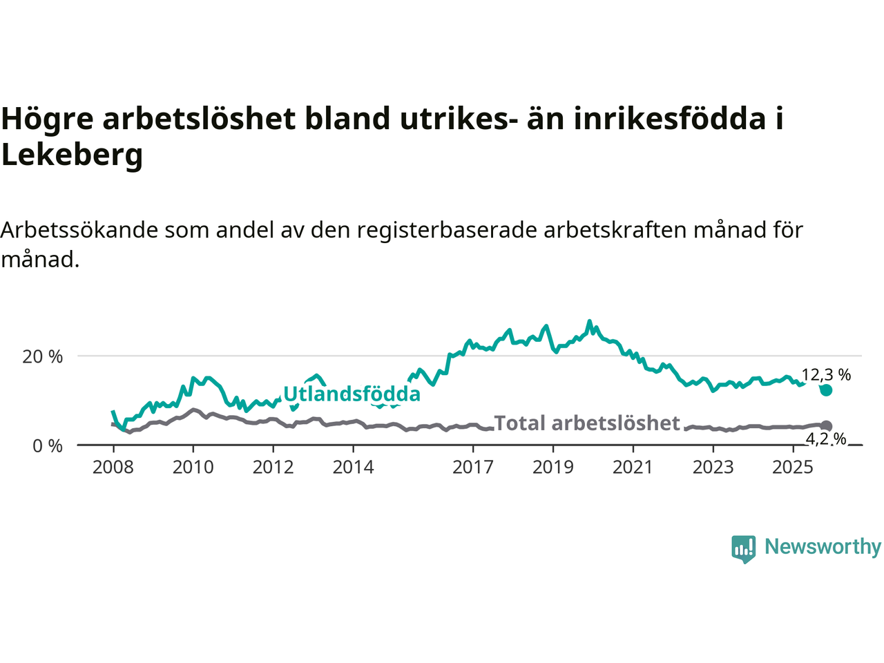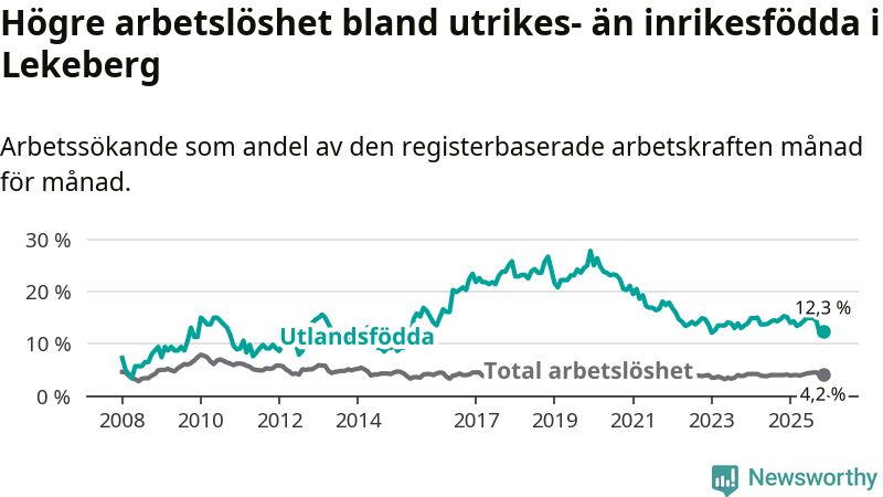 Arbetslösheten bland utlandsfödda var 12,3 procent i Lekeberg under november månad, motsvarande 43 av 350 personer. Det är 3,0 procentenheter färre än vid samma tidpunkt i fjol (−11 om man räknar personer).