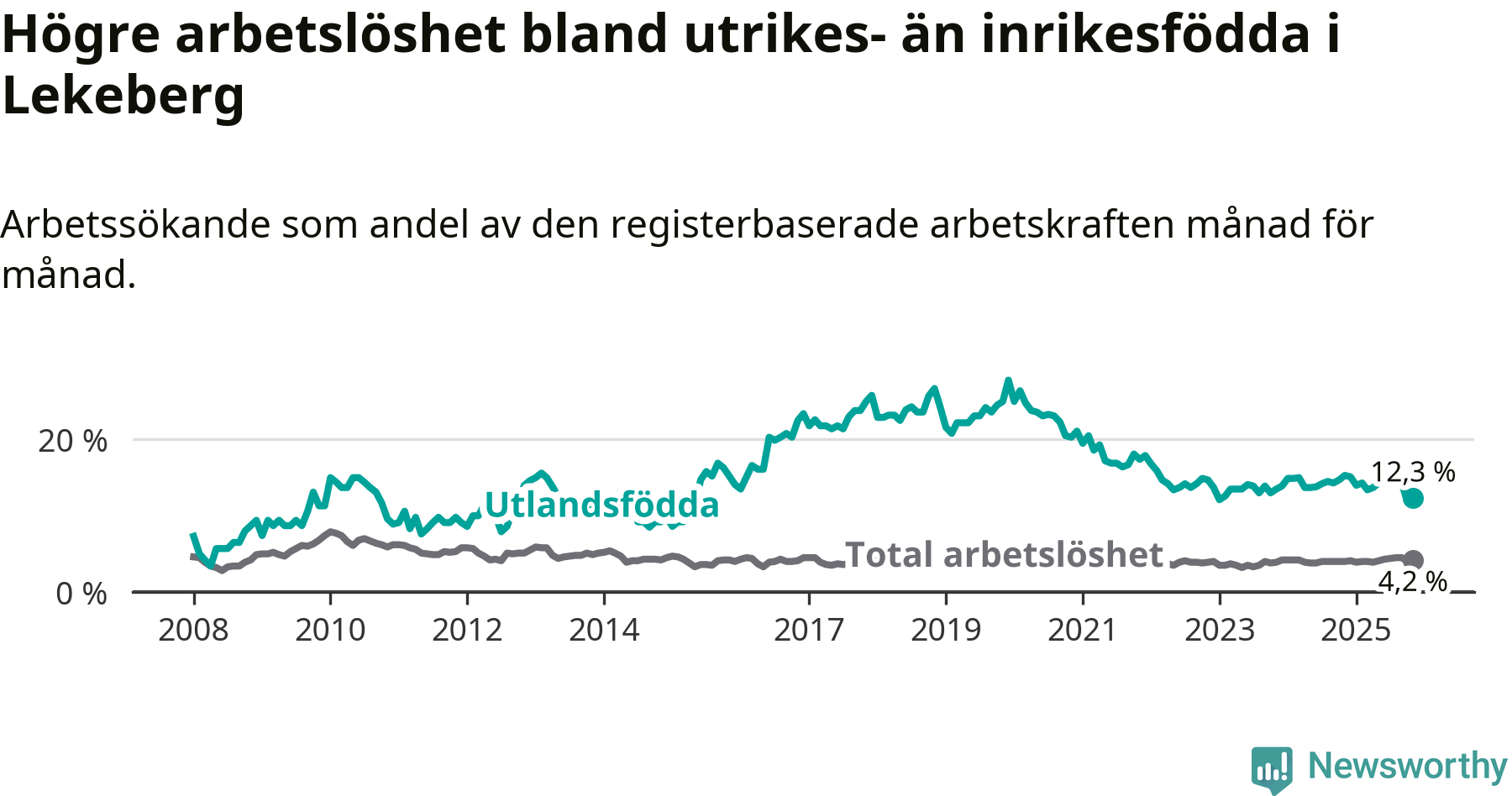 Skillnaden i arbetslöshet mellan utrikesfödda och hela befolkningen är 8,1 procentenheter i Lekeberg. Det är en betydligt mindre skillnad än för ett år sedan (−3,2 procentenheter).