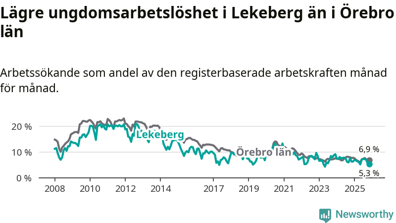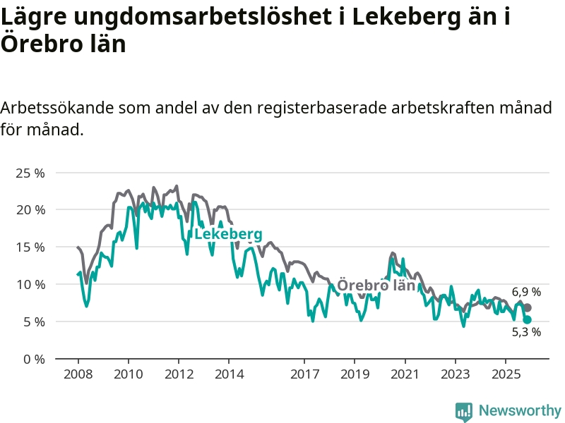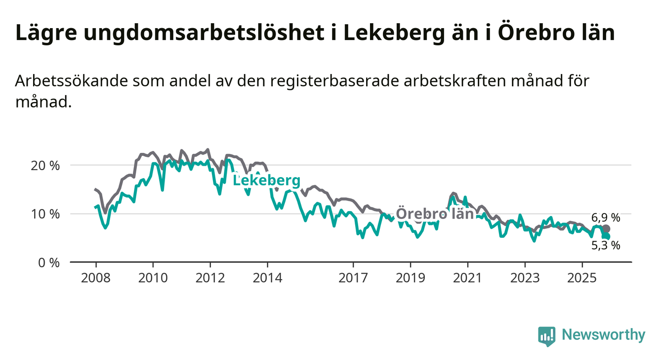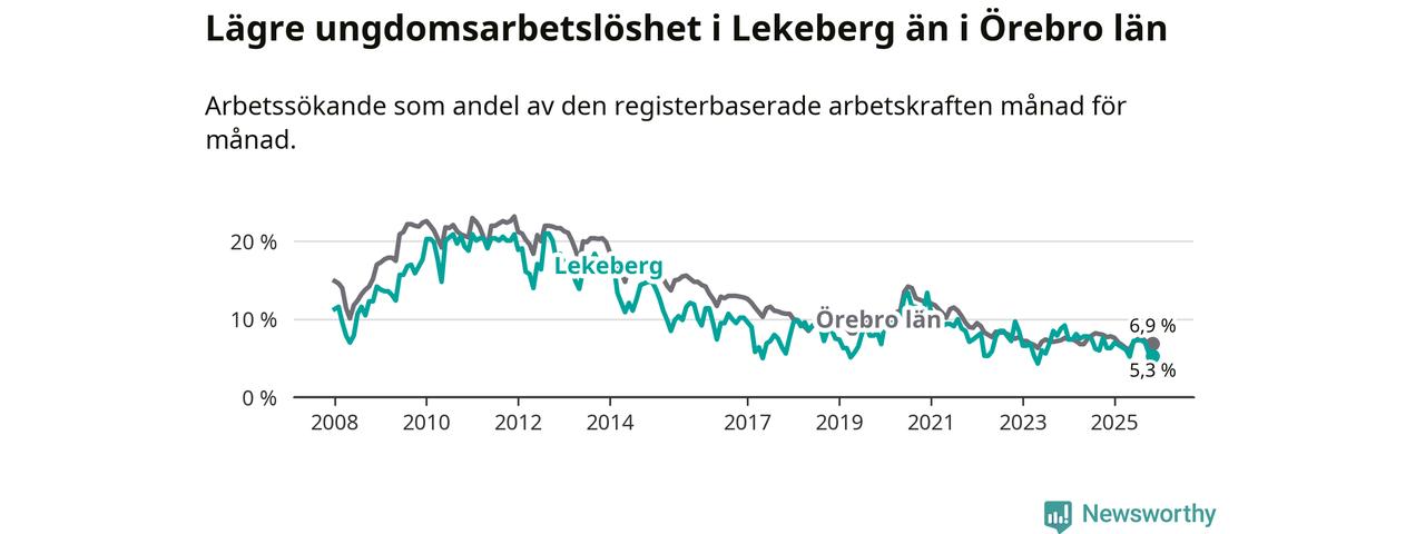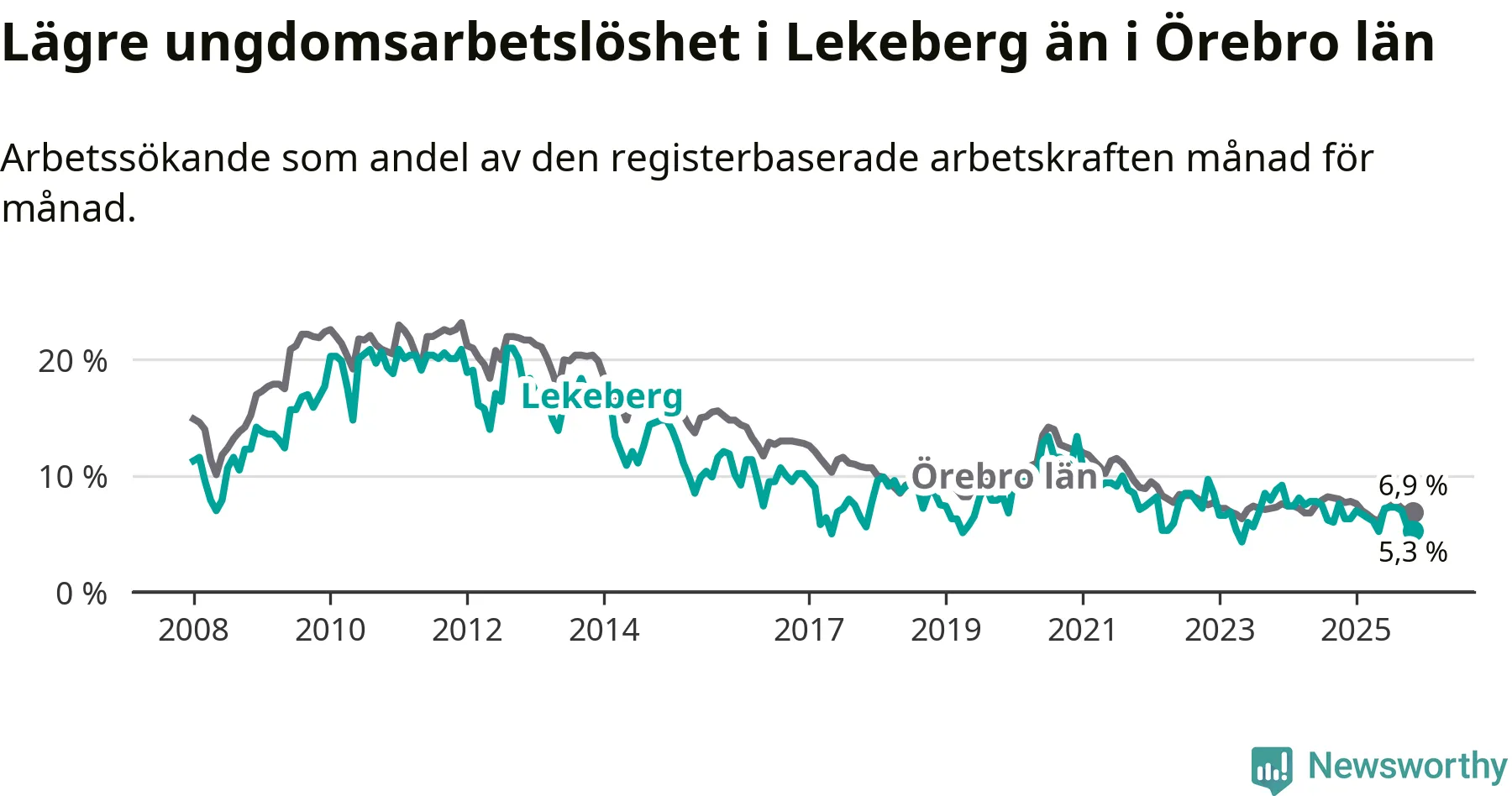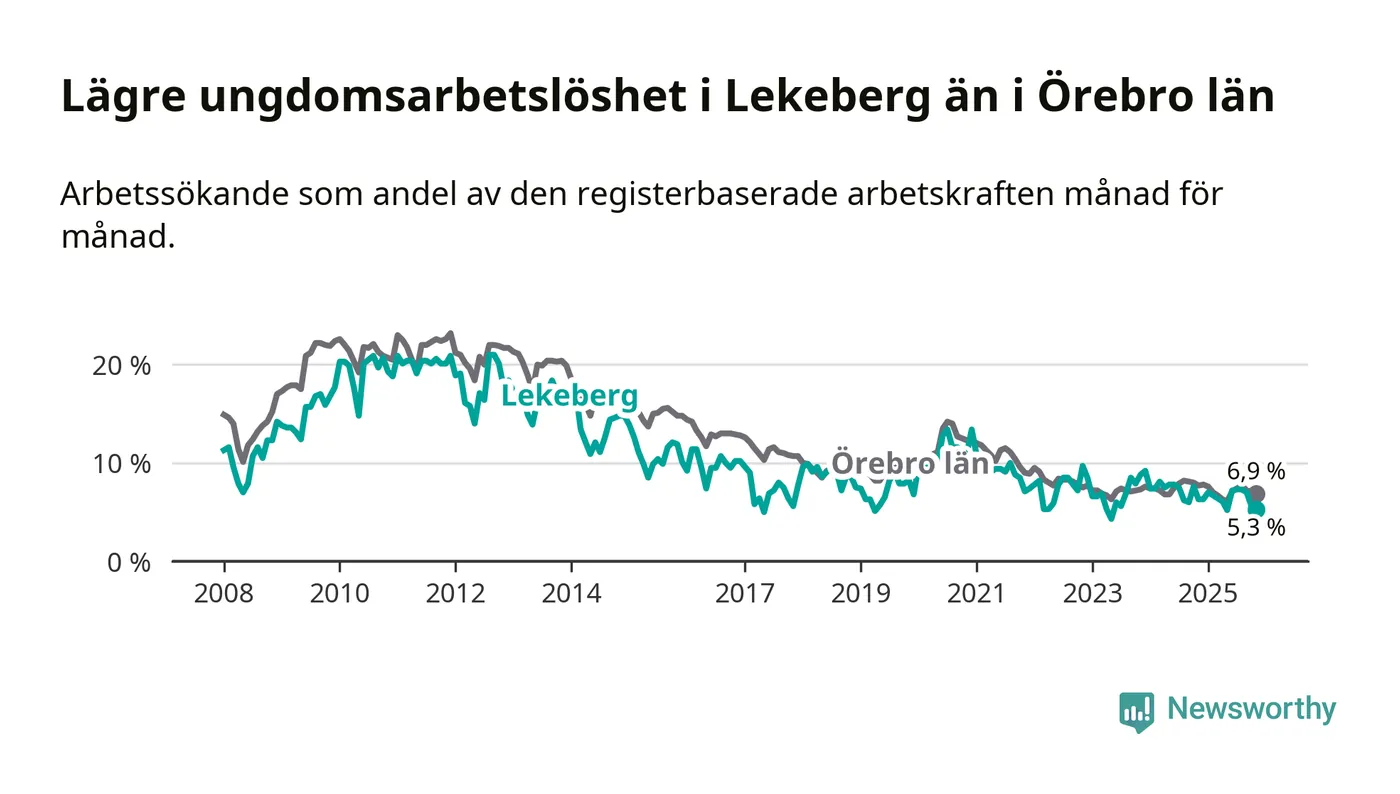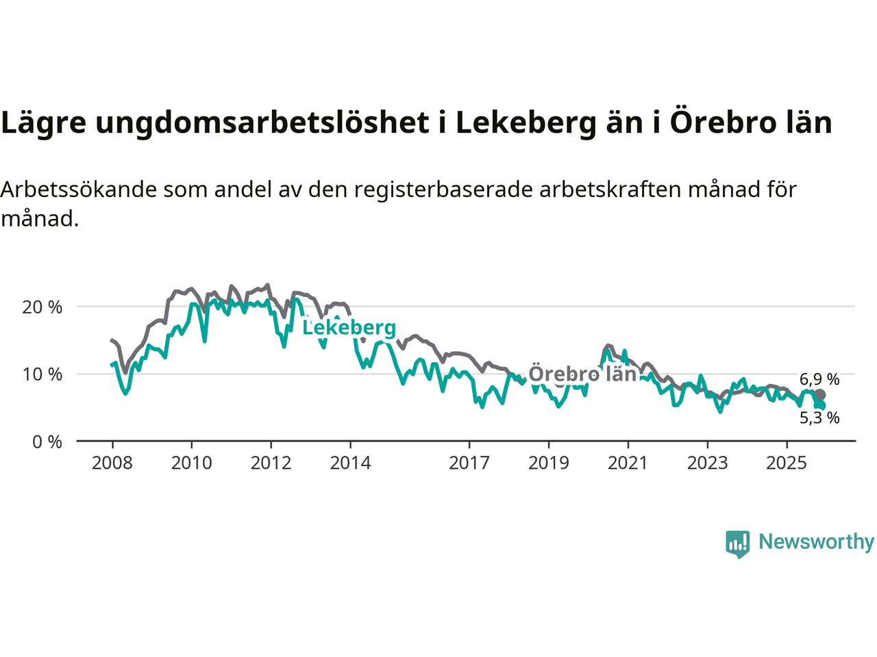 Precis som den totala arbetslösheten ligger ungdomsarbetslösheten i Lekeberg lägre än i Örebro som helhet. Skillnaden mellan kommunen och länet är 1,6 procentenheter.